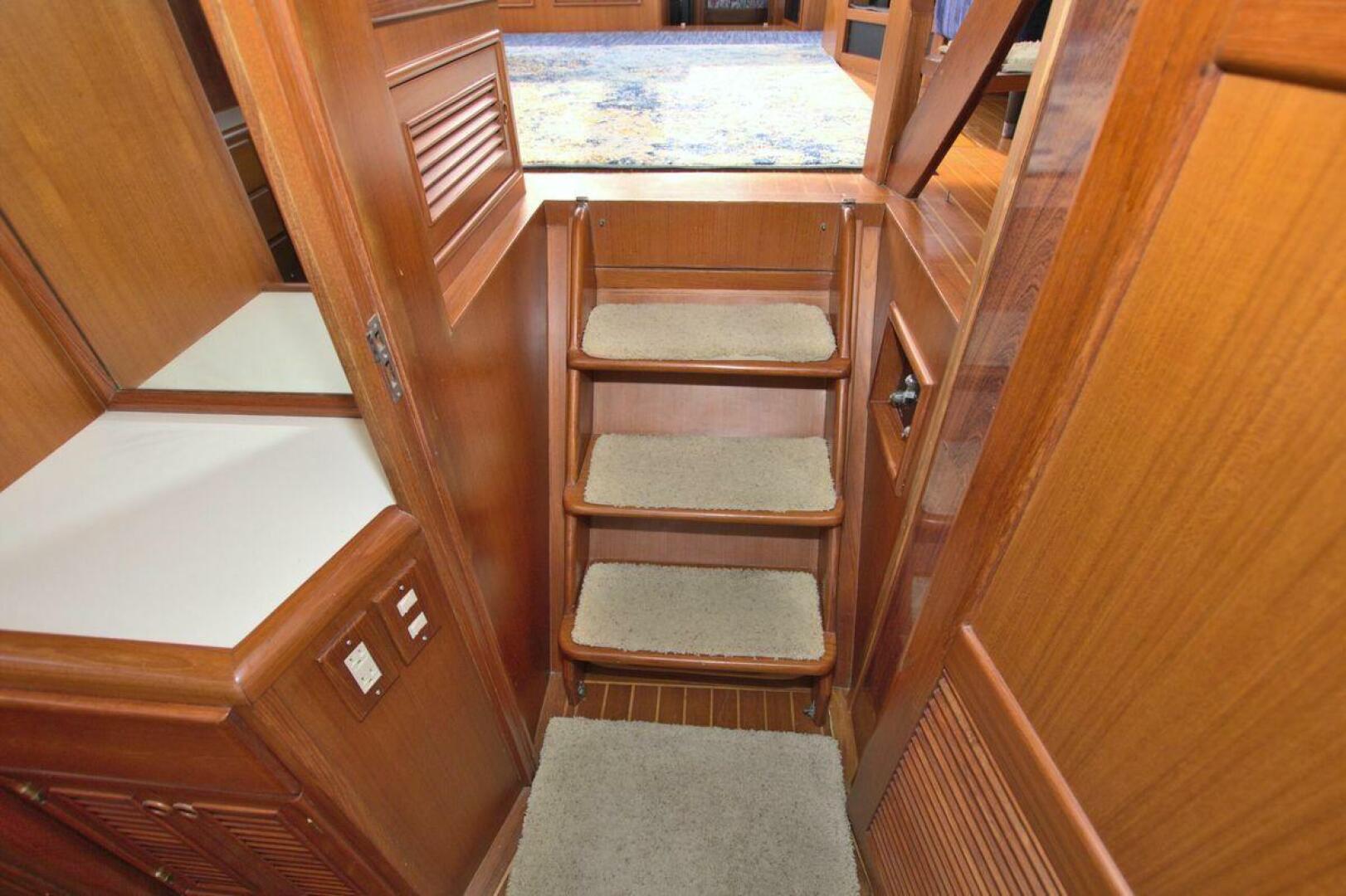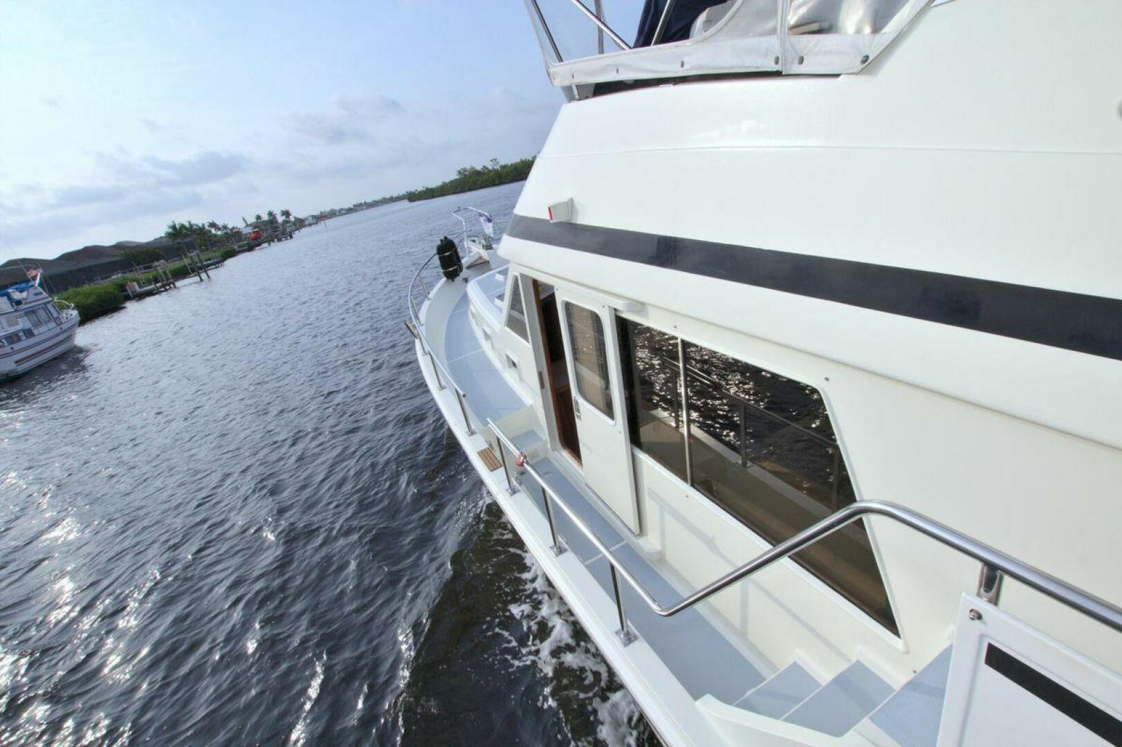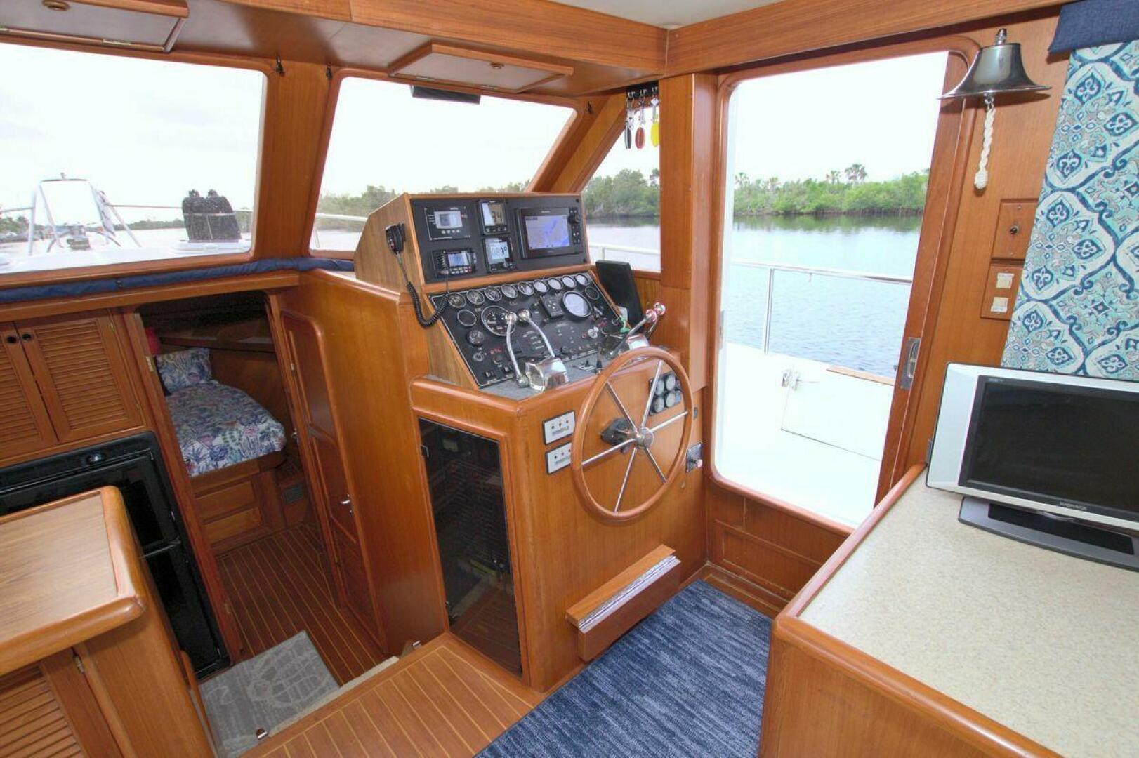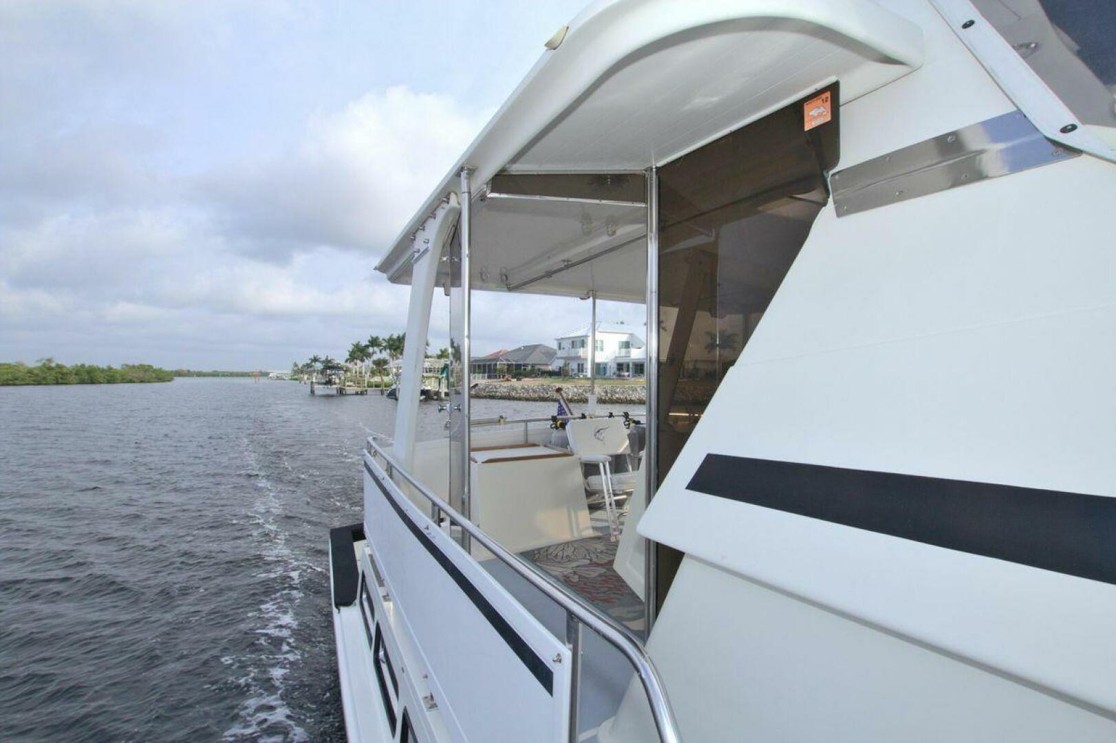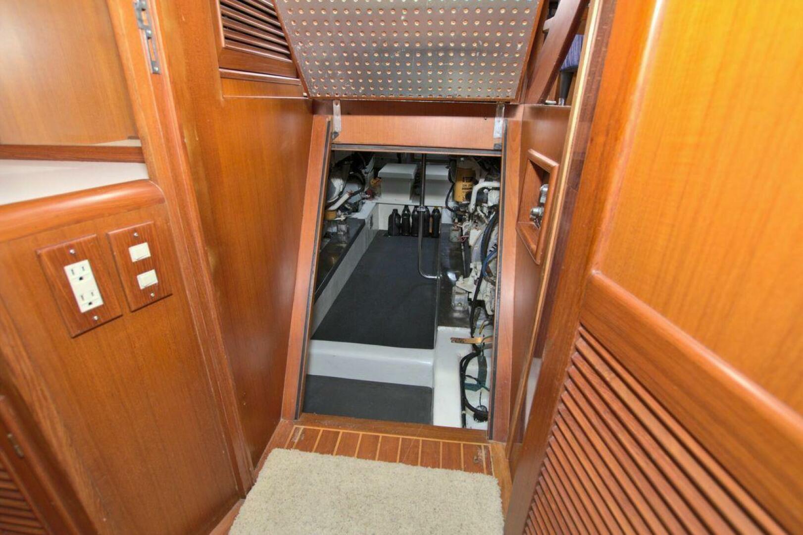 Aft cockpit with teak gunwale, transom door, and swim platform with stainless swim ladder. Cockpit has access to lazarette with a brand new Northern Lights 12.5 KW Generator with 90 Hours. Mid-level Aft deck has a hard top with aft deck plexi-glass wing doors, salon entry door.