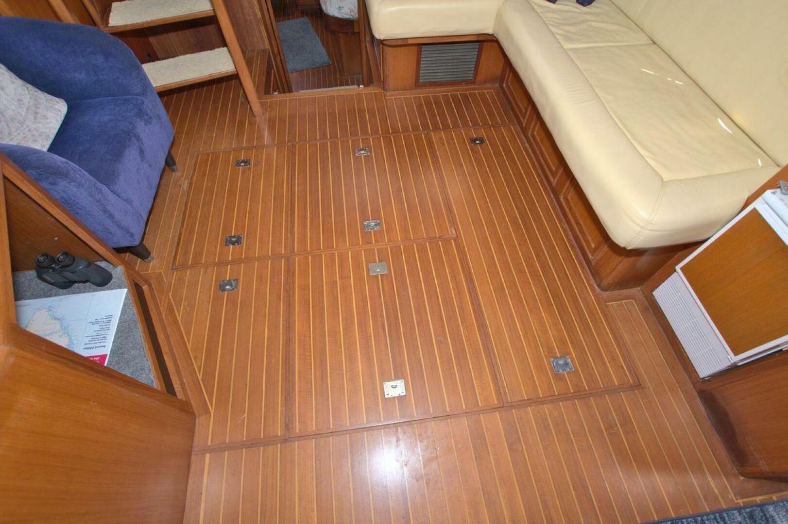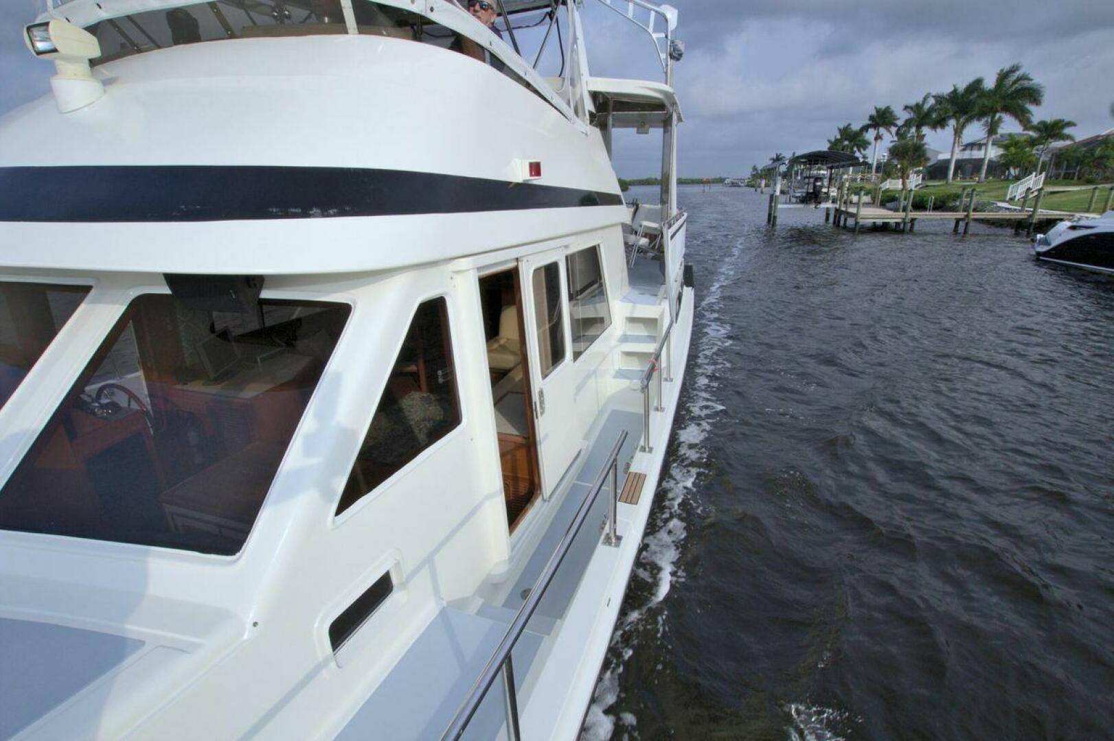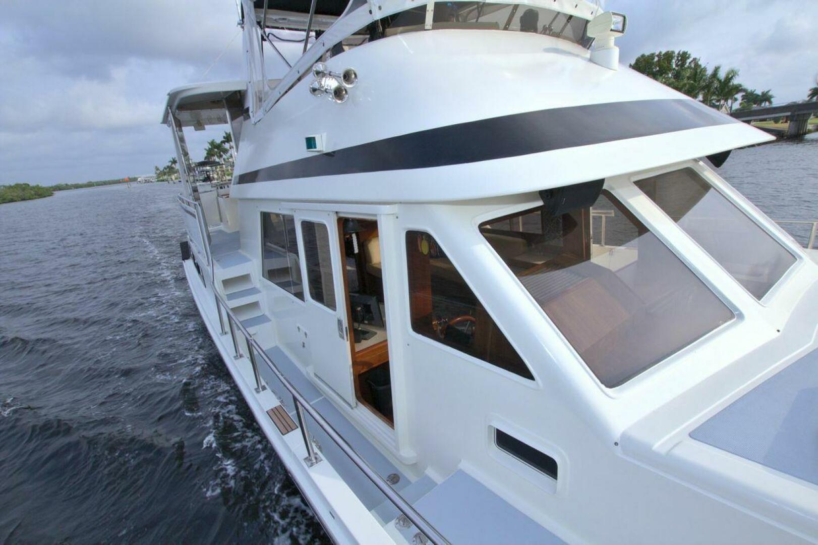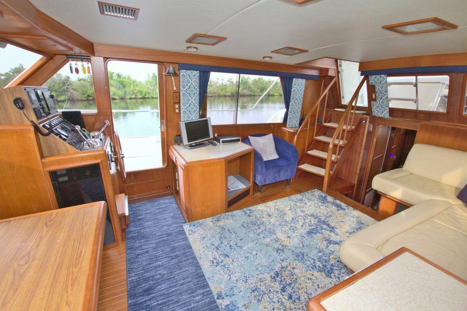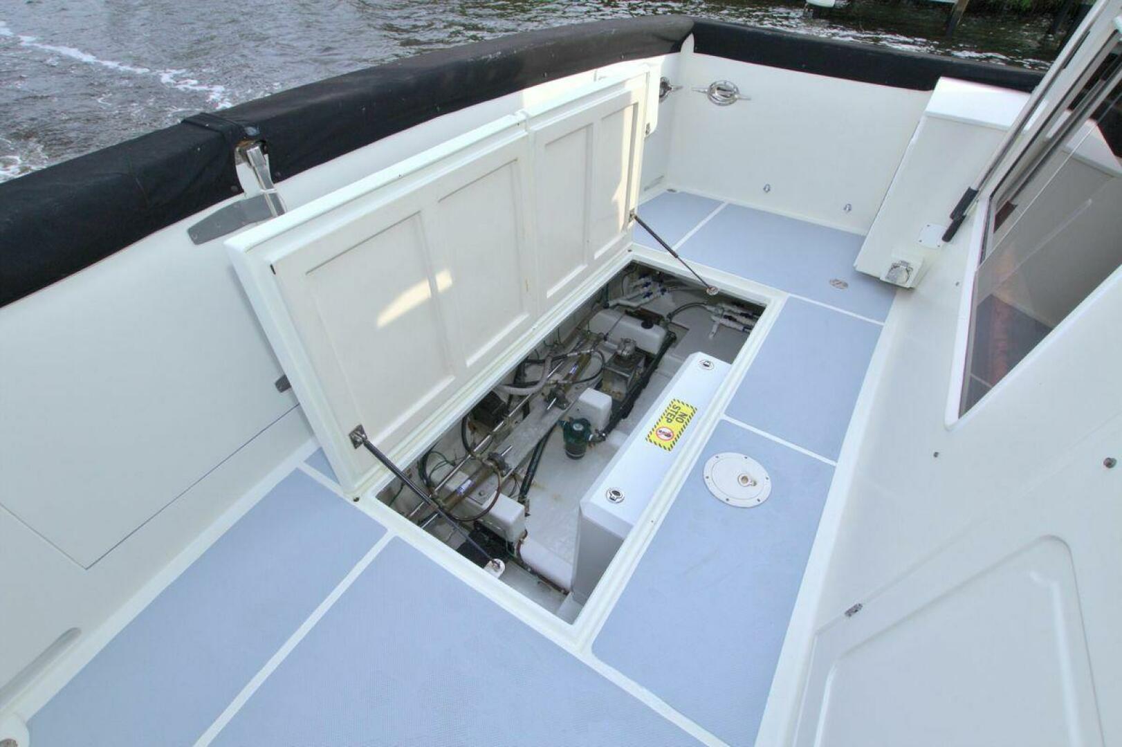 Aft cockpit with teak gunwale, transom door, and swim platform with stainless swim ladder. Cockpit has access to lazarette with a brand new Northern Lights 12.5 KW Generator with 90 Hours. Mid-level Aft deck has a hard top with aft deck plexi-glass wing doors, salon entry door.
