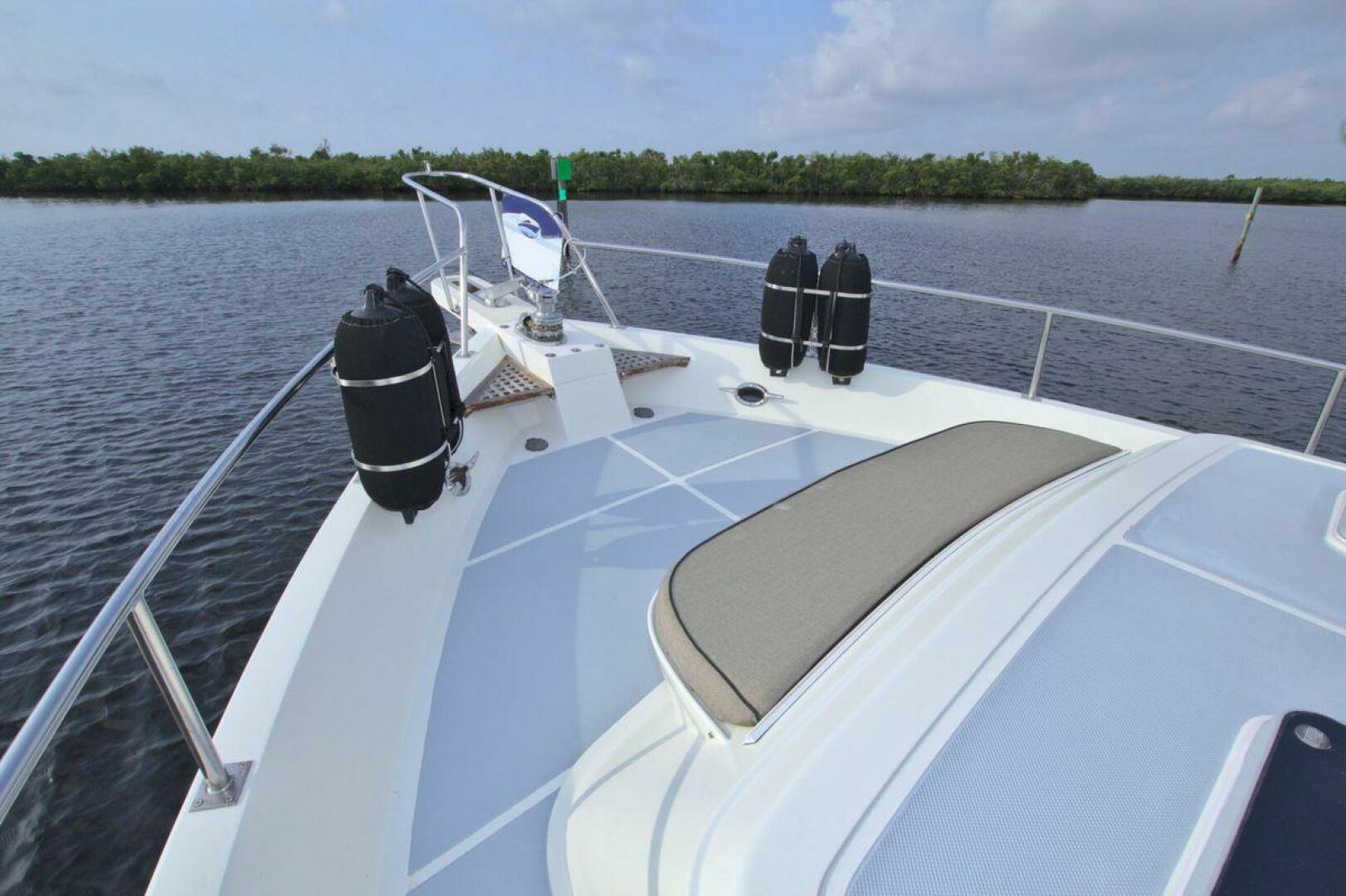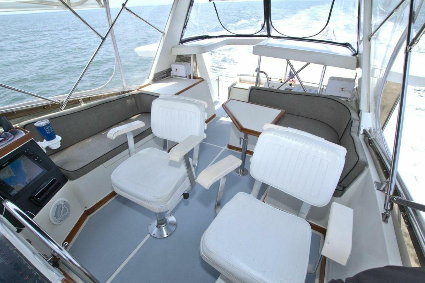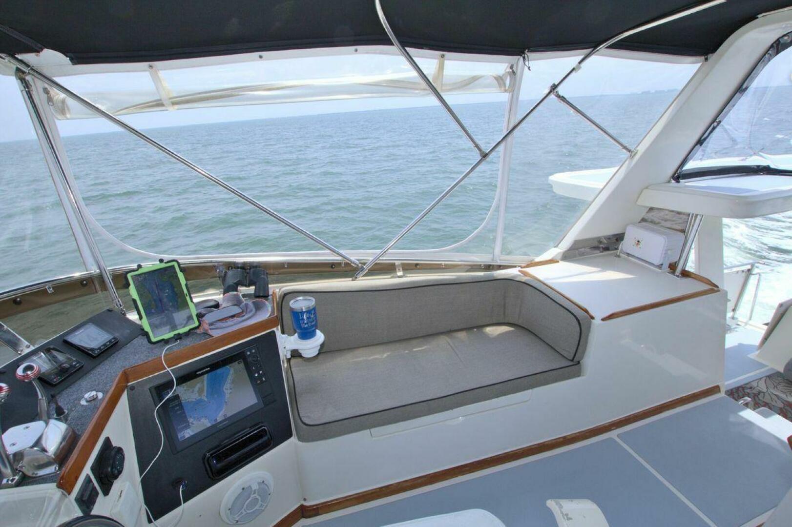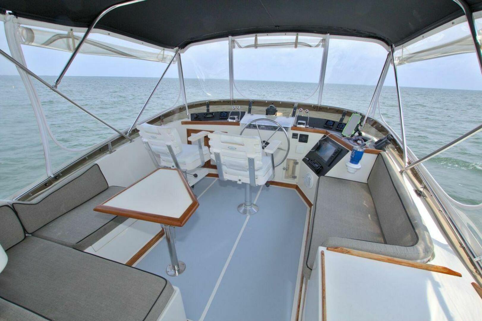 Flybridge starboard with bench seat, updated Electronics and Radar 2021. New Bimini top and a full enclosure. Canvas covers for all helm and flybridge seating. Bow pulpit with anchor roller windlass controls (1) 85 lb Rocna and 280ft all chain rode.