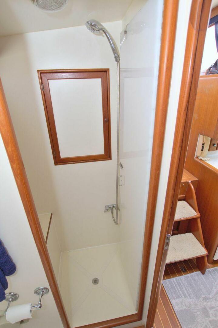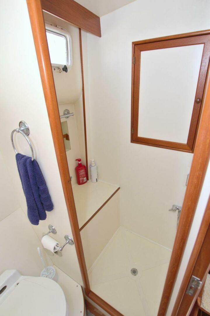 The guest cabin is forward and features a walk around queen berth with storage beneath. A dressing table with two drawers below and mirror faced locker above is aft and to port of the berth with a large hanging locker aft and to starboard. Like the master, the guest stateroom can be ventilated plus allows sun light to shine through the port holes and hatches. Private door to forward head with separate stall shower.