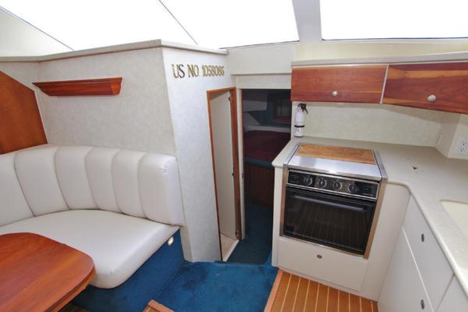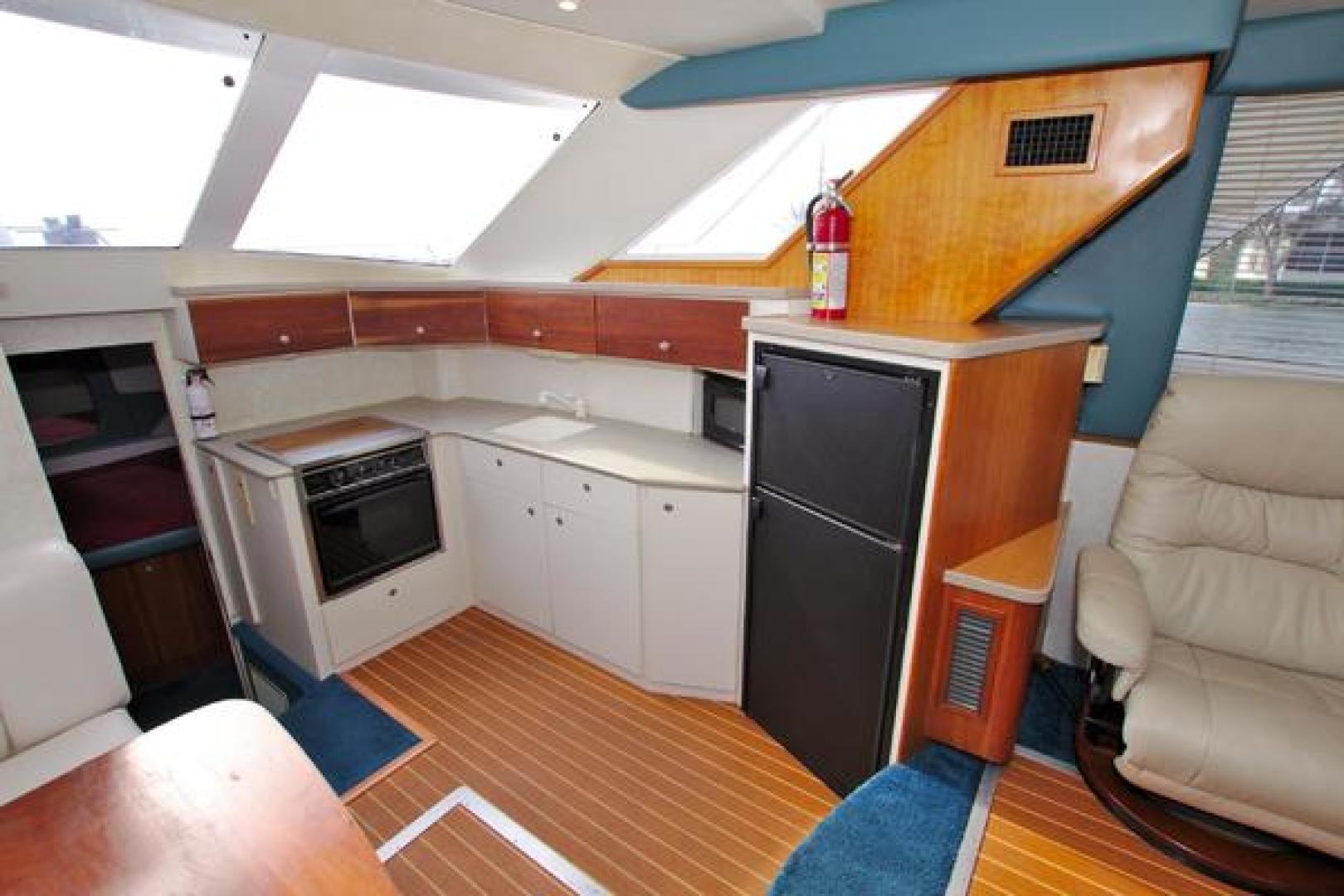 The galley features Corian countertops, a full-size refrigerator with ice-maker, three-burner stove/oven, microwave, deep sink design and plenty of cabinets for storage.