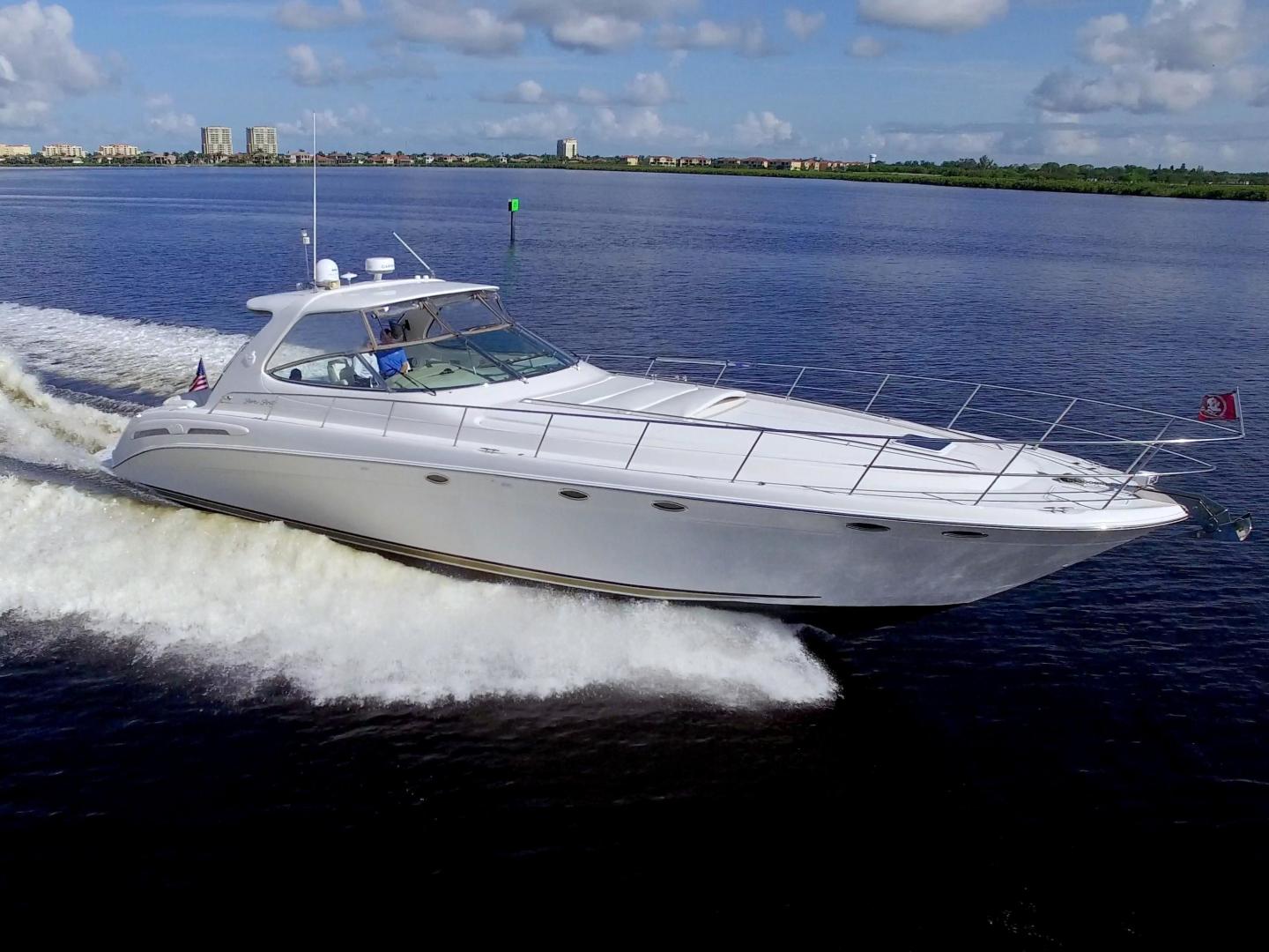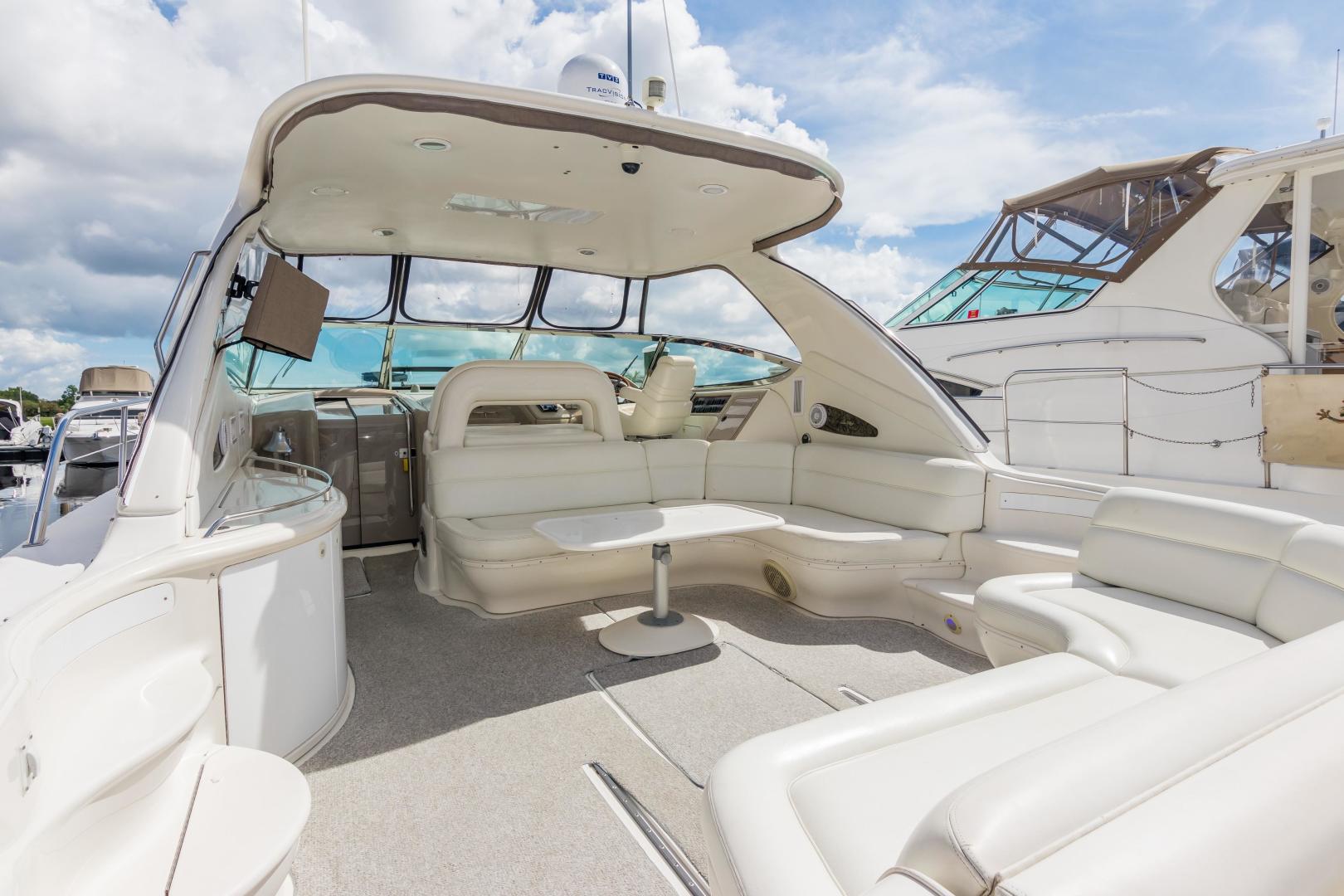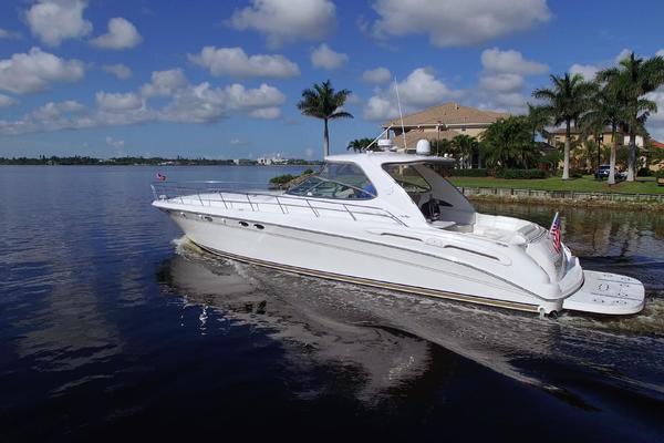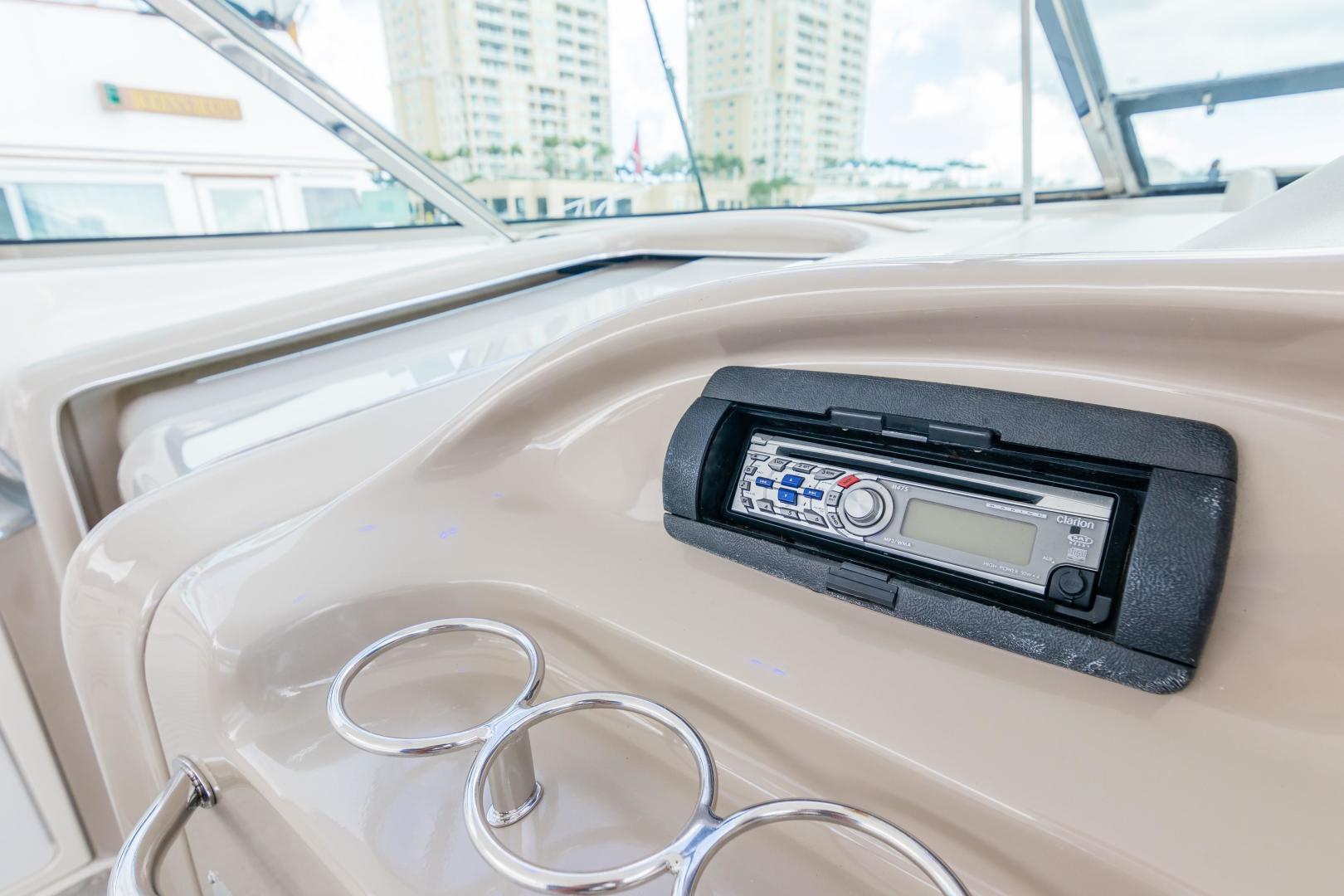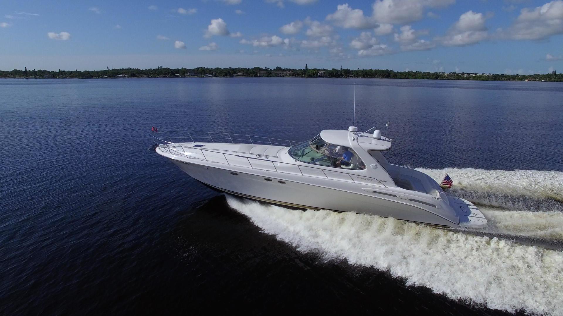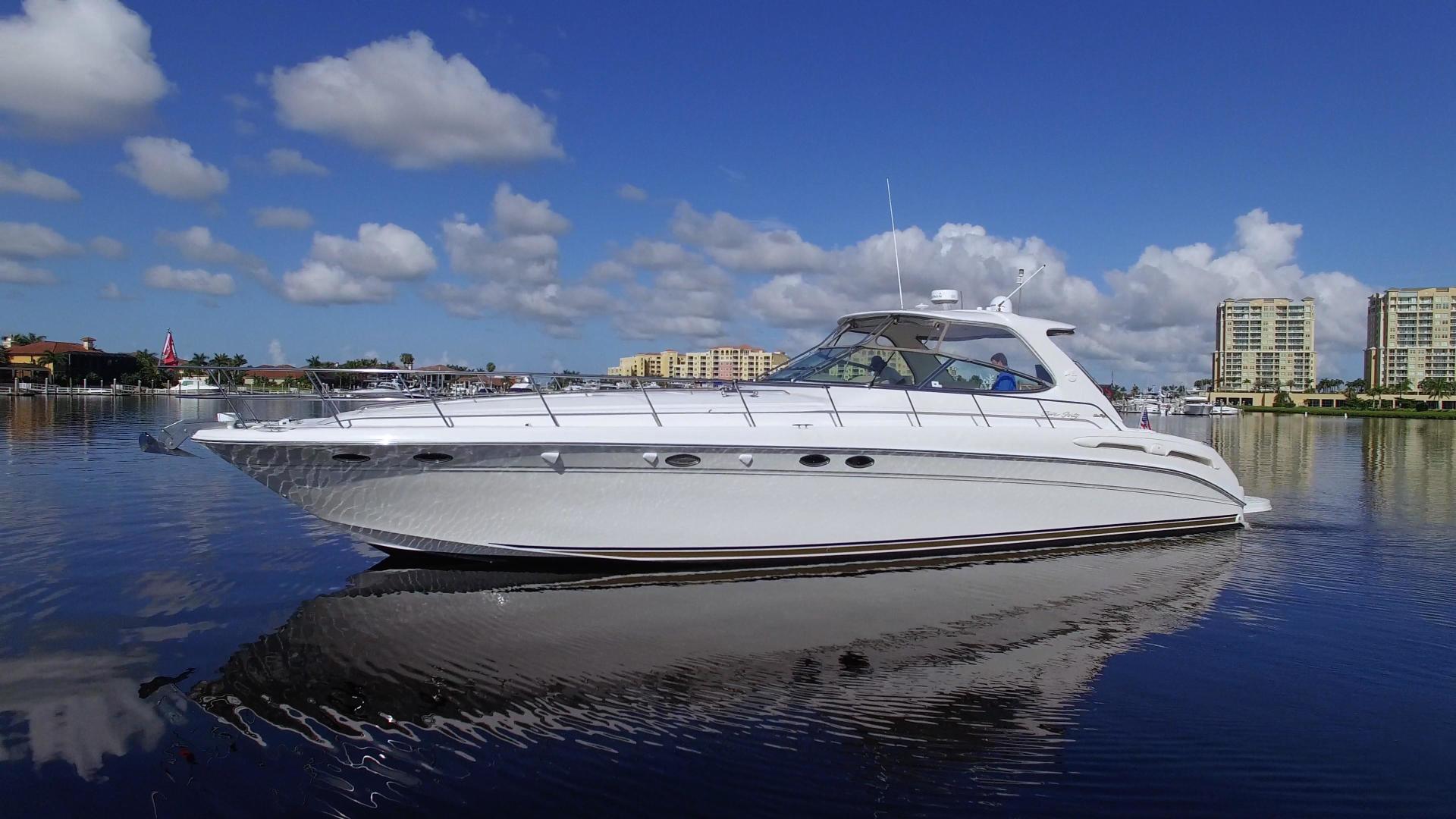 The Sea Ray 540 Sundancer, with its raised helm area design, gives the same amount of privacy and cabin space expected on an aft-cabin model, yet with all the open cockpit room of an express cruiser. On deck, the cockpit of the 540 Sundancer has a stylish sport spoiler, custom slide - swivel flip-up helm seat and Euro-styled companion bench seat. The U-shaped seating area has an electrically actuated retractable sunpad and there's an optional recessed sunpad available for the fore deck too. Even though the 540 Sundancer can be comfortably handled by two, you'll most likely want to share the wealth of standard features with family and friends, including a wet bar with cooler and icemaker, an aft cockpit sun shade, cable TV outlet and a Clarion AM-FM digital cassette stereo with six-disc CD changer subwoofer, amplifier, four speakers, and cockpit remote control. Even with so much of the cockpit dedicated to passenger space, there's also abundant room for personal gear in the port and starboard side compartments and docking equipment stows away neatly in the aft deck. The large private cabin of the 540 Sundancer is just as well-appointed as the cockpit with granite-colored countertops, dimmable lighting, and handcrafted wood trim in either vitricor cherry or clear maple finishes. Custom curtains, deep-pile stain-resistant carpet and concealed floor storage accentuate the modern decor. The mid-ship master stateroom has a queen-size bed with innerspring mattress and a gas-assisted hatch that reveals carpeted storage underneath. There's also a standard entertainment center with a TV - VCR - radio combination and a Bose Acoustimass 3 speaker system with remote control. A full-size bed and additional storage space make the guest stateroom perfect company. Both the master and guest head areas offer a VacuFlush head, power vents, striking cultured marble flooring, and Corian countertops with Grohe designer faucets. In the salon, a curved Ultraleather HP sofa cleverly hides an electric slide-out bed. There's even a concealed privacy curtain that pulls out when needed. The hidden, but complete galley has a three-burner cooktop, refrigerator - freezer with icemaker microwave - convection oven and a convenience package featuring a Spacemaker coffeemaker. In fact, all the comforts of home are present in the 540 Sundancer, right down to the standard washer - dryer combination and salon entertainment center with a color TV - VCR with remote and a Bose Lifestyle 20 stereo system with Jewel Cube speakers and LS bass module. From a technical standpoint, this boat is a masterpiece with responsive twin Caterpillar 3196 660HP and every control needed for unquestionably smooth sailing including a full Raytheon electronics package. The 540 Sundancer has a multiplexed digital LCC systems monitor for quick engine diagnostics and pump monitoring. The 15 kW Westerbeke remote generator has its own instrument panel, and there are also four large 8-D batteries with main battery solenoids and a distribution panel for power monitor The 540 Sundancer has a fiberglass hardtop.Disclaimer