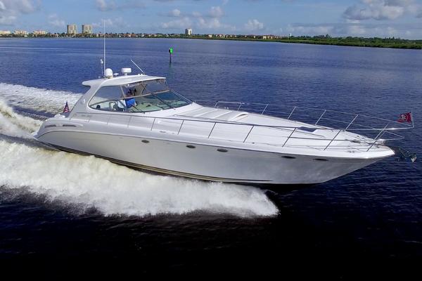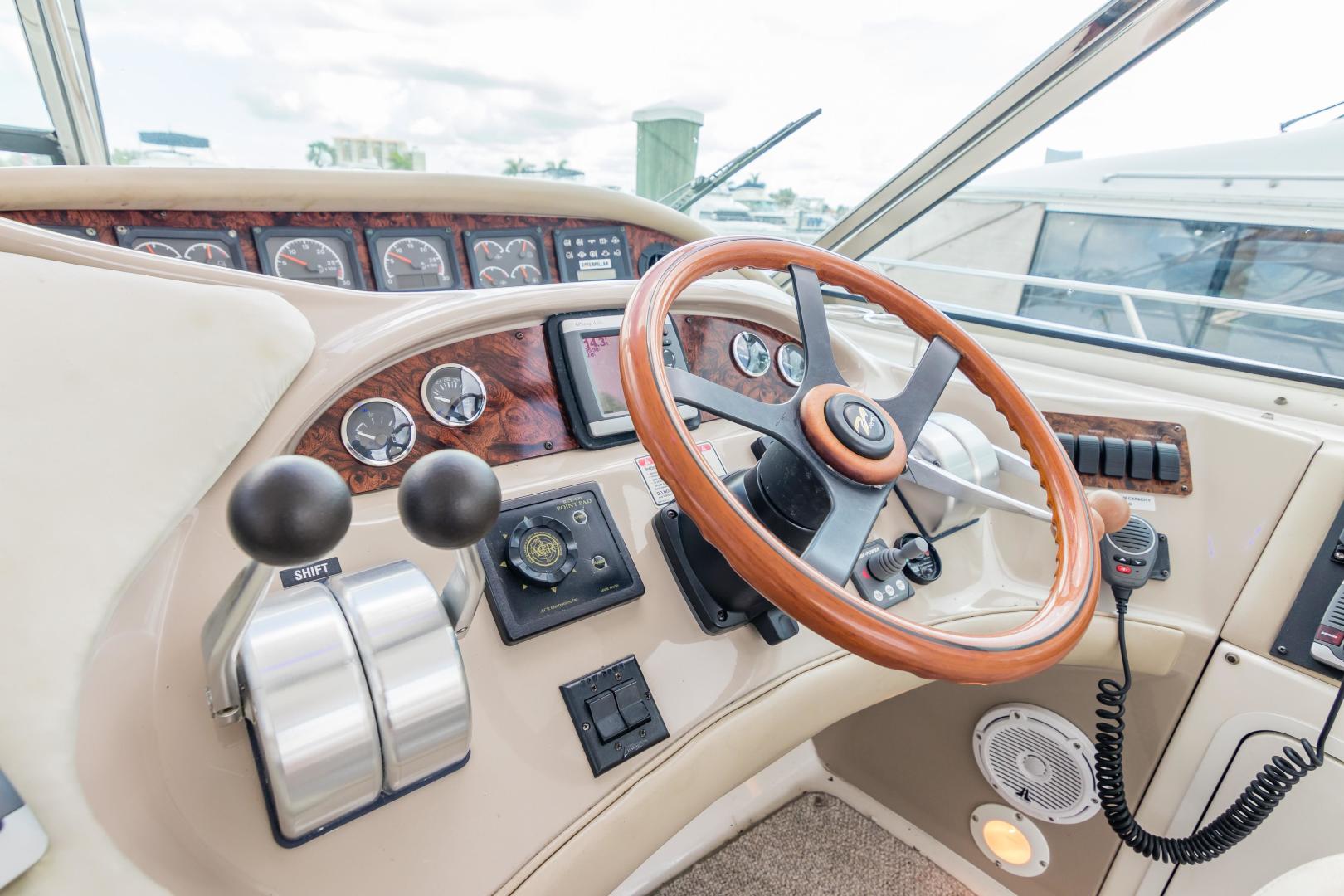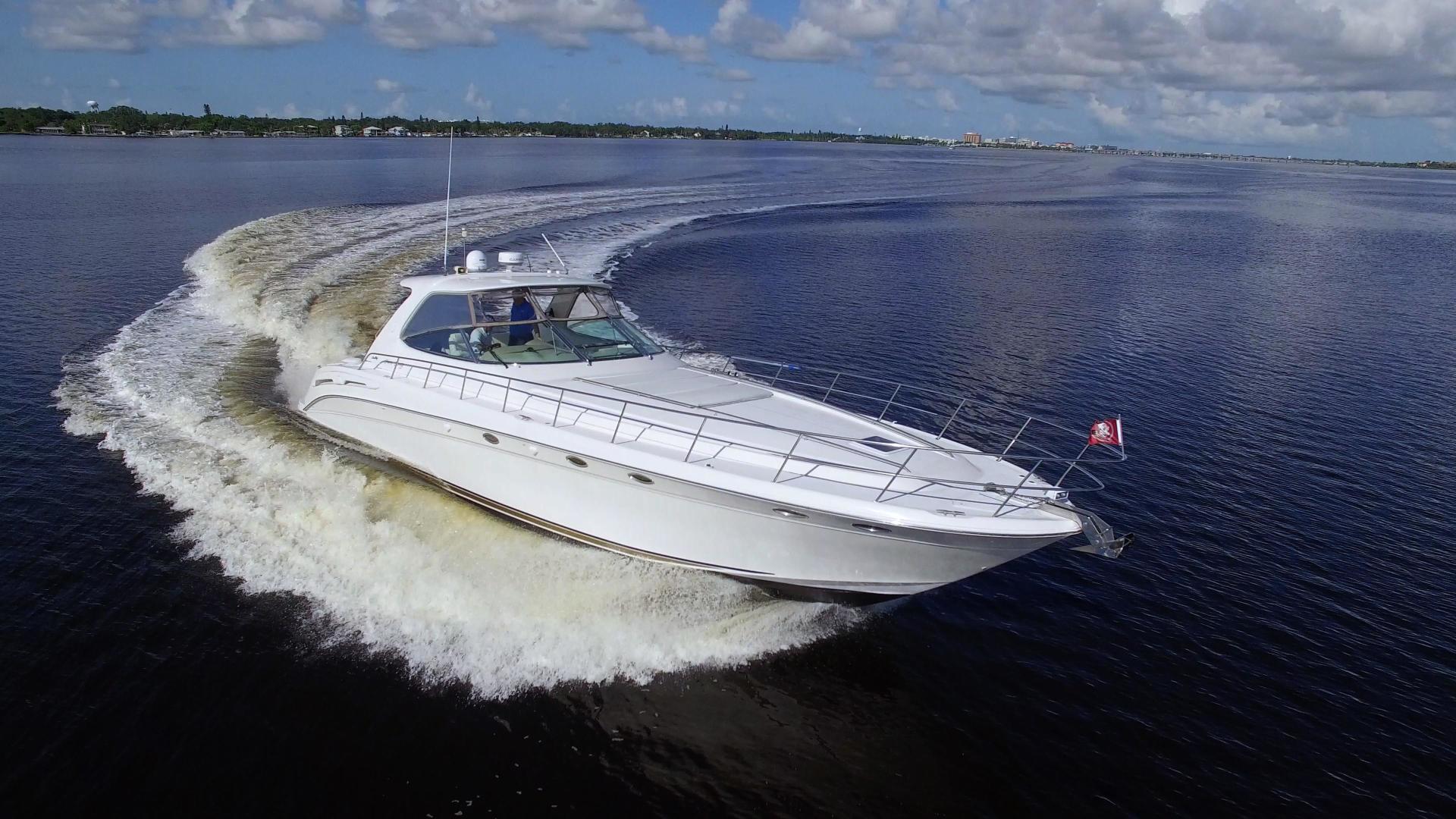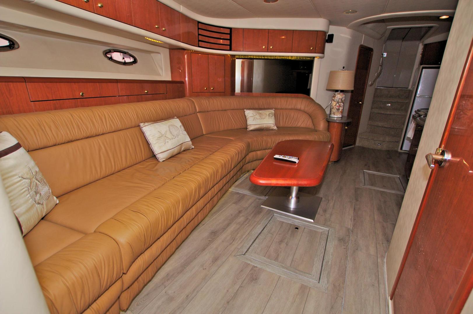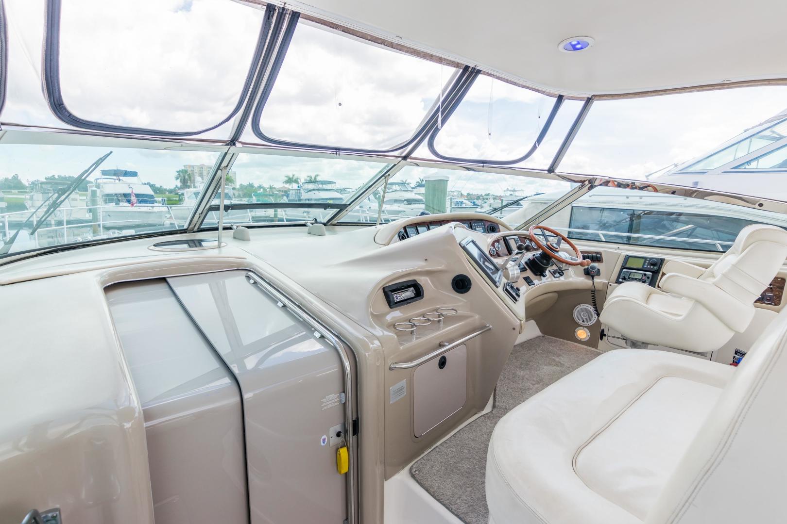 The Sea Ray 540 Sundancer, with its raised helm area design, gives the same amount of privacy and cabin space expected on an aft-cabin model, yet with all the open cockpit room of an express cruiser. On deck, the cockpit of the 540 Sundancer has a stylish sport spoiler, custom slide - swivel flip-up helm seat and Euro-styled companion bench seat. The U-shaped seating area has an electrically actuated retractable sunpad and there's an optional recessed sunpad available for the fore deck too. Even though the 540 Sundancer can be comfortably handled by two, you'll most likely want to share the wealth of standard features with family and friends, including a wet bar with cooler and icemaker, an aft cockpit sun shade, cable TV outlet and a Clarion AM-FM digital cassette stereo with six-disc CD changer subwoofer, amplifier, four speakers, and cockpit remote control. Even with so much of the cockpit dedicated to passenger space, there's also abundant room for personal gear in the port and starboard side compartments and docking equipment stows away neatly in the aft deck. The large private cabin of the 540 Sundancer is just as well-appointed as the cockpit with granite-colored countertops, dimmable lighting, and handcrafted wood trim in either vitricor cherry or clear maple finishes. Custom curtains, deep-pile stain-resistant carpet and concealed floor storage accentuate the modern decor. The mid-ship master stateroom has a queen-size bed with innerspring mattress and a gas-assisted hatch that reveals carpeted storage underneath. There's also a standard entertainment center with a TV - VCR - radio combination and a Bose Acoustimass 3 speaker system with remote control. A full-size bed and additional storage space make the guest stateroom perfect company. Both the master and guest head areas offer a VacuFlush head, power vents, striking cultured marble flooring, and Corian countertops with Grohe designer faucets. In the salon, a curved Ultraleather HP sofa cleverly hides an electric slide-out bed. There's even a concealed privacy curtain that pulls out when needed. The hidden, but complete galley has a three-burner cooktop, refrigerator - freezer with icemaker microwave - convection oven and a convenience package featuring a Spacemaker coffeemaker. In fact, all the comforts of home are present in the 540 Sundancer, right down to the standard washer - dryer combination and salon entertainment center with a color TV - VCR with remote and a Bose Lifestyle 20 stereo system with Jewel Cube speakers and LS bass module. From a technical standpoint, this boat is a masterpiece with responsive twin Caterpillar 3196 660HP and every control needed for unquestionably smooth sailing including a full Raytheon electronics package. The 540 Sundancer has a multiplexed digital LCC systems monitor for quick engine diagnostics and pump monitoring. The 15 kW Westerbeke remote generator has its own instrument panel, and there are also four large 8-D batteries with main battery solenoids and a distribution panel for power monitor The 540 Sundancer has a fiberglass hardtop.Disclaimer