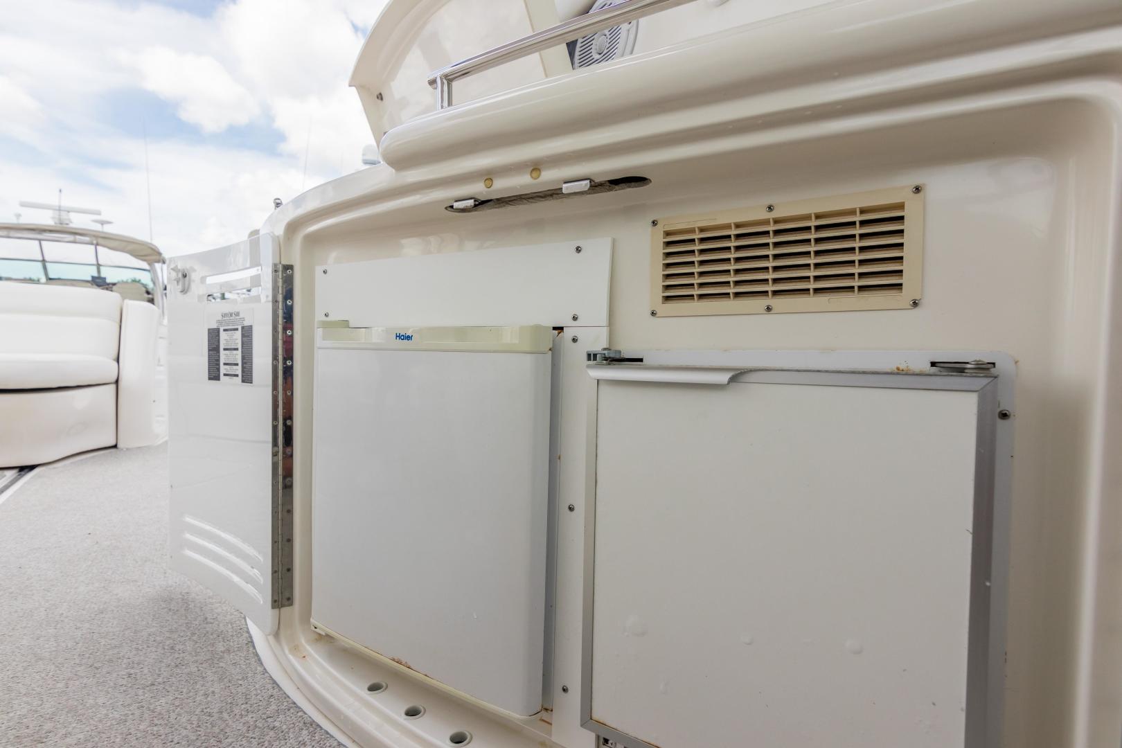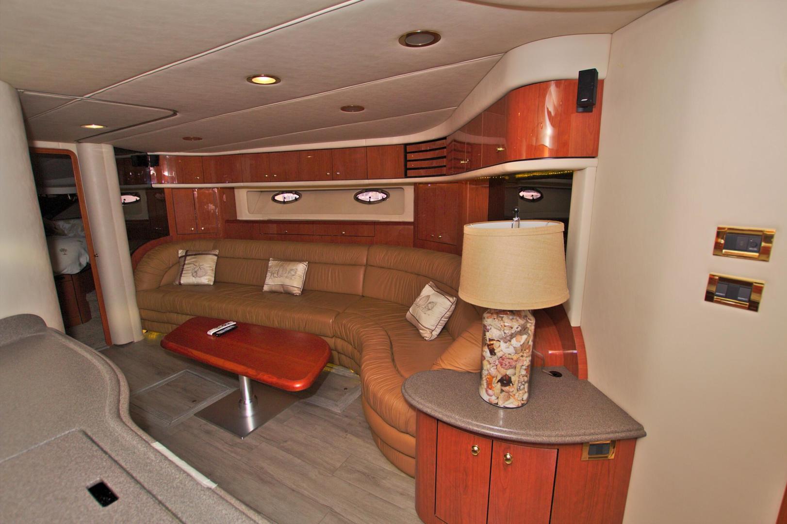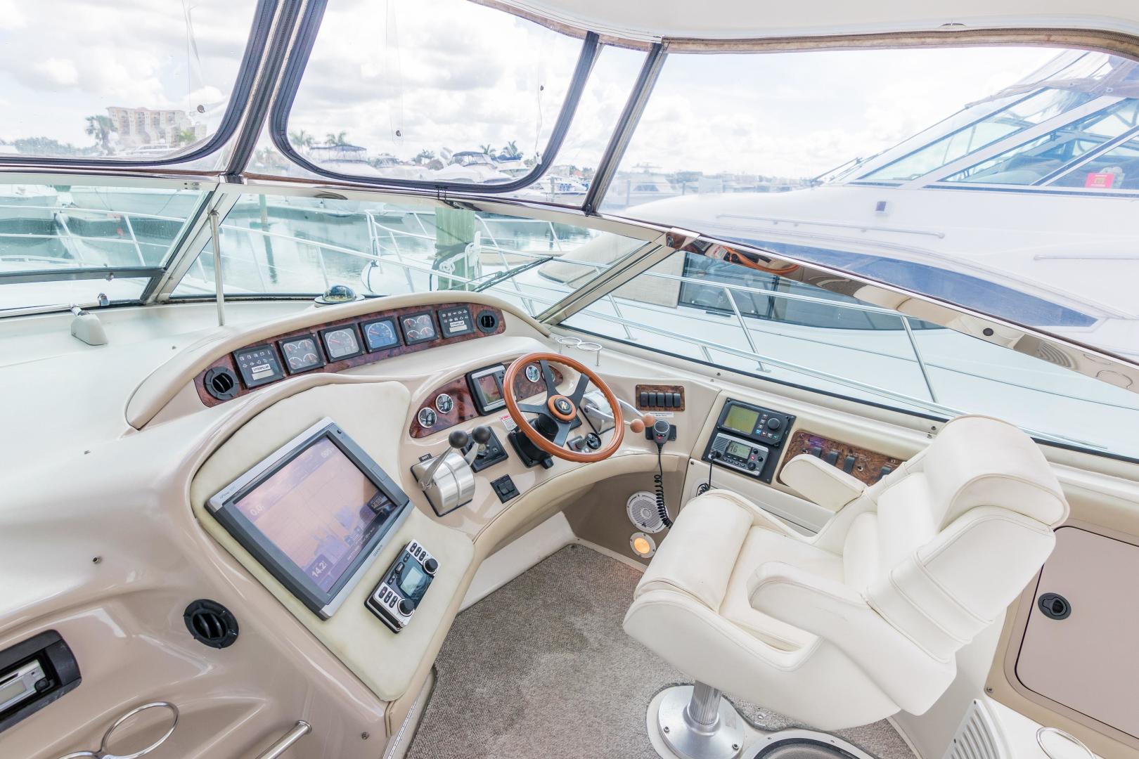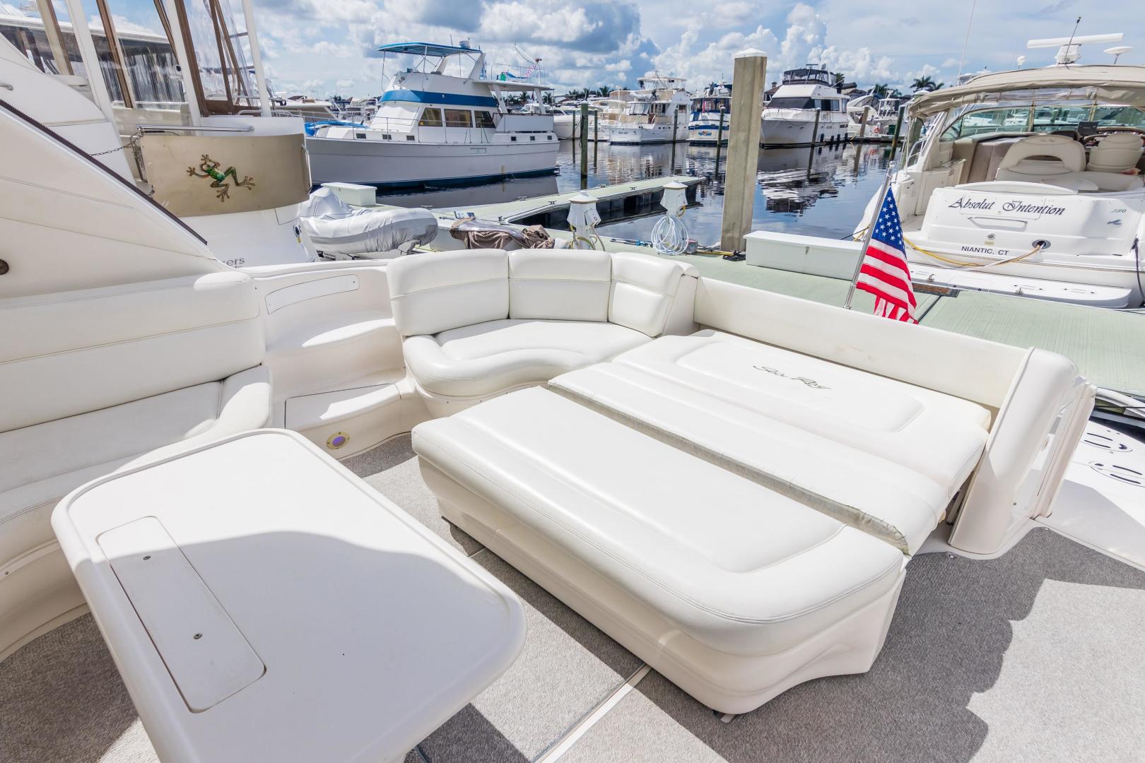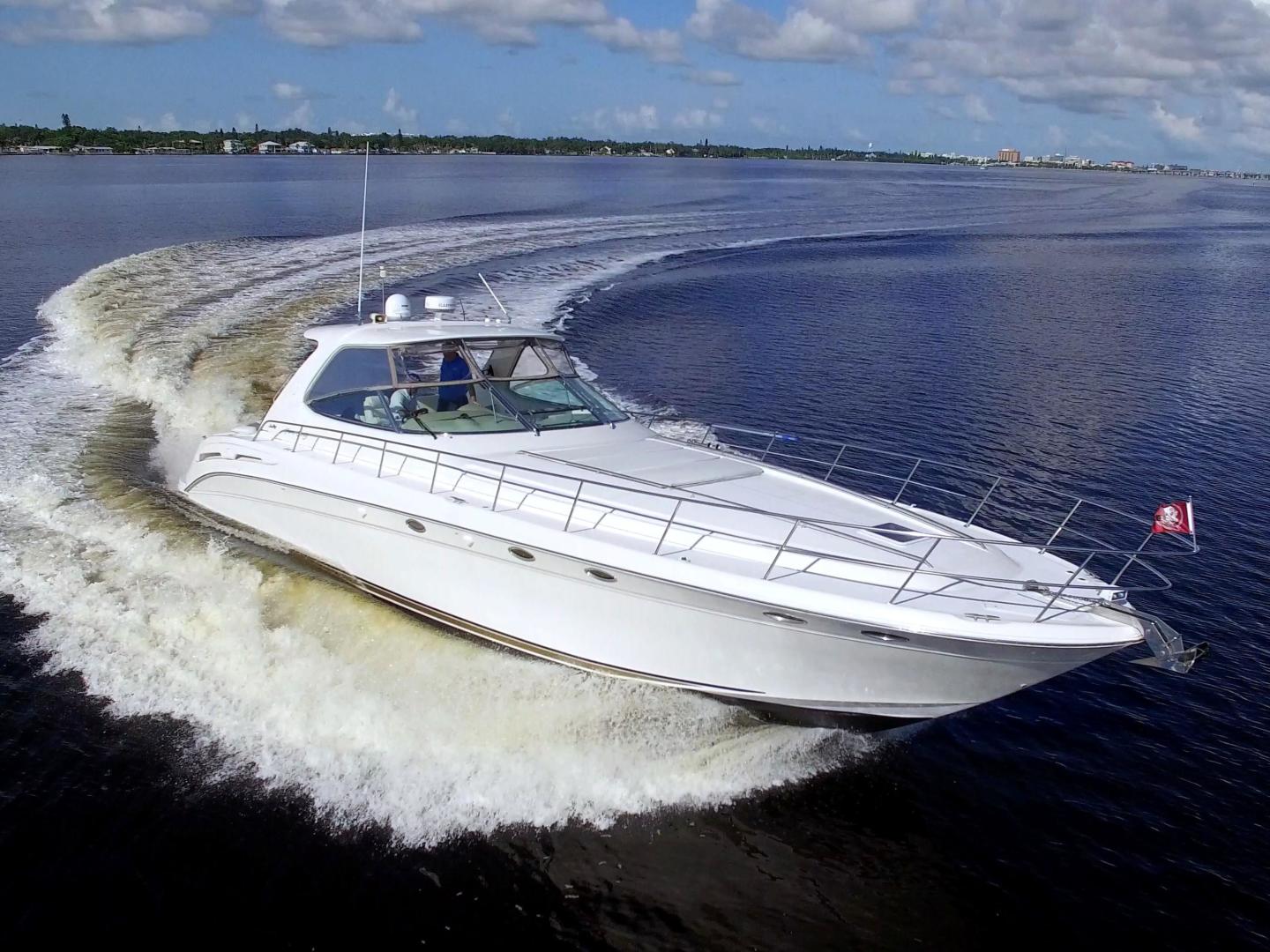 The Sea Ray 540 Sundancer, with its raised helm area design, gives the same amount of privacy and cabin space expected on an aft-cabin model, yet with all the open cockpit room of an express cruiser. On deck, the cockpit of the 540 Sundancer has a stylish sport spoiler, custom slide - swivel flip-up helm seat and Euro-styled companion bench seat. The U-shaped seating area has an electrically actuated retractable sunpad and there's an optional recessed sunpad available for the fore deck too. Even though the 540 Sundancer can be comfortably handled by two, you'll most likely want to share the wealth of standard features with family and friends, including a wet bar with cooler and icemaker, an aft cockpit sun shade, cable TV outlet and a Clarion AM-FM digital cassette stereo with six-disc CD changer subwoofer, amplifier, four speakers, and cockpit remote control. Even with so much of the cockpit dedicated to passenger space, there's also abundant room for personal gear in the port and starboard side compartments and docking equipment stows away neatly in the aft deck. The large private cabin of the 540 Sundancer is just as well-appointed as the cockpit with granite-colored countertops, dimmable lighting, and handcrafted wood trim in either vitricor cherry or clear maple finishes. Custom curtains, deep-pile stain-resistant carpet and concealed floor storage accentuate the modern decor. The mid-ship master stateroom has a queen-size bed with innerspring mattress and a gas-assisted hatch that reveals carpeted storage underneath. There's also a standard entertainment center with a TV - VCR - radio combination and a Bose Acoustimass 3 speaker system with remote control. A full-size bed and additional storage space make the guest stateroom perfect company. Both the master and guest head areas offer a VacuFlush head, power vents, striking cultured marble flooring, and Corian countertops with Grohe designer faucets. In the salon, a curved Ultraleather HP sofa cleverly hides an electric slide-out bed. There's even a concealed privacy curtain that pulls out when needed. The hidden, but complete galley has a three-burner cooktop, refrigerator - freezer with icemaker microwave - convection oven and a convenience package featuring a Spacemaker coffeemaker. In fact, all the comforts of home are present in the 540 Sundancer, right down to the standard washer - dryer combination and salon entertainment center with a color TV - VCR with remote and a Bose Lifestyle 20 stereo system with Jewel Cube speakers and LS bass module. From a technical standpoint, this boat is a masterpiece with responsive twin Caterpillar 3196 660HP and every control needed for unquestionably smooth sailing including a full Raytheon electronics package. The 540 Sundancer has a multiplexed digital LCC systems monitor for quick engine diagnostics and pump monitoring. The 15 kW Westerbeke remote generator has its own instrument panel, and there are also four large 8-D batteries with main battery solenoids and a distribution panel for power monitor The 540 Sundancer has a fiberglass hardtop.Disclaimer