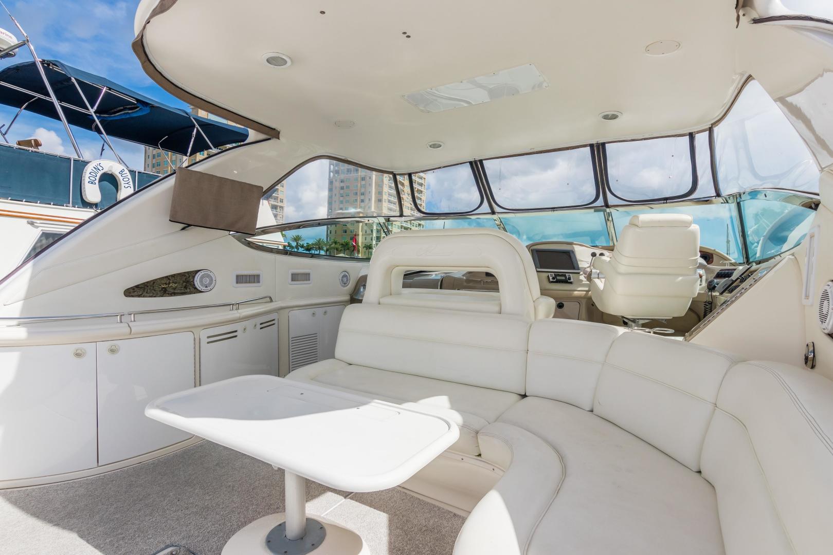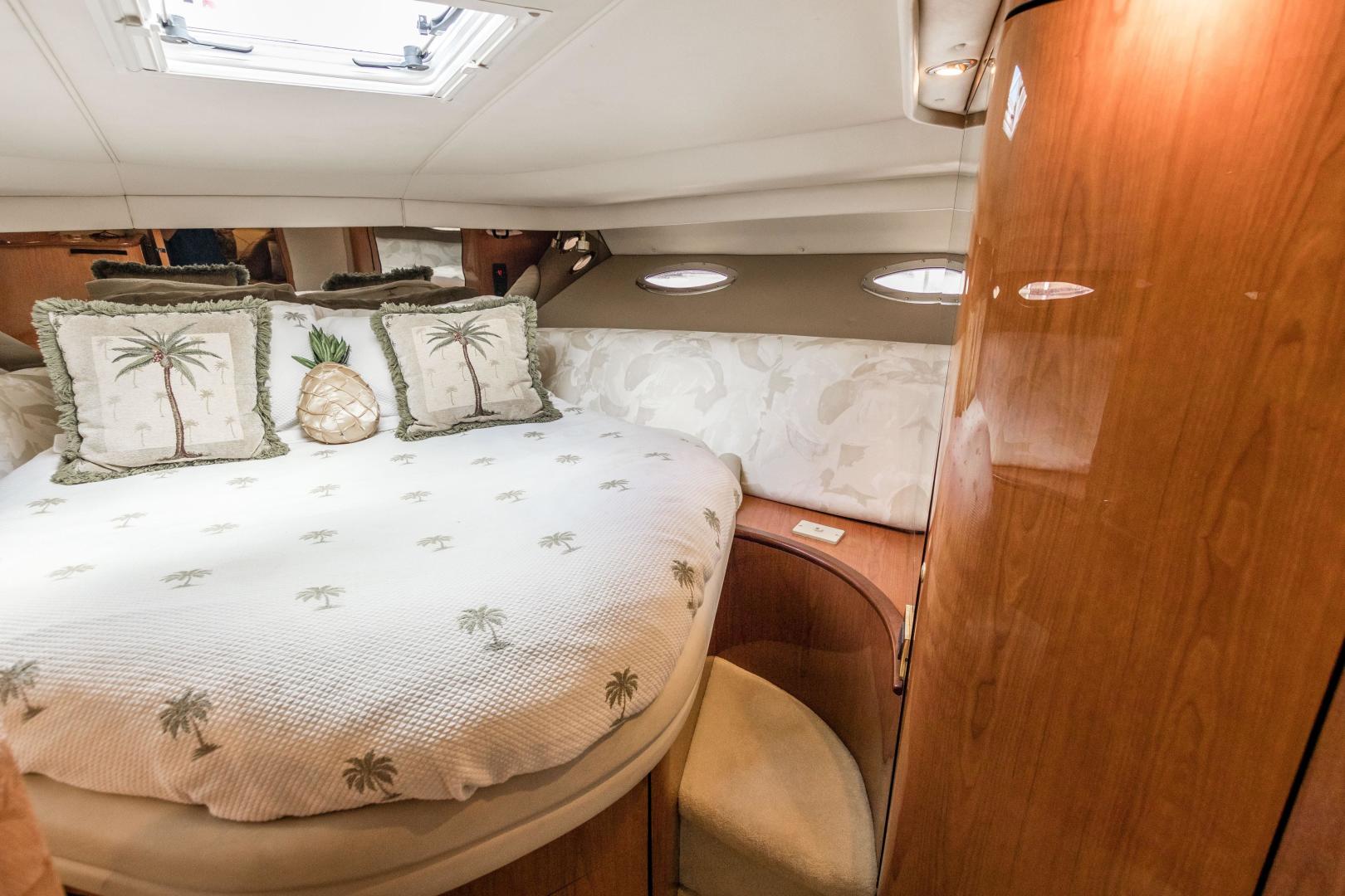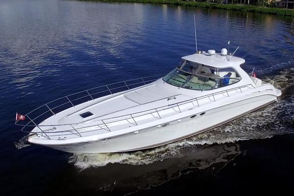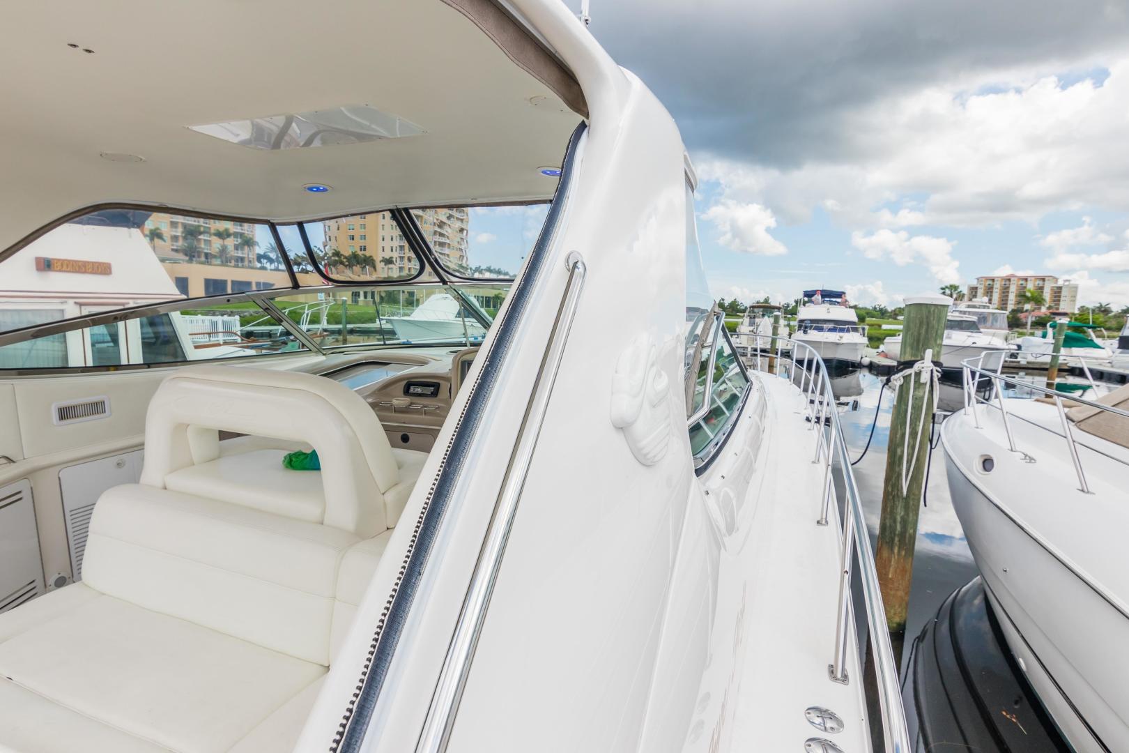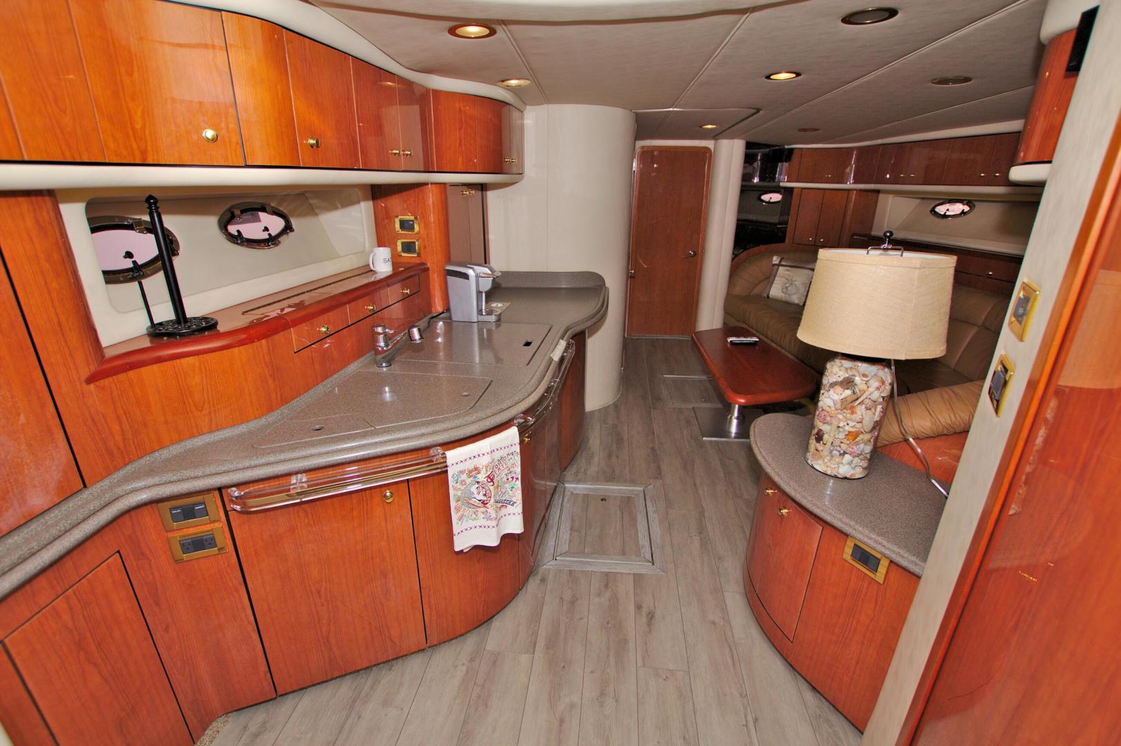 The Sea Ray 540 Sundancer, with its raised helm area design, gives the same amount of privacy and cabin space expected on an aft-cabin model, yet with all the open cockpit room of an express cruiser. On deck, the cockpit of the 540 Sundancer has a stylish sport spoiler, custom slide - swivel flip-up helm seat and Euro-styled companion bench seat. The U-shaped seating area has an electrically actuated retractable sunpad and there's an optional recessed sunpad available for the fore deck too. Even though the 540 Sundancer can be comfortably handled by two, you'll most likely want to share the wealth of standard features with family and friends, including a wet bar with cooler and icemaker, an aft cockpit sun shade, cable TV outlet and a Clarion AM-FM digital cassette stereo with six-disc CD changer subwoofer, amplifier, four speakers, and cockpit remote control. Even with so much of the cockpit dedicated to passenger space, there's also abundant room for personal gear in the port and starboard side compartments and docking equipment stows away neatly in the aft deck. The large private cabin of the 540 Sundancer is just as well-appointed as the cockpit with granite-colored countertops, dimmable lighting, and handcrafted wood trim in either vitricor cherry or clear maple finishes. Custom curtains, deep-pile stain-resistant carpet and concealed floor storage accentuate the modern decor. The mid-ship master stateroom has a queen-size bed with innerspring mattress and a gas-assisted hatch that reveals carpeted storage underneath. There's also a standard entertainment center with a TV - VCR - radio combination and a Bose Acoustimass 3 speaker system with remote control. A full-size bed and additional storage space make the guest stateroom perfect company. Both the master and guest head areas offer a VacuFlush head, power vents, striking cultured marble flooring, and Corian countertops with Grohe designer faucets. In the salon, a curved Ultraleather HP sofa cleverly hides an electric slide-out bed. There's even a concealed privacy curtain that pulls out when needed. The hidden, but complete galley has a three-burner cooktop, refrigerator - freezer with icemaker microwave - convection oven and a convenience package featuring a Spacemaker coffeemaker. In fact, all the comforts of home are present in the 540 Sundancer, right down to the standard washer - dryer combination and salon entertainment center with a color TV - VCR with remote and a Bose Lifestyle 20 stereo system with Jewel Cube speakers and LS bass module. From a technical standpoint, this boat is a masterpiece with responsive twin Caterpillar 3196 660HP and every control needed for unquestionably smooth sailing including a full Raytheon electronics package. The 540 Sundancer has a multiplexed digital LCC systems monitor for quick engine diagnostics and pump monitoring. The 15 kW Westerbeke remote generator has its own instrument panel, and there are also four large 8-D batteries with main battery solenoids and a distribution panel for power monitor The 540 Sundancer has a fiberglass hardtop.Disclaimer