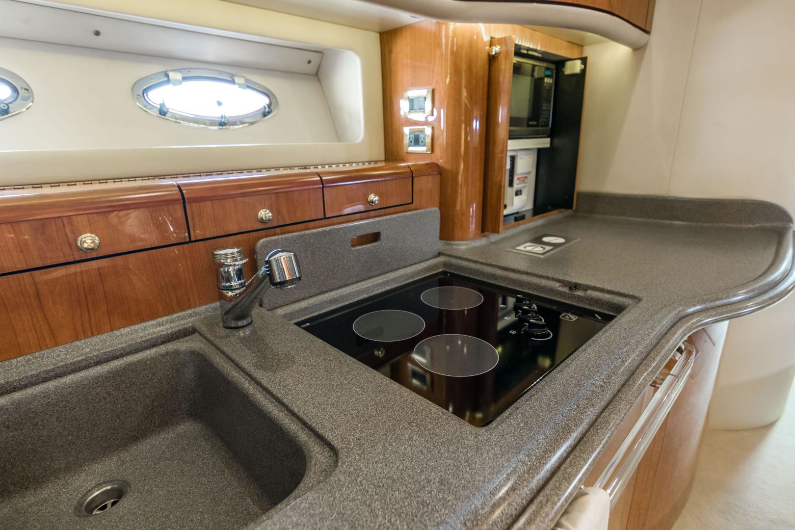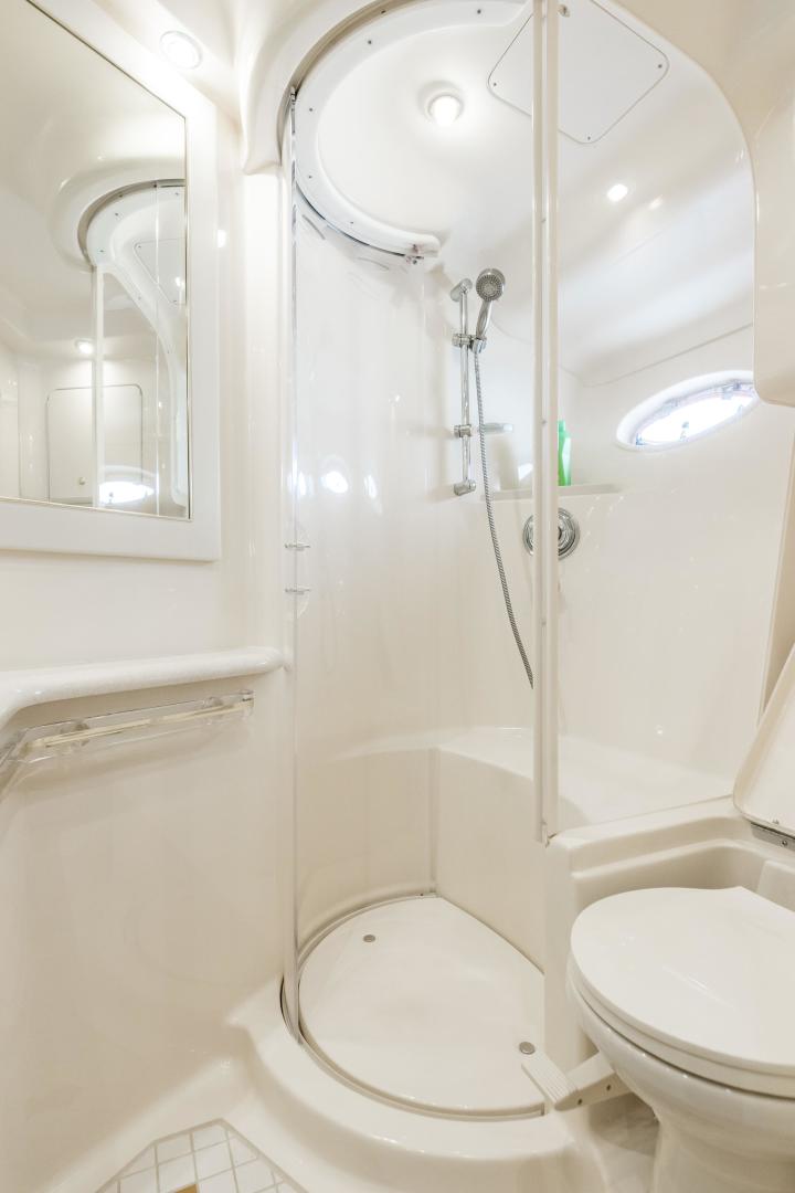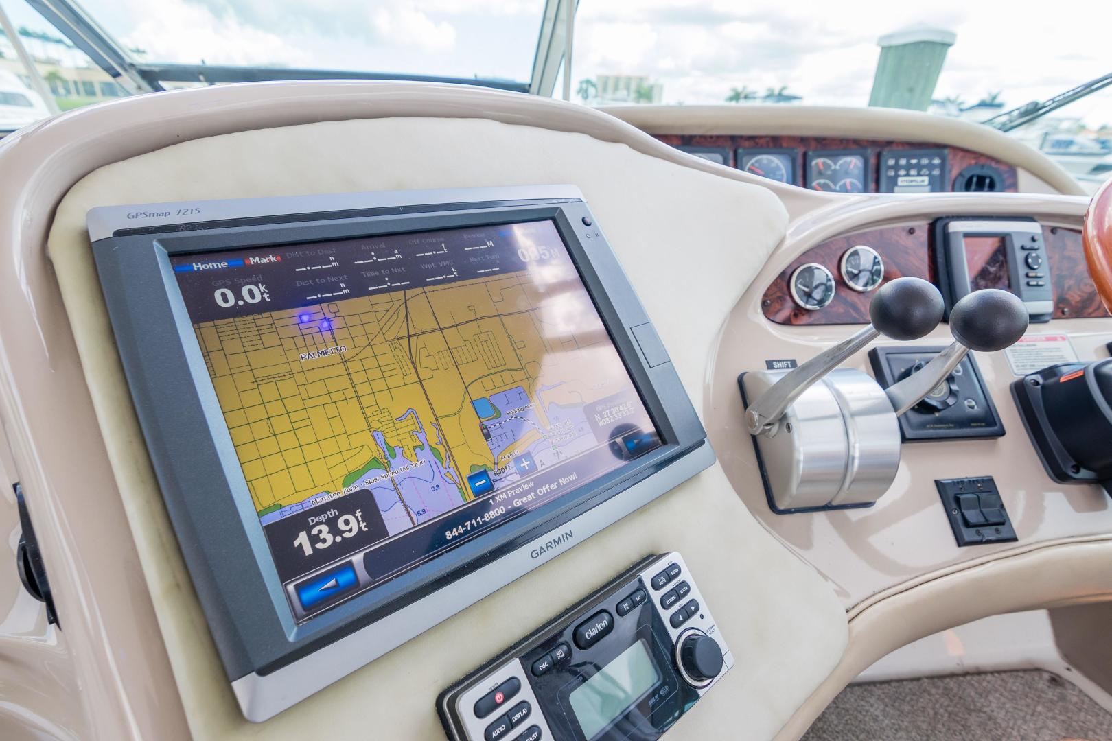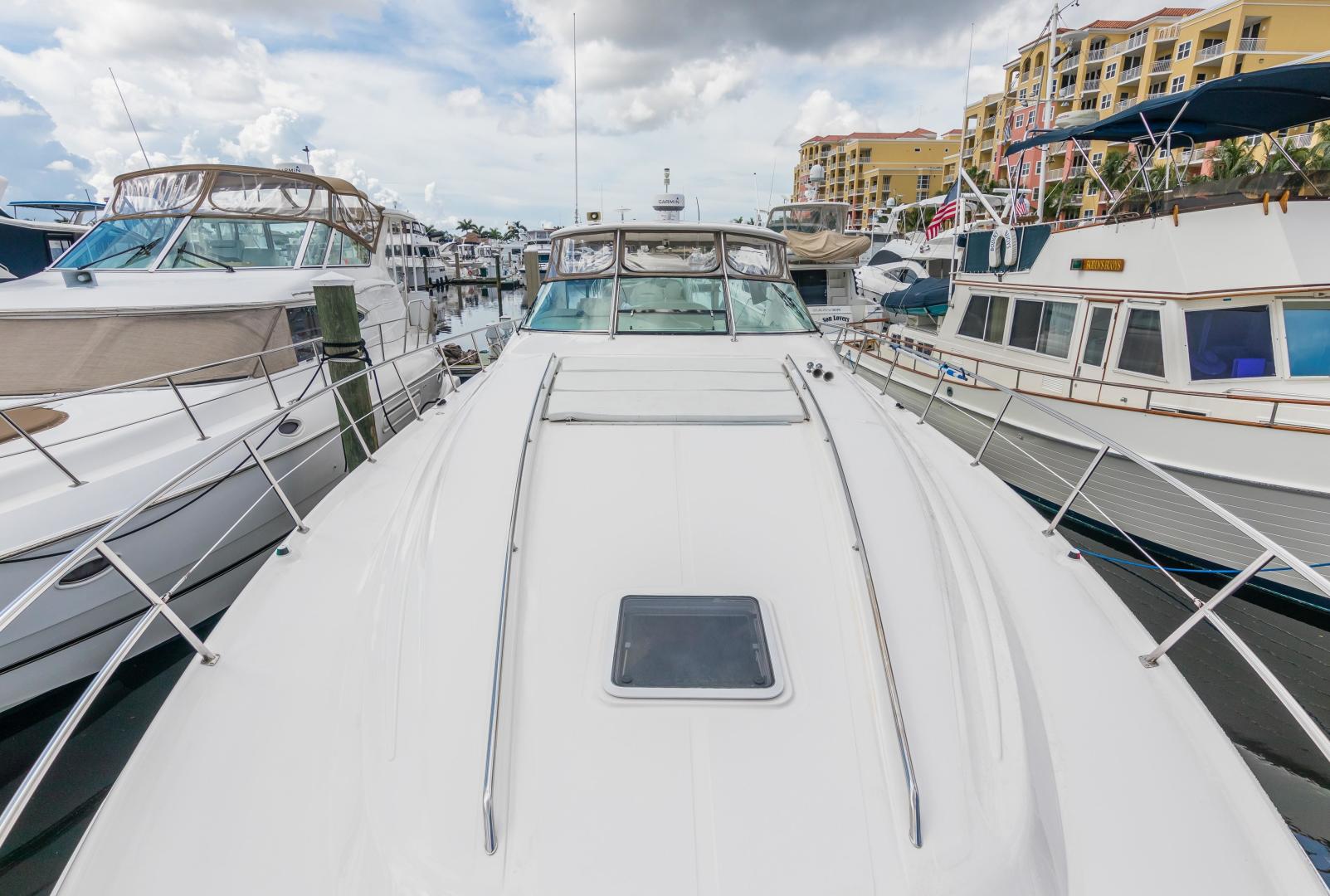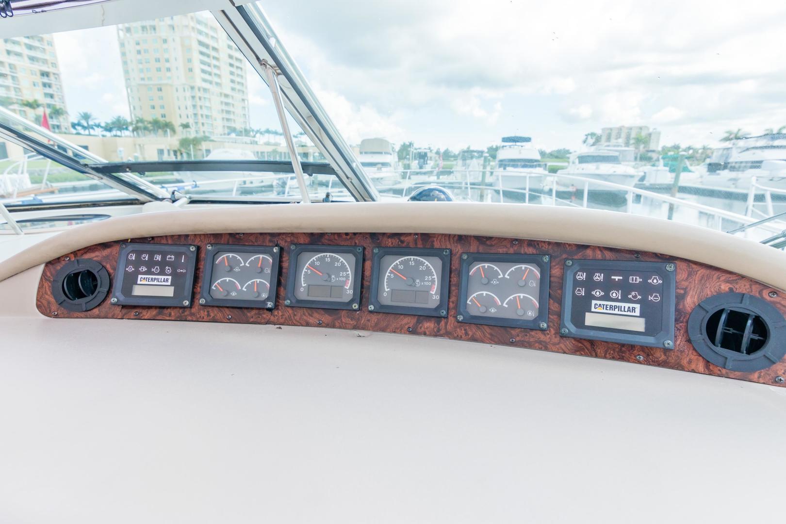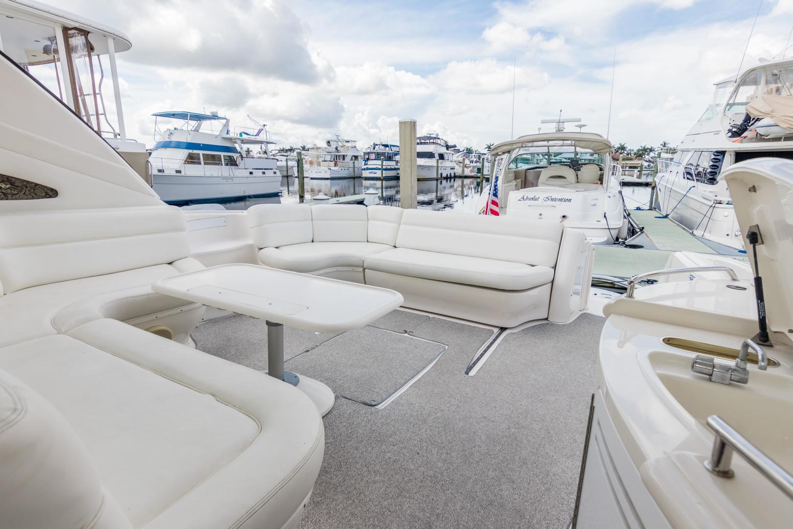 The Sea Ray 540 Sundancer, with its raised helm area design, gives the same amount of privacy and cabin space expected on an aft-cabin model, yet with all the open cockpit room of an express cruiser. On deck, the cockpit of the 540 Sundancer has a stylish sport spoiler, custom slide - swivel flip-up helm seat and Euro-styled companion bench seat. The U-shaped seating area has an electrically actuated retractable sunpad and there's an optional recessed sunpad available for the fore deck too. Even though the 540 Sundancer can be comfortably handled by two, you'll most likely want to share the wealth of standard features with family and friends, including a wet bar with cooler and icemaker, an aft cockpit sun shade, cable TV outlet and a Clarion AM-FM digital cassette stereo with six-disc CD changer subwoofer, amplifier, four speakers, and cockpit remote control. Even with so much of the cockpit dedicated to passenger space, there's also abundant room for personal gear in the port and starboard side compartments and docking equipment stows away neatly in the aft deck. The large private cabin of the 540 Sundancer is just as well-appointed as the cockpit with granite-colored countertops, dimmable lighting, and handcrafted wood trim in either vitricor cherry or clear maple finishes. Custom curtains, deep-pile stain-resistant carpet and concealed floor storage accentuate the modern decor. The mid-ship master stateroom has a queen-size bed with innerspring mattress and a gas-assisted hatch that reveals carpeted storage underneath. There's also a standard entertainment center with a TV - VCR - radio combination and a Bose Acoustimass 3 speaker system with remote control. A full-size bed and additional storage space make the guest stateroom perfect company. Both the master and guest head areas offer a VacuFlush head, power vents, striking cultured marble flooring, and Corian countertops with Grohe designer faucets. In the salon, a curved Ultraleather HP sofa cleverly hides an electric slide-out bed. There's even a concealed privacy curtain that pulls out when needed. The hidden, but complete galley has a three-burner cooktop, refrigerator - freezer with icemaker microwave - convection oven and a convenience package featuring a Spacemaker coffeemaker. In fact, all the comforts of home are present in the 540 Sundancer, right down to the standard washer - dryer combination and salon entertainment center with a color TV - VCR with remote and a Bose Lifestyle 20 stereo system with Jewel Cube speakers and LS bass module. From a technical standpoint, this boat is a masterpiece with responsive twin Caterpillar 3196 660HP and every control needed for unquestionably smooth sailing including a full Raytheon electronics package. The 540 Sundancer has a multiplexed digital LCC systems monitor for quick engine diagnostics and pump monitoring. The 15 kW Westerbeke remote generator has its own instrument panel, and there are also four large 8-D batteries with main battery solenoids and a distribution panel for power monitor The 540 Sundancer has a fiberglass hardtop.Disclaimer