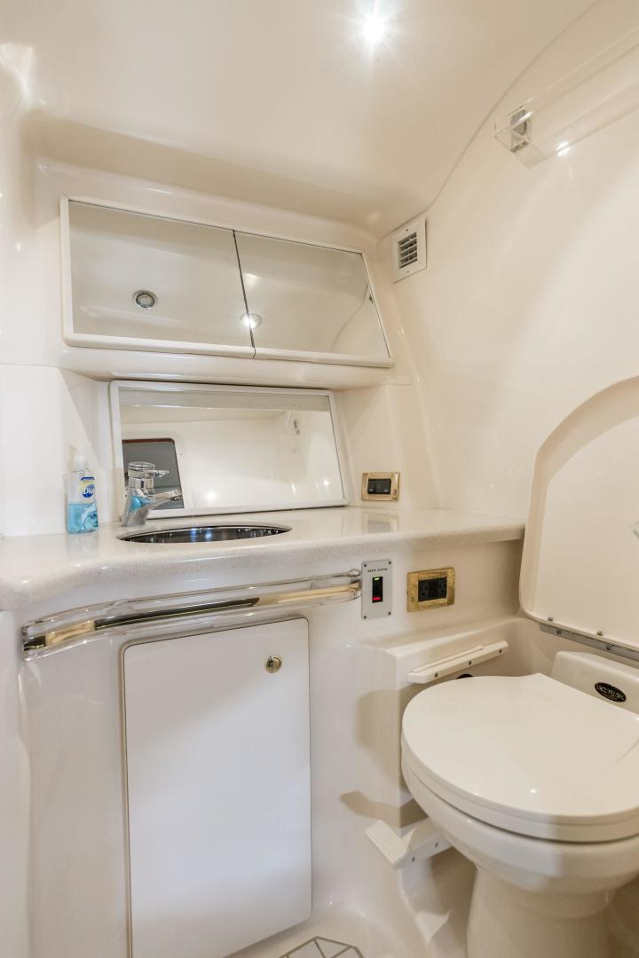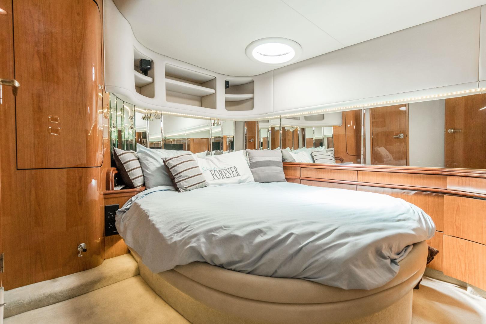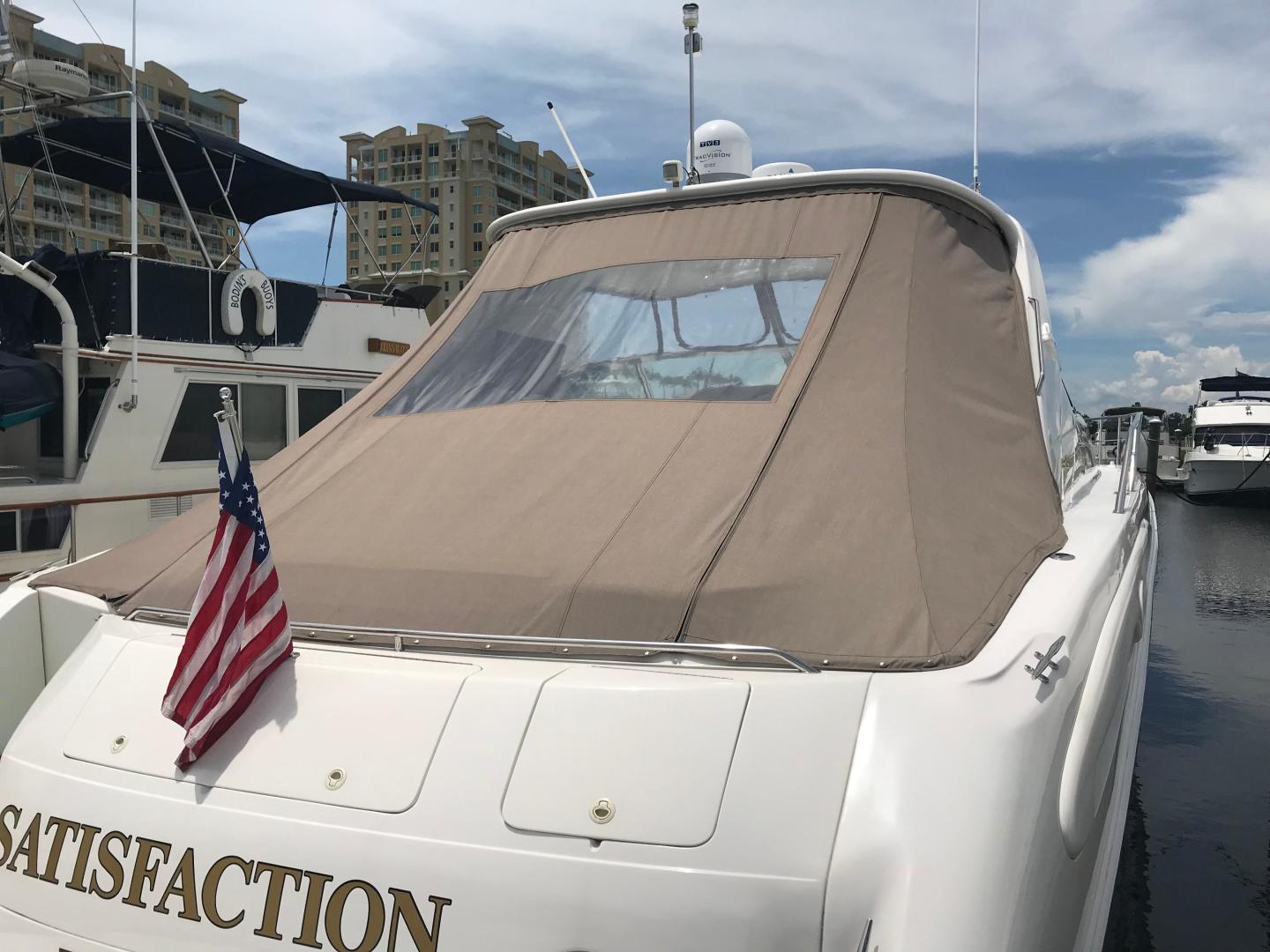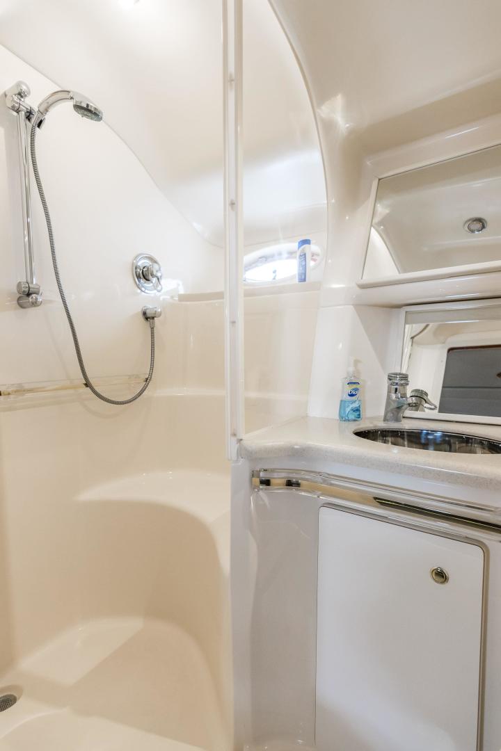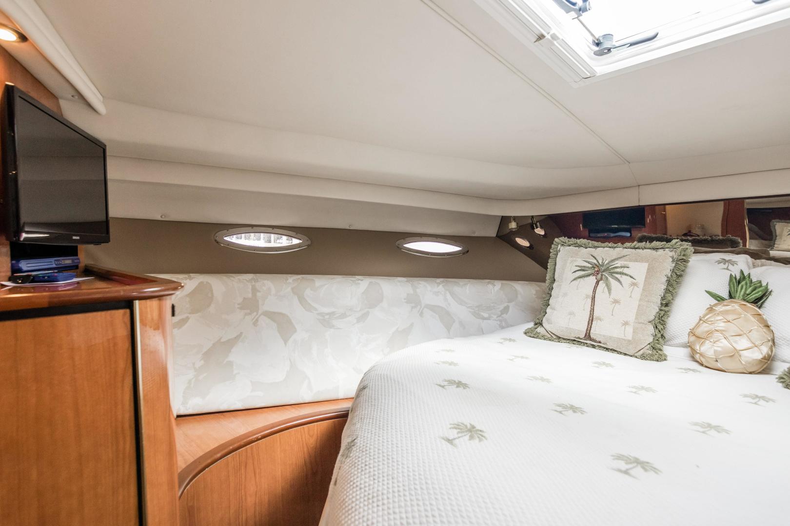 The Sea Ray 540 Sundancer, with its raised helm area design, gives the same amount of privacy and cabin space expected on an aft-cabin model, yet with all the open cockpit room of an express cruiser. On deck, the cockpit of the 540 Sundancer has a stylish sport spoiler, custom slide - swivel flip-up helm seat and Euro-styled companion bench seat. The U-shaped seating area has an electrically actuated retractable sunpad and there's an optional recessed sunpad available for the fore deck too. Even though the 540 Sundancer can be comfortably handled by two, you'll most likely want to share the wealth of standard features with family and friends, including a wet bar with cooler and icemaker, an aft cockpit sun shade, cable TV outlet and a Clarion AM-FM digital cassette stereo with six-disc CD changer subwoofer, amplifier, four speakers, and cockpit remote control. Even with so much of the cockpit dedicated to passenger space, there's also abundant room for personal gear in the port and starboard side compartments and docking equipment stows away neatly in the aft deck. The large private cabin of the 540 Sundancer is just as well-appointed as the cockpit with granite-colored countertops, dimmable lighting, and handcrafted wood trim in either vitricor cherry or clear maple finishes. Custom curtains, deep-pile stain-resistant carpet and concealed floor storage accentuate the modern decor. The mid-ship master stateroom has a queen-size bed with innerspring mattress and a gas-assisted hatch that reveals carpeted storage underneath. There's also a standard entertainment center with a TV - VCR - radio combination and a Bose Acoustimass 3 speaker system with remote control. A full-size bed and additional storage space make the guest stateroom perfect company. Both the master and guest head areas offer a VacuFlush head, power vents, striking cultured marble flooring, and Corian countertops with Grohe designer faucets. In the salon, a curved Ultraleather HP sofa cleverly hides an electric slide-out bed. There's even a concealed privacy curtain that pulls out when needed. The hidden, but complete galley has a three-burner cooktop, refrigerator - freezer with icemaker microwave - convection oven and a convenience package featuring a Spacemaker coffeemaker. In fact, all the comforts of home are present in the 540 Sundancer, right down to the standard washer - dryer combination and salon entertainment center with a color TV - VCR with remote and a Bose Lifestyle 20 stereo system with Jewel Cube speakers and LS bass module. From a technical standpoint, this boat is a masterpiece with responsive twin Caterpillar 3196 660HP and every control needed for unquestionably smooth sailing including a full Raytheon electronics package. The 540 Sundancer has a multiplexed digital LCC systems monitor for quick engine diagnostics and pump monitoring. The 15 kW Westerbeke remote generator has its own instrument panel, and there are also four large 8-D batteries with main battery solenoids and a distribution panel for power monitor The 540 Sundancer has a fiberglass hardtop.Disclaimer