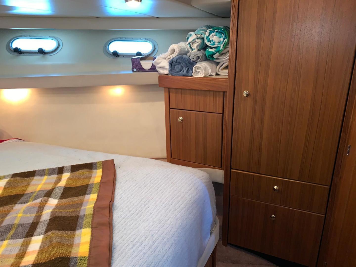 The Bayliner 4788 Pilot House Motoryacht combines comfort, an elegant line, and luxury features. The large bridge deck, with its fully-appointed helm and generous lounge seating, allows captain and guests to enjoy the view together. The 4788 features a wide lounge seat sculpted into the foredeck for sunning, a large transom door for easy access to the broad boarding platform, and generous side decks with grab rails for extra security. The master suite includes a large double berth, twin hanging lockers, a separate dressing room with settee that converts to upper and lower bunks, and a private bath with large vanity and enclosed tub. The midship stateroom offers another a double berth and across the companionway is a second bath complete with shower. The 4788 features a fully equipped electric galley, large salon windows, and unencumbered movement throughout the vessel. Standard equipment includes Raytheon radar, AutoHelm autopilot, electric anchor windlass, and davit with electric winch.