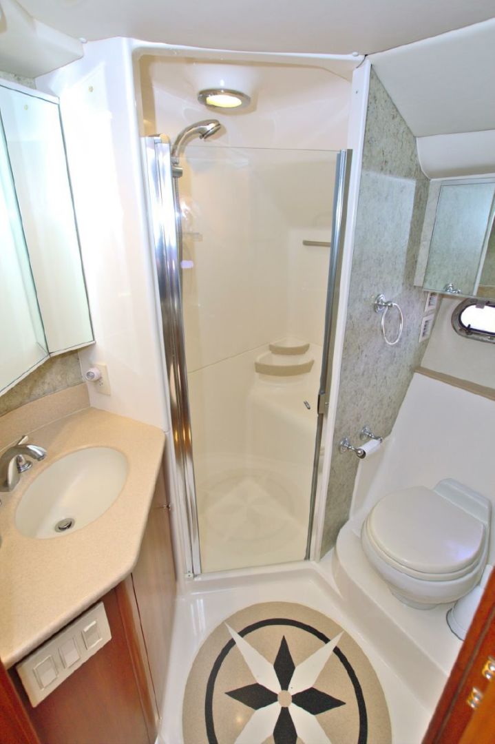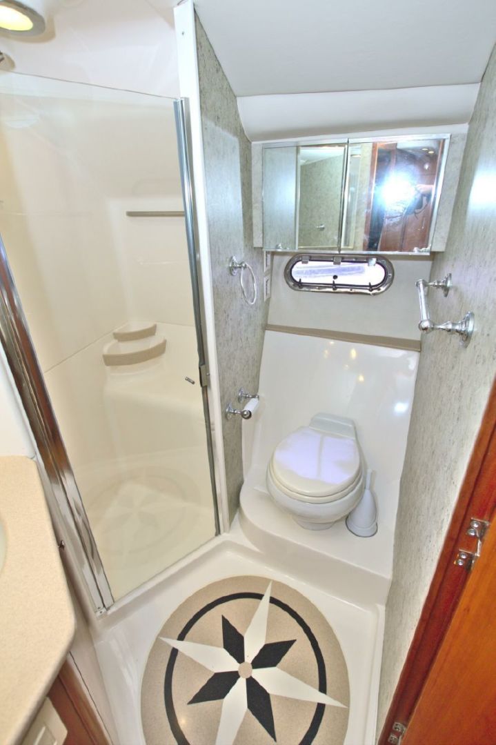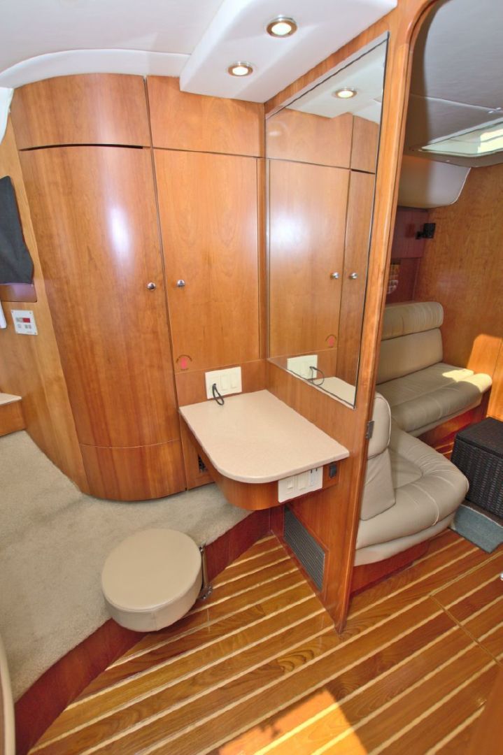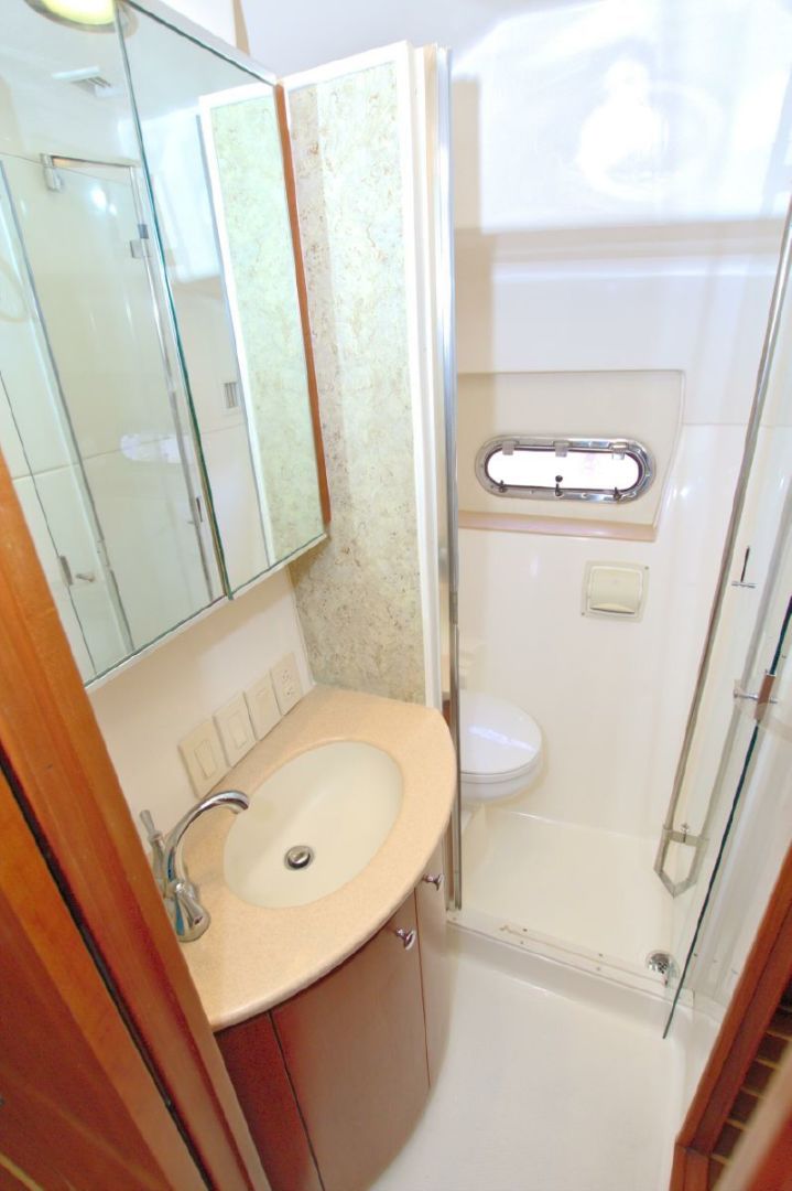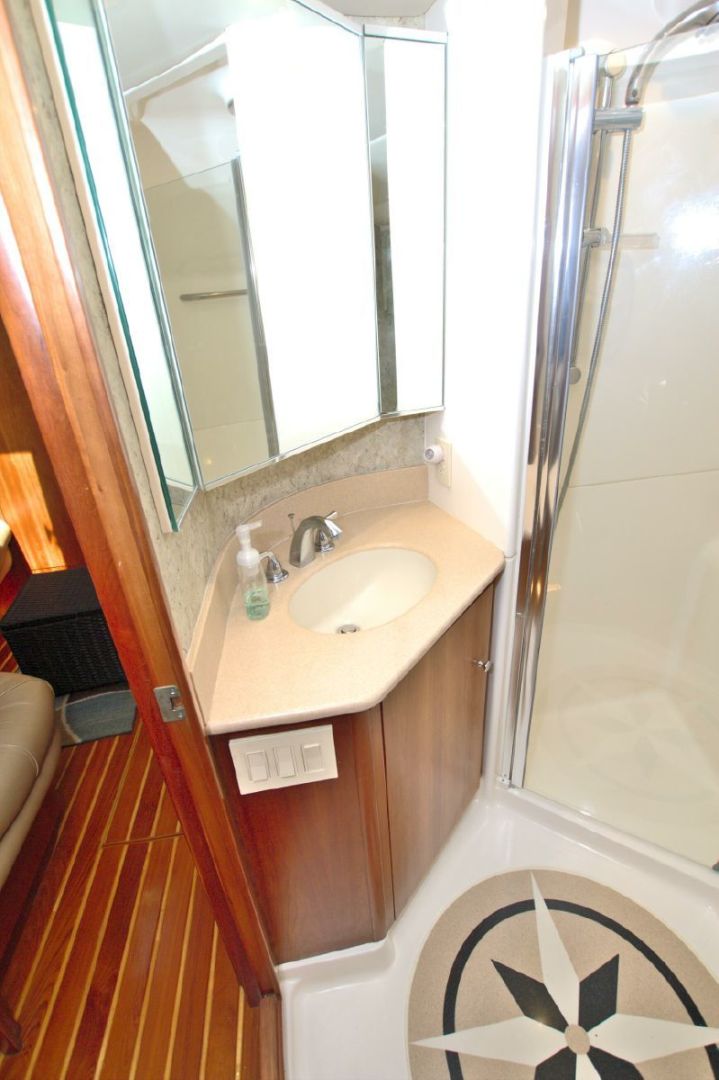 - Vanity to Starboard with Mirror and Swing Out Pedestal