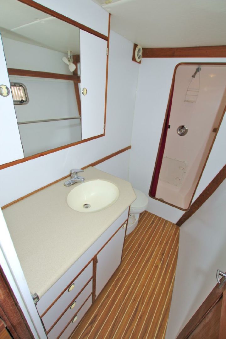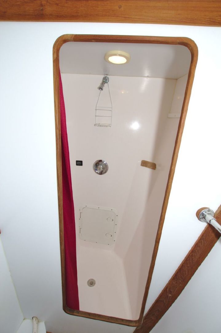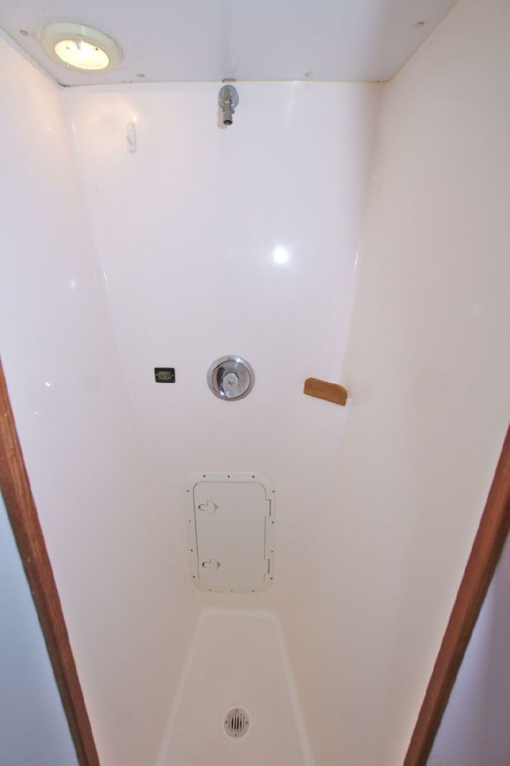 - Full Separate stand-up fiberglass shower stall with overboard pump outs
