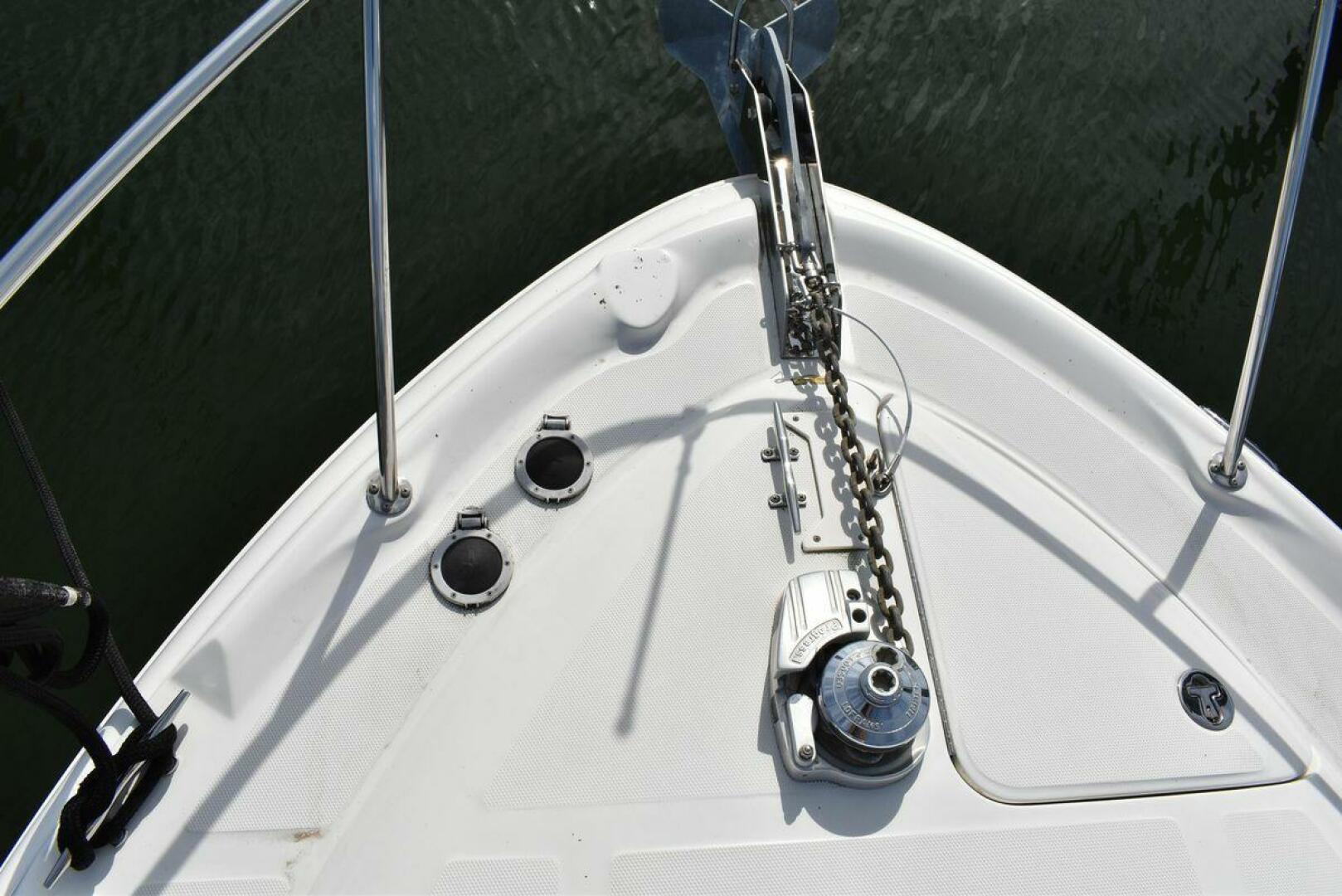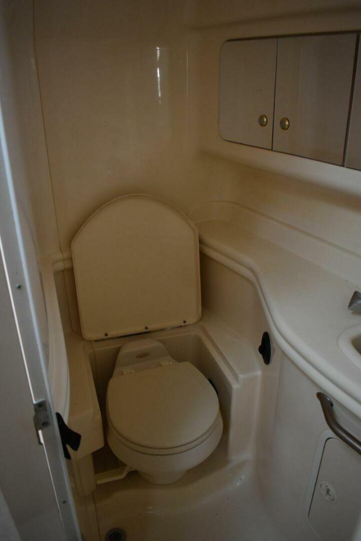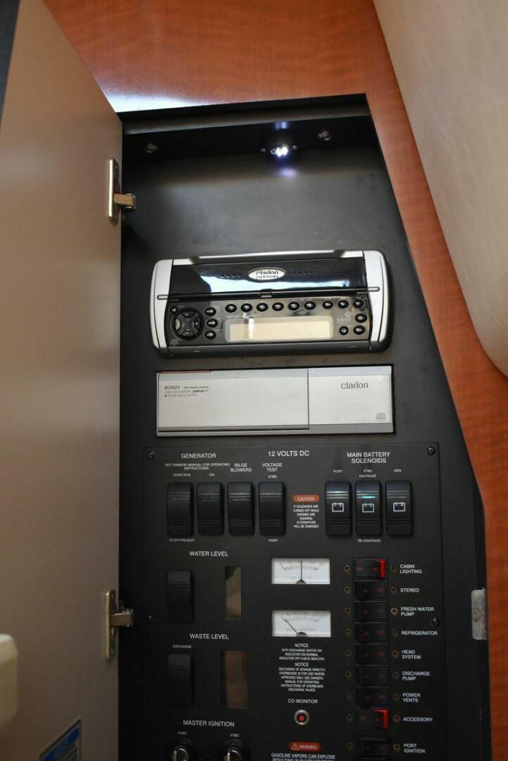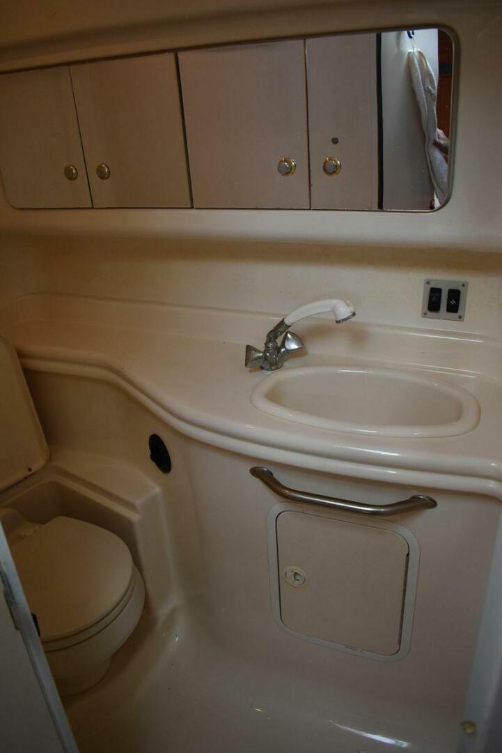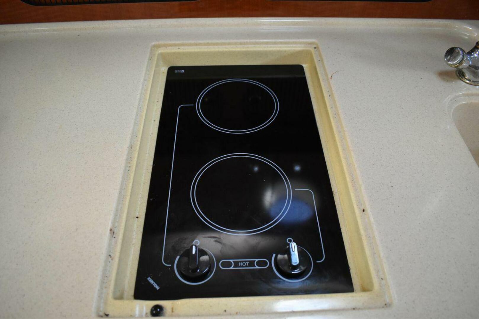 Interior height is a roomy 6’ 4”, and is in excellent condition. This boat includes a 5kw Kohler generator with 223hrs on it, to keep the A/C running while at anchor. The single air conditioner was just serviced as well. A head with a 28-gallon holding tank and deck fitting pump out. Service records available. The spacious galley includes a refrigerator, microwave, and 2 burner electric stove, so you can prepare meals for friends and family while on board. The forward stateroom offers a queen-size centerline berth, while the mid-cabin provides ample sleeping space for guests. Plenty of storage space as well. The head features a shower, sink, and Vacuflush toilet.