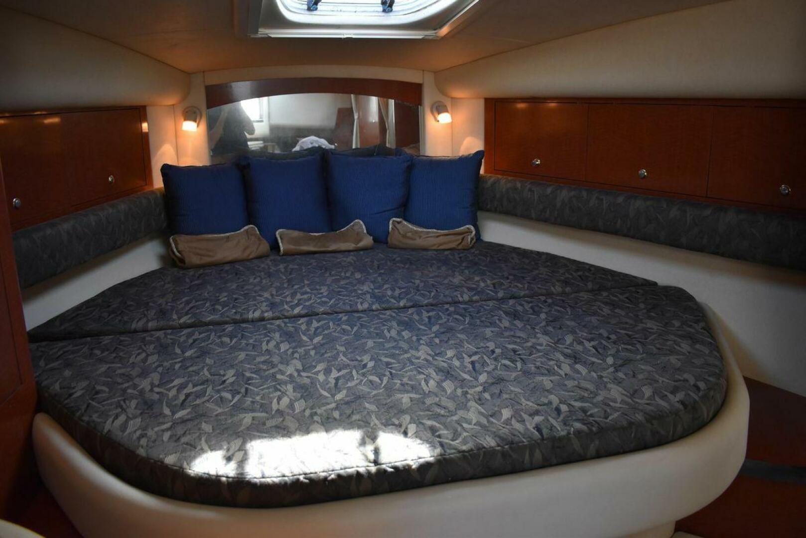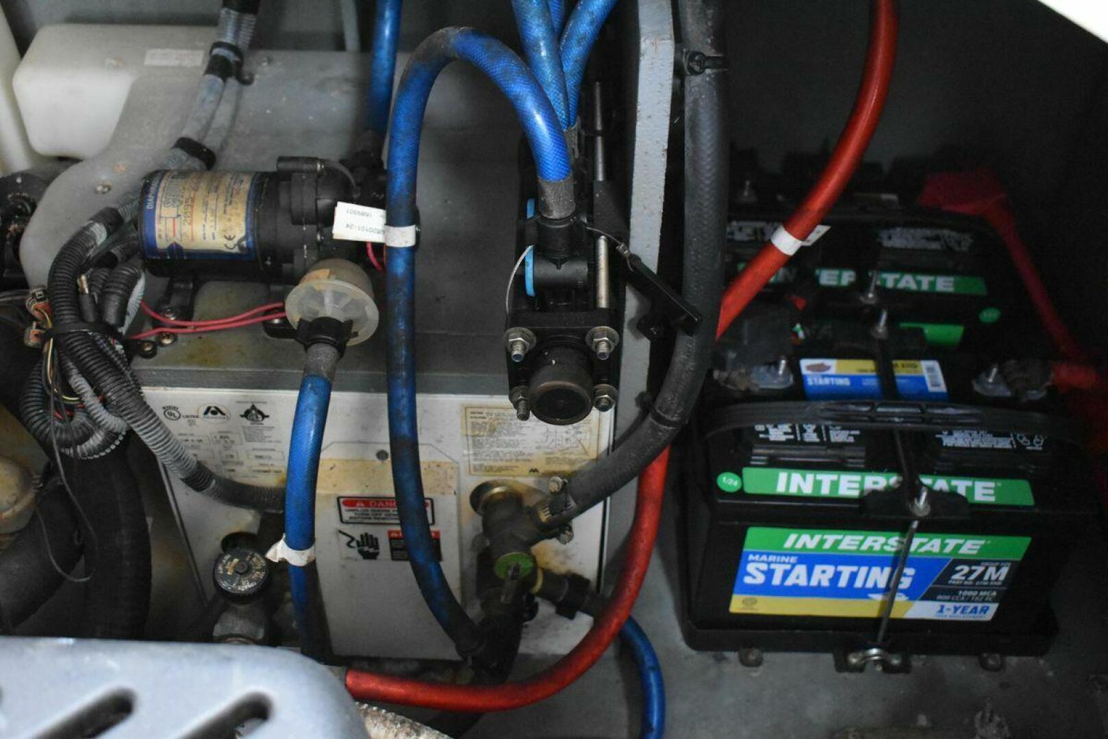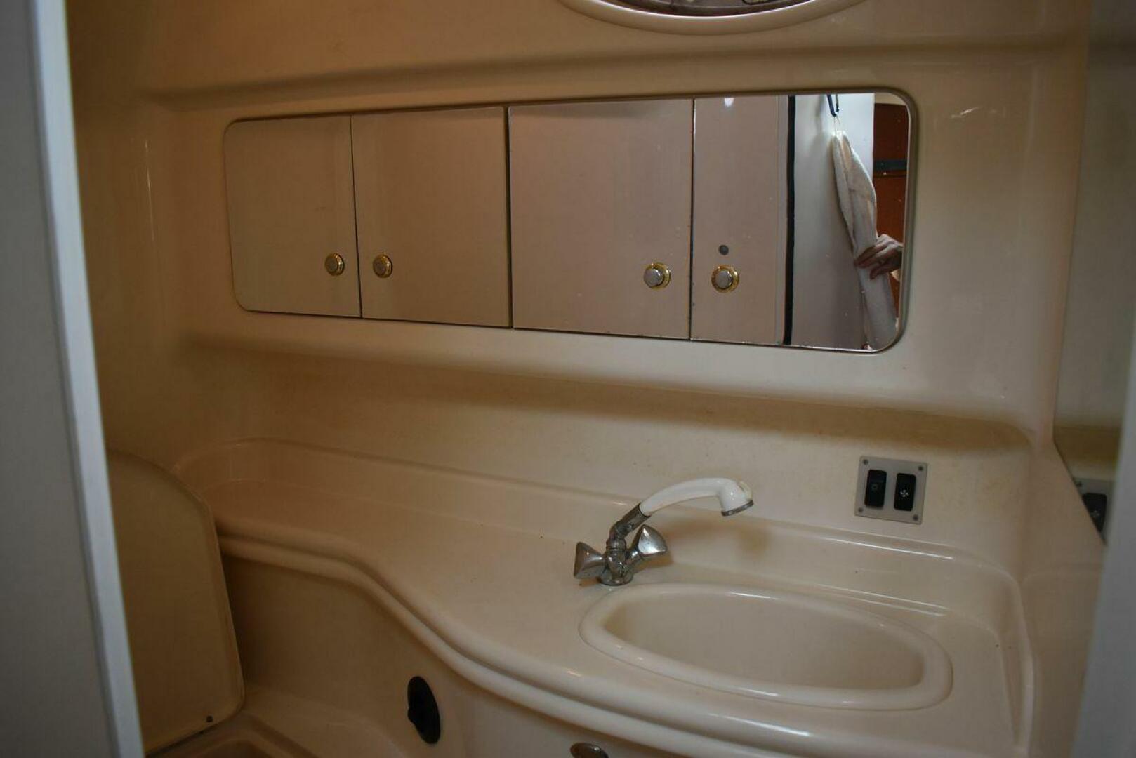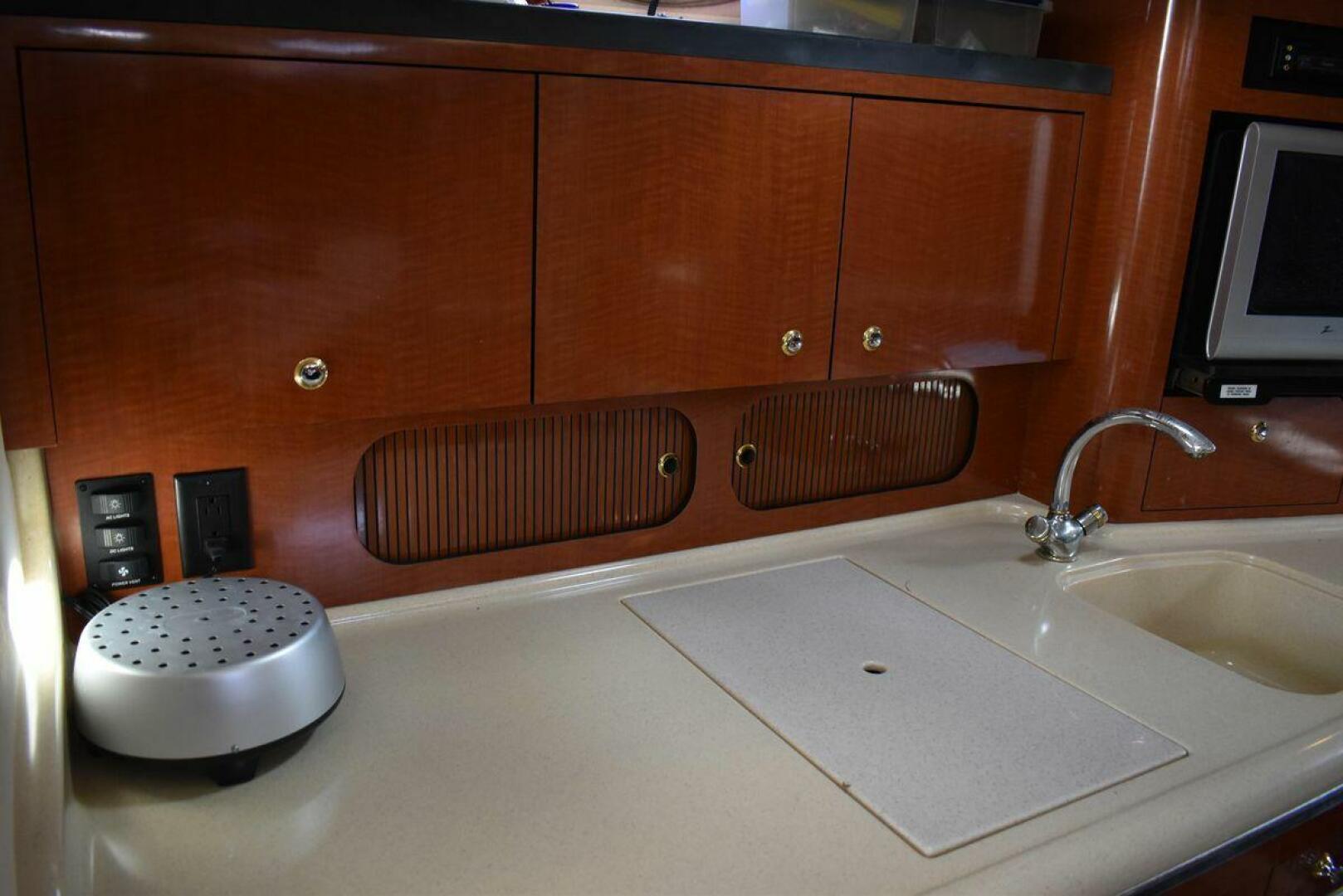 Interior height is a roomy 6’ 4”, and is in excellent condition. This boat includes a 5kw Kohler generator with 223hrs on it, to keep the A/C running while at anchor. The single air conditioner was just serviced as well. A head with a 28-gallon holding tank and deck fitting pump out. Service records available. The spacious galley includes a refrigerator, microwave, and 2 burner electric stove, so you can prepare meals for friends and family while on board. The forward stateroom offers a queen-size centerline berth, while the mid-cabin provides ample sleeping space for guests. Plenty of storage space as well. The head features a shower, sink, and Vacuflush toilet.