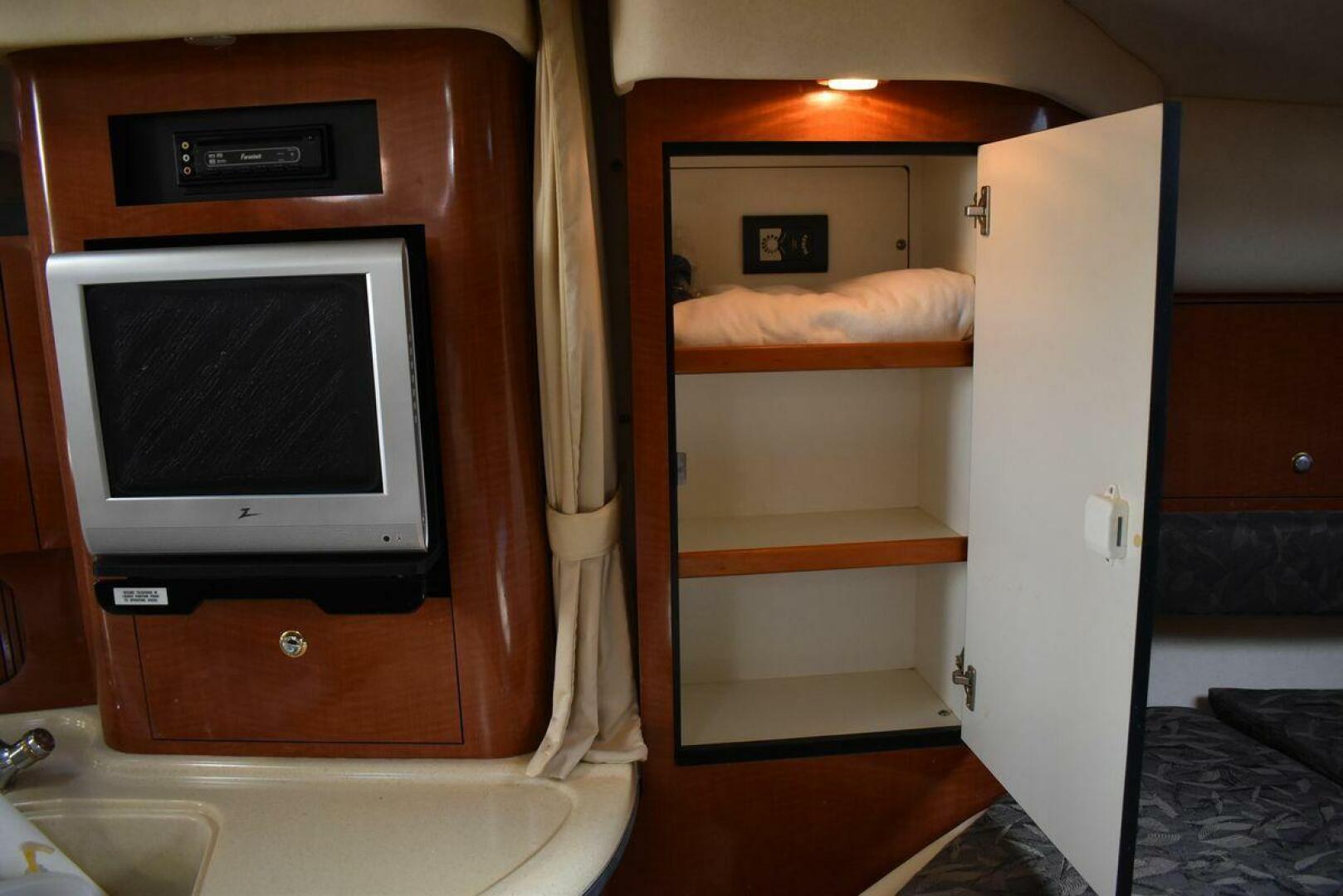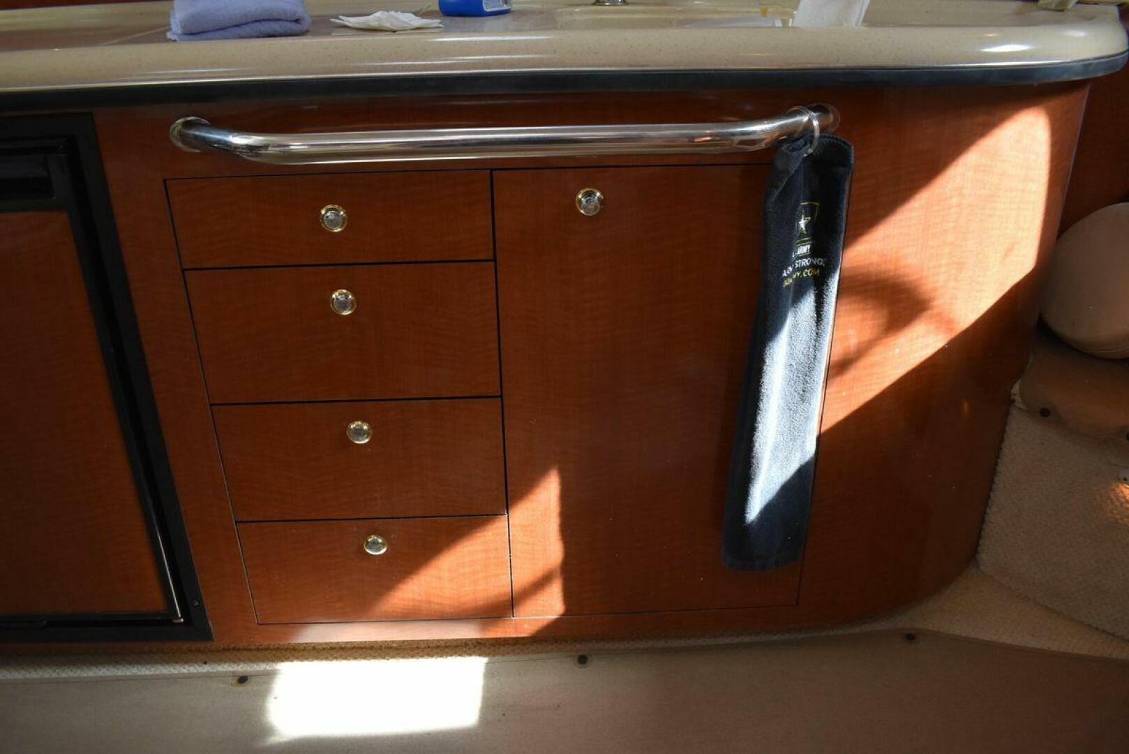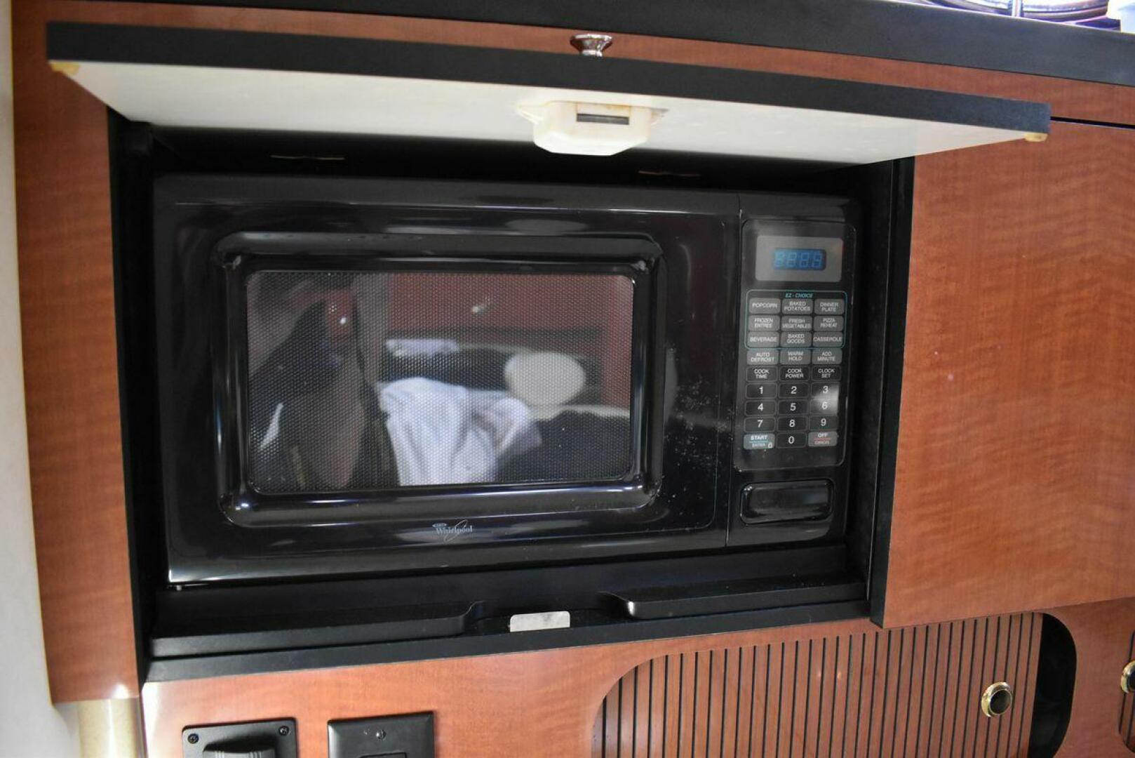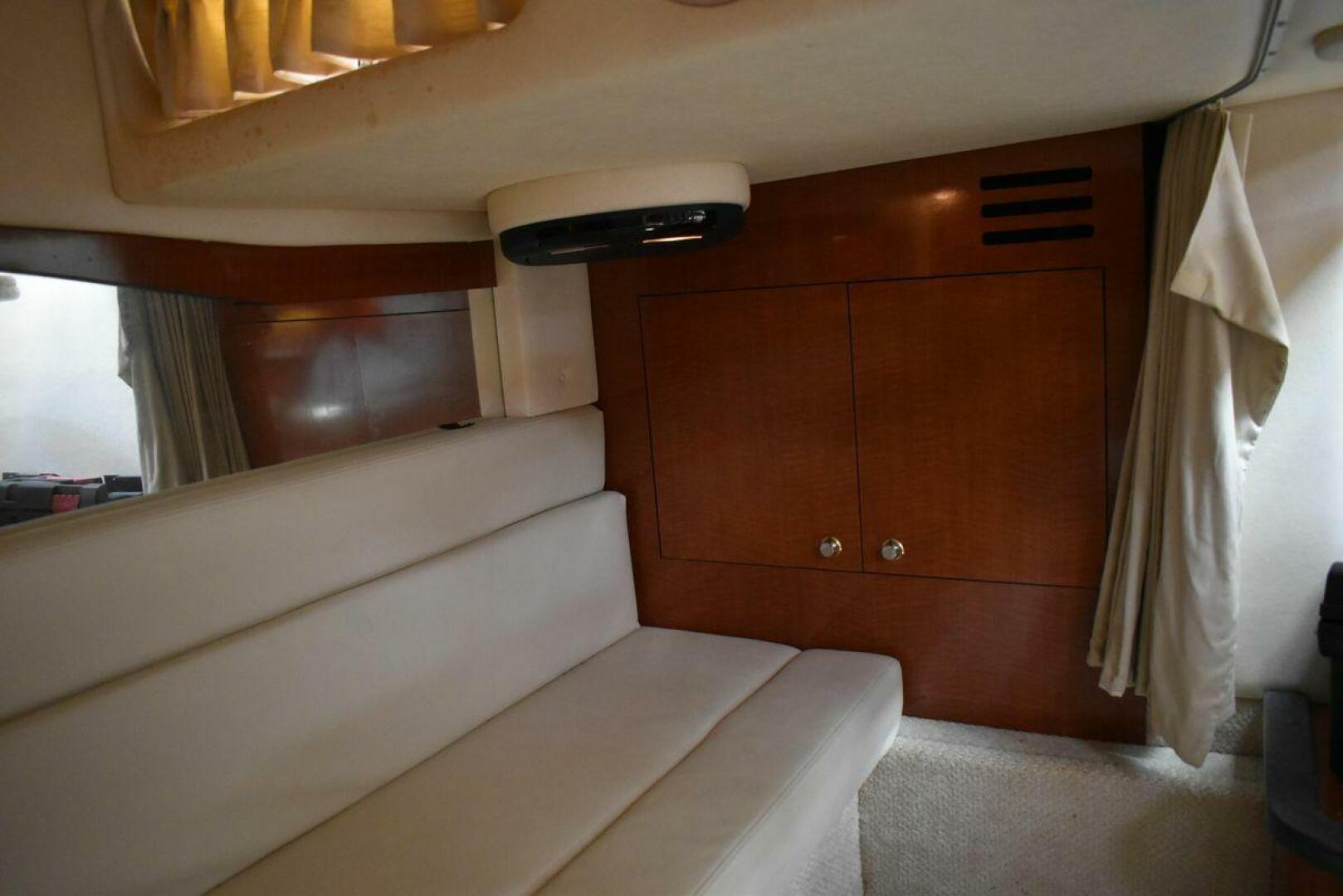 Interior height is a roomy 6’ 4”, and is in excellent condition. This boat includes a 5kw Kohler generator with 223hrs on it, to keep the A/C running while at anchor. The single air conditioner was just serviced as well. A head with a 28-gallon holding tank and deck fitting pump out. Service records available. The spacious galley includes a refrigerator, microwave, and 2 burner electric stove, so you can prepare meals for friends and family while on board. The forward stateroom offers a queen-size centerline berth, while the mid-cabin provides ample sleeping space for guests. Plenty of storage space as well. The head features a shower, sink, and Vacuflush toilet.