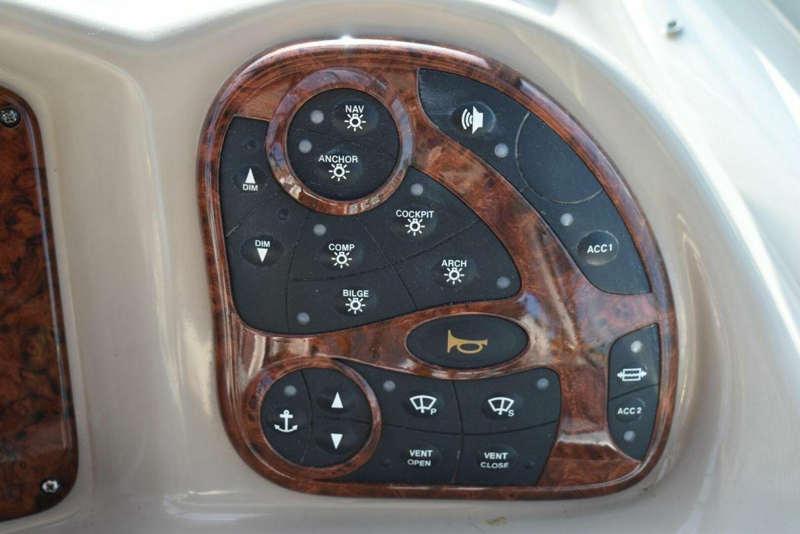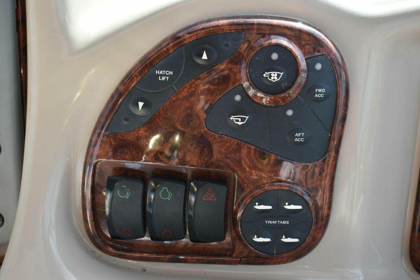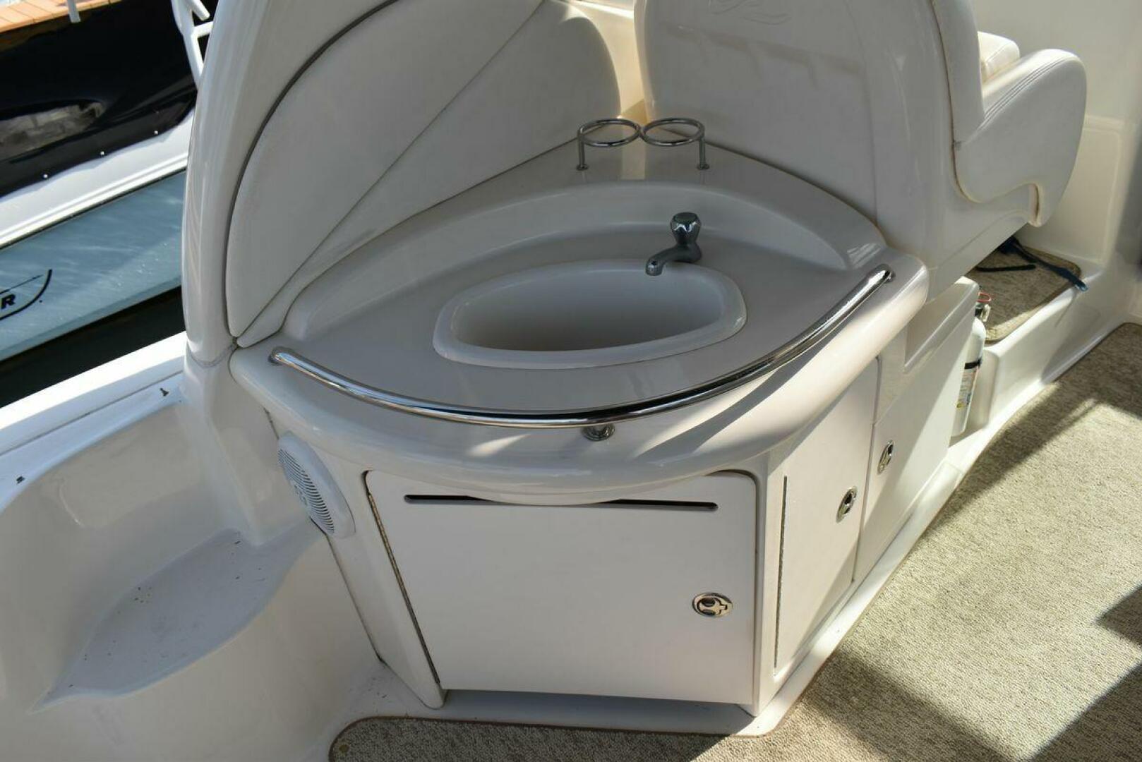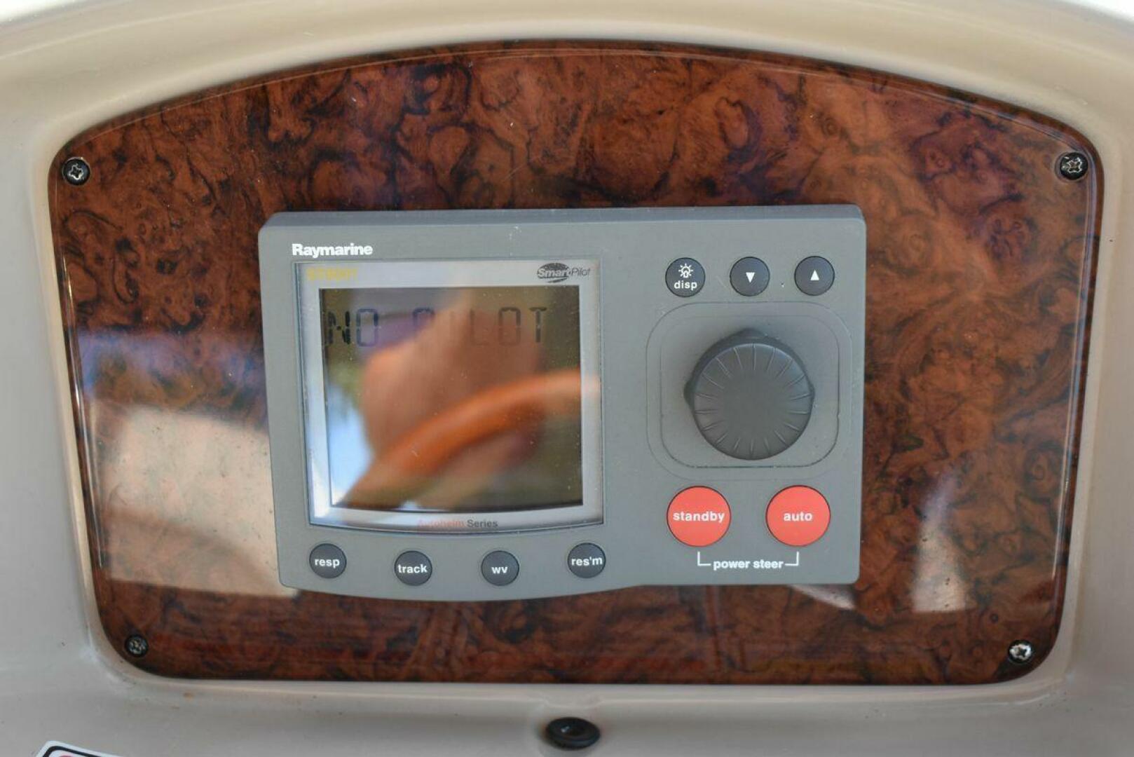 Interior height is a roomy 6’ 4”, and is in excellent condition. This boat includes a 5kw Kohler generator with 223hrs on it, to keep the A/C running while at anchor. The single air conditioner was just serviced as well. A head with a 28-gallon holding tank and deck fitting pump out. Service records available. The spacious galley includes a refrigerator, microwave, and 2 burner electric stove, so you can prepare meals for friends and family while on board. The forward stateroom offers a queen-size centerline berth, while the mid-cabin provides ample sleeping space for guests. Plenty of storage space as well. The head features a shower, sink, and Vacuflush toilet.