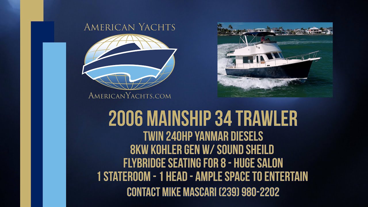 Explore the water in comfort and style with this well-equipped 2006 Mainship 34 Trawler—a true cruising flagship built for liveaboards and long-range adventurers. Featuring twin 240HP fresh water–cooled Yanmar diesel engines, dual-zone air conditioning and heat, 8kW Kohler generator, and flybridge.
