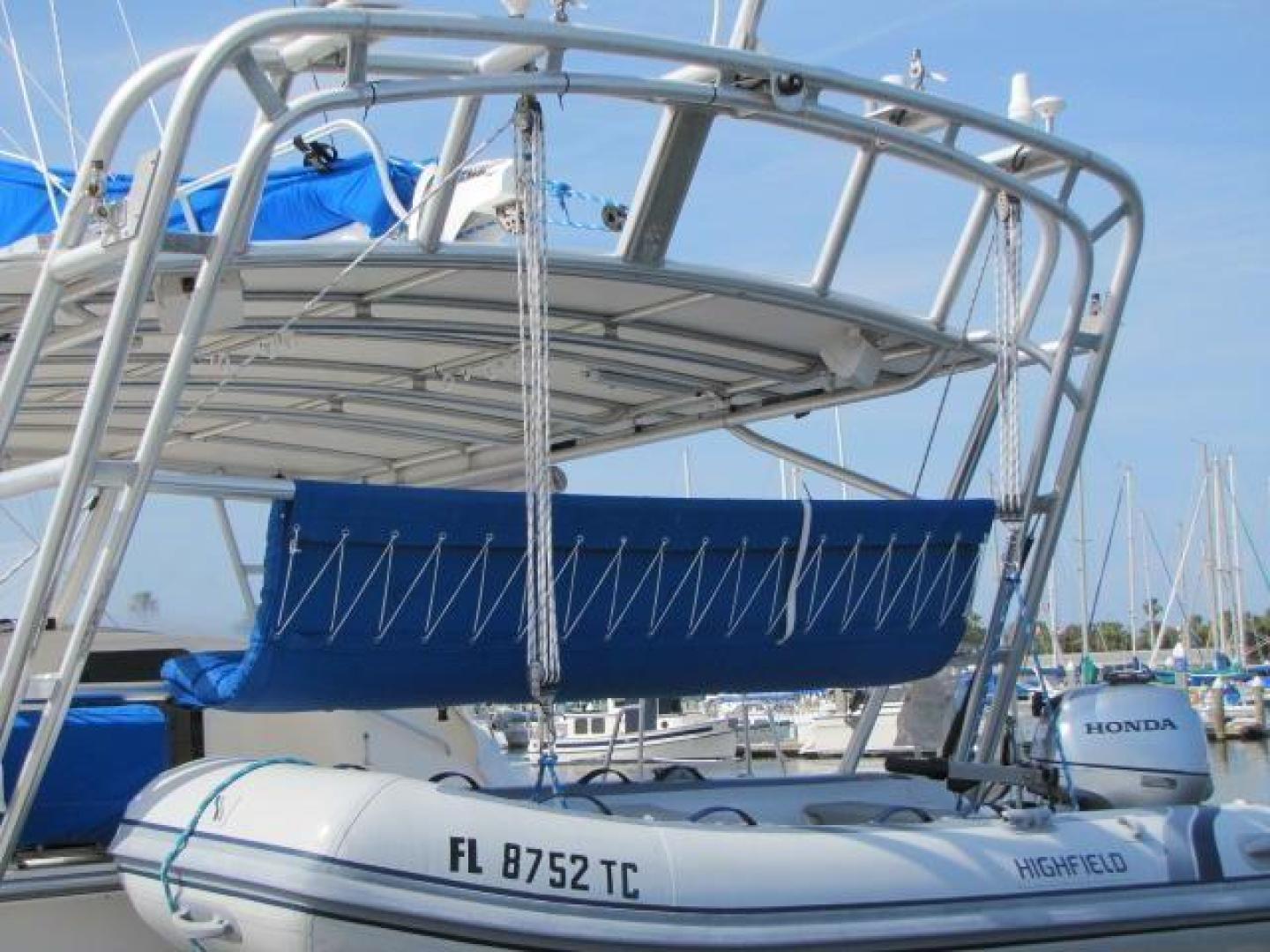 - Dinghy lift system is multi purchase block and tackle mounted to the RADAR arch.