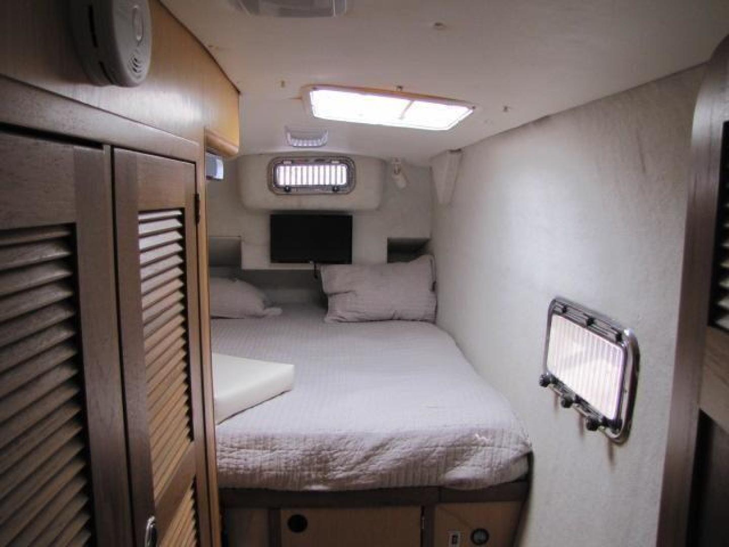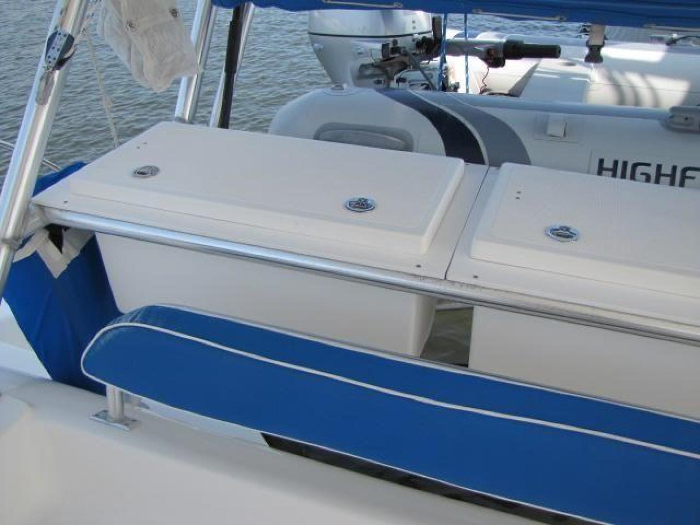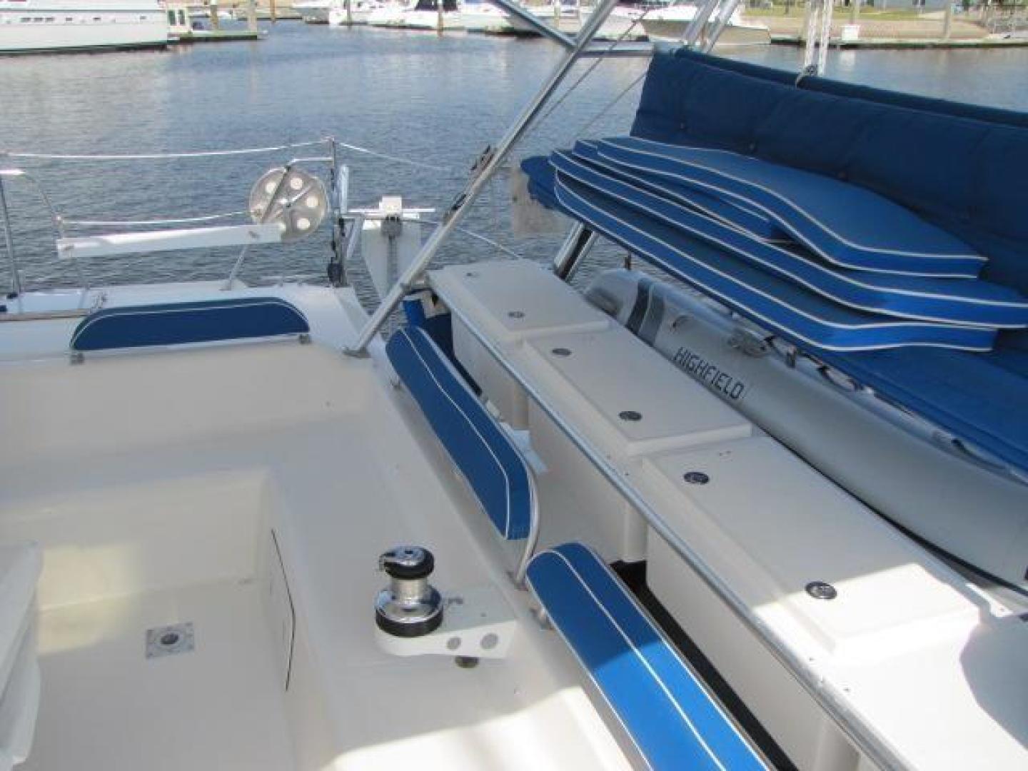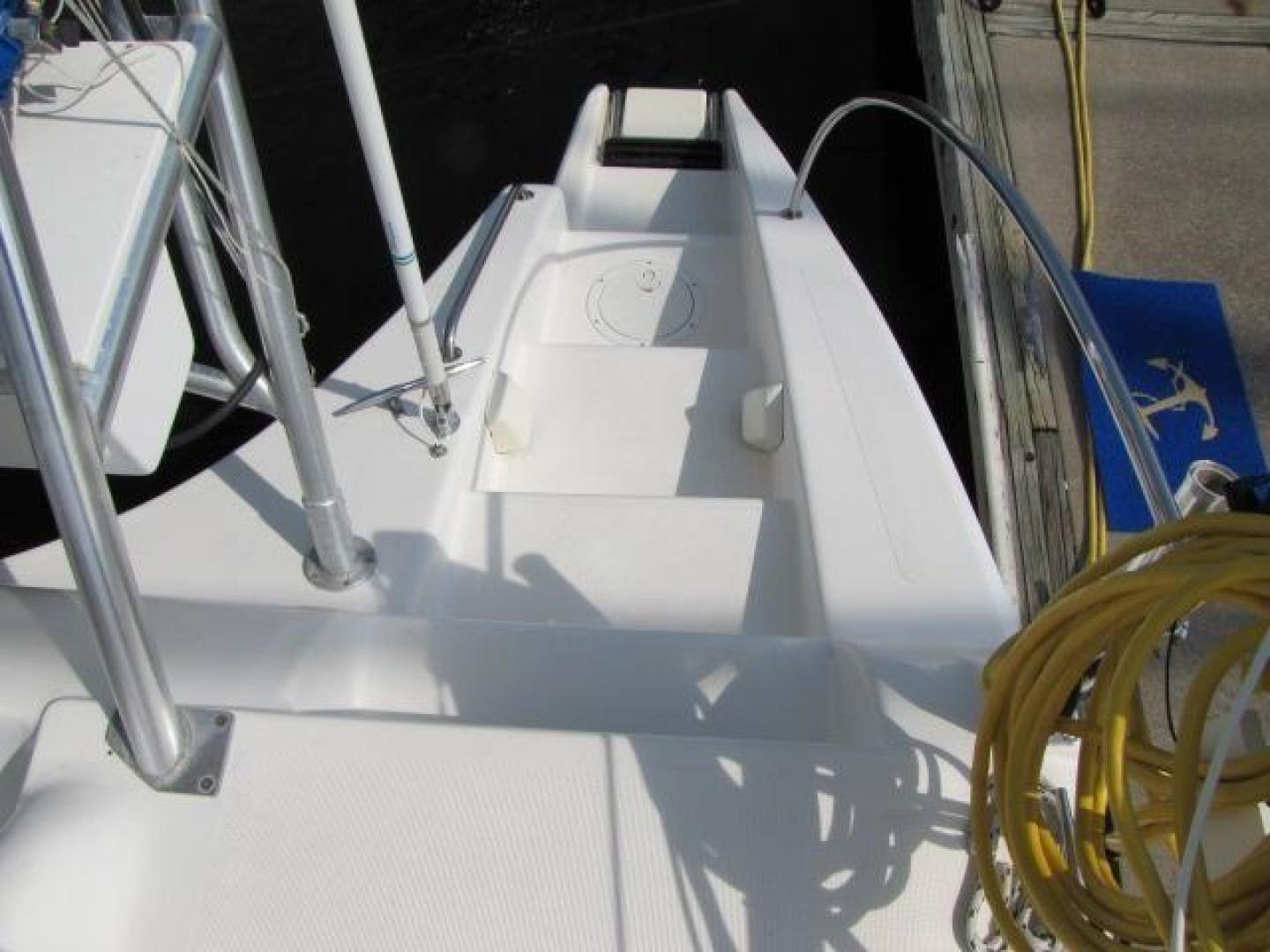 Entry onto the boat is through gates both port and starboard or by stepping directly on the aft steps. The entry to the interior is through a true sea hatch/door. This door can be closed and made water tight from either side. The high threshold insures keeping the sea outside the boat. Once inside there is an L-shaped settee to starboard with an adjustable solid surface top. Forward to port is a large refrigerator and deep freeze. Maybe the best I've had the pleasure to use. To port is the chart table with storge under the lid. Also in this cabinet is the electrical panel. Aft to port is the full functional galley. To starboard of the galley is a large wet hanging locker. Down three steps to port you enter the dedicated master. The berth is aft, the head is forward and walkthrough between has shelves outboard and a large pantry inboard. Down into the starboard hull is a full athwartship berth aft, a head with shower and the forward cabin with a large single berth. Most manta owners use the forward berth for the "garage storage".