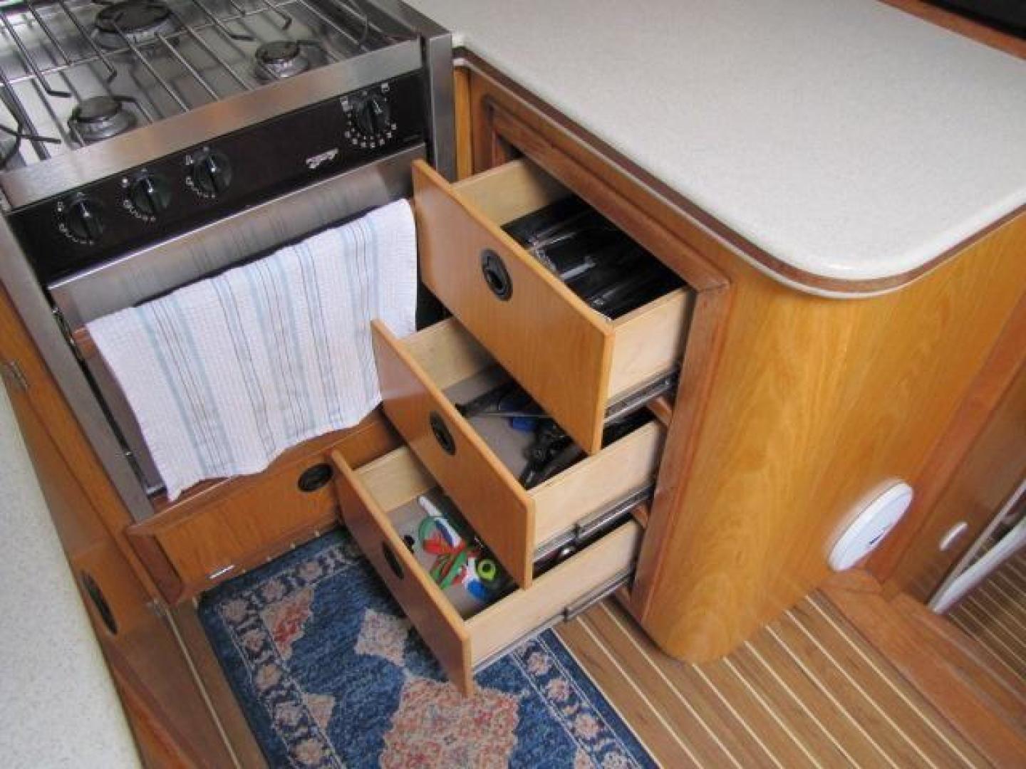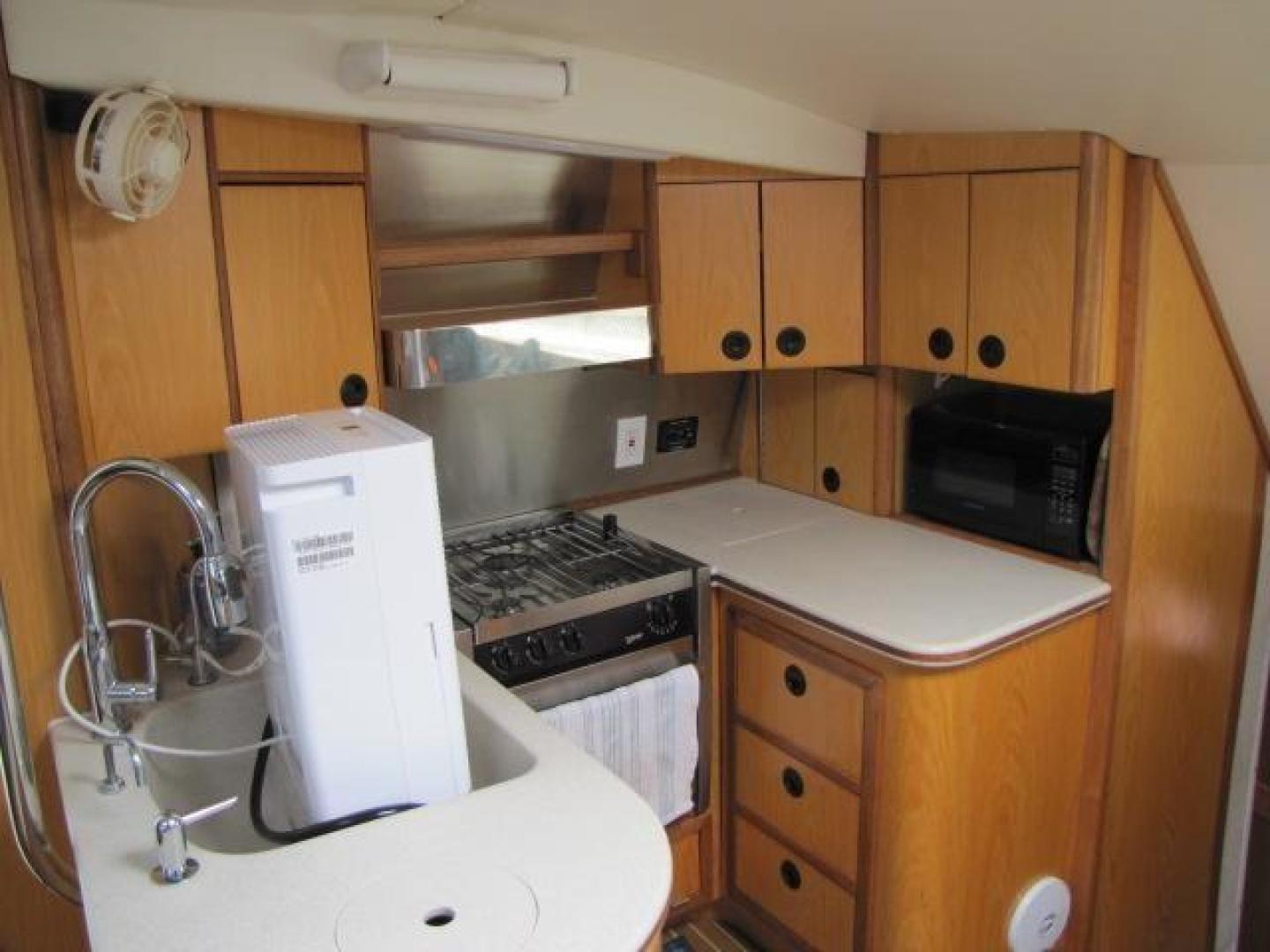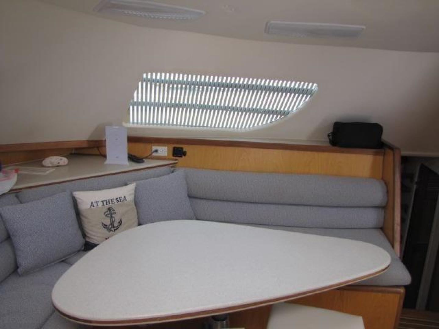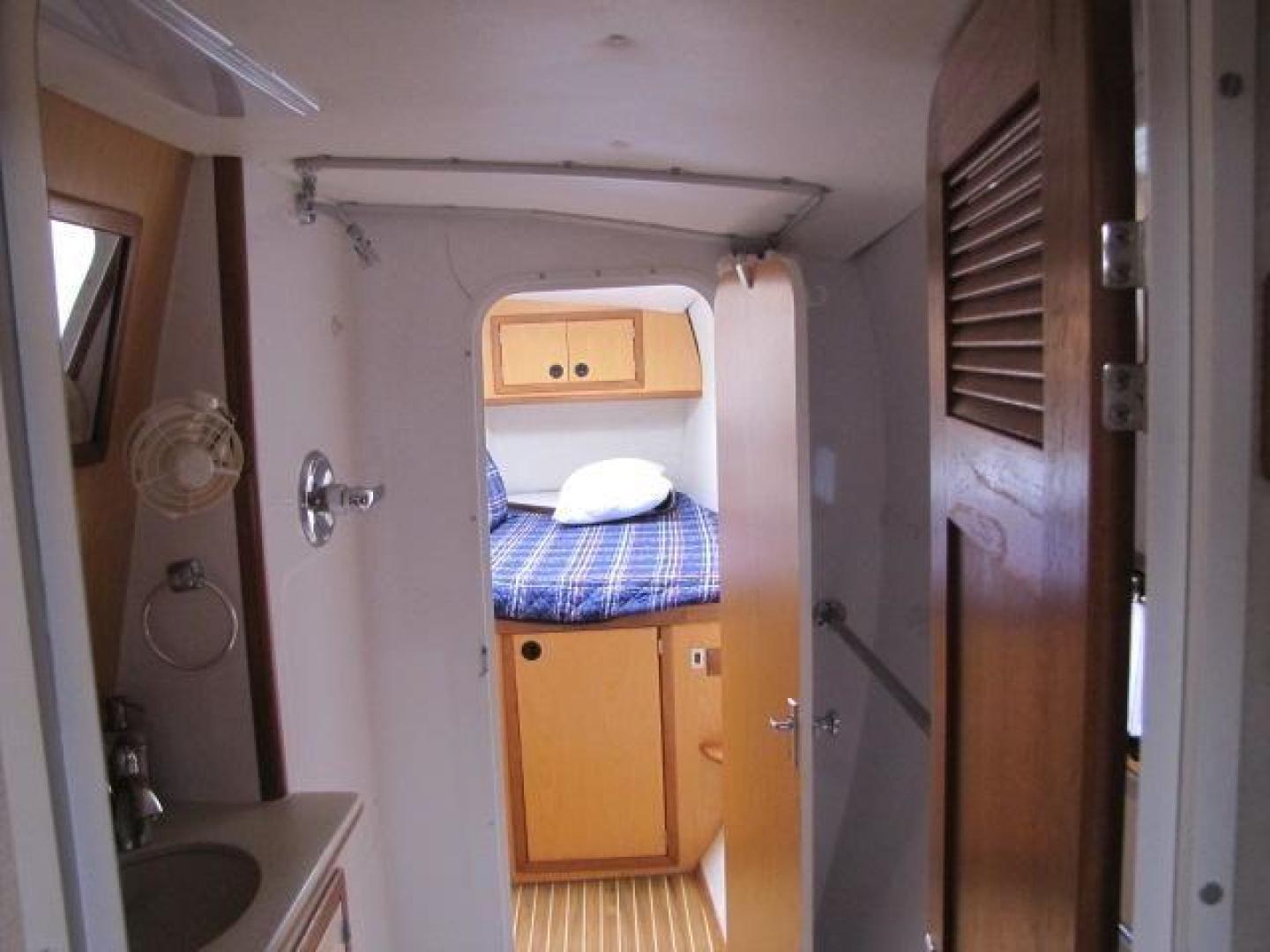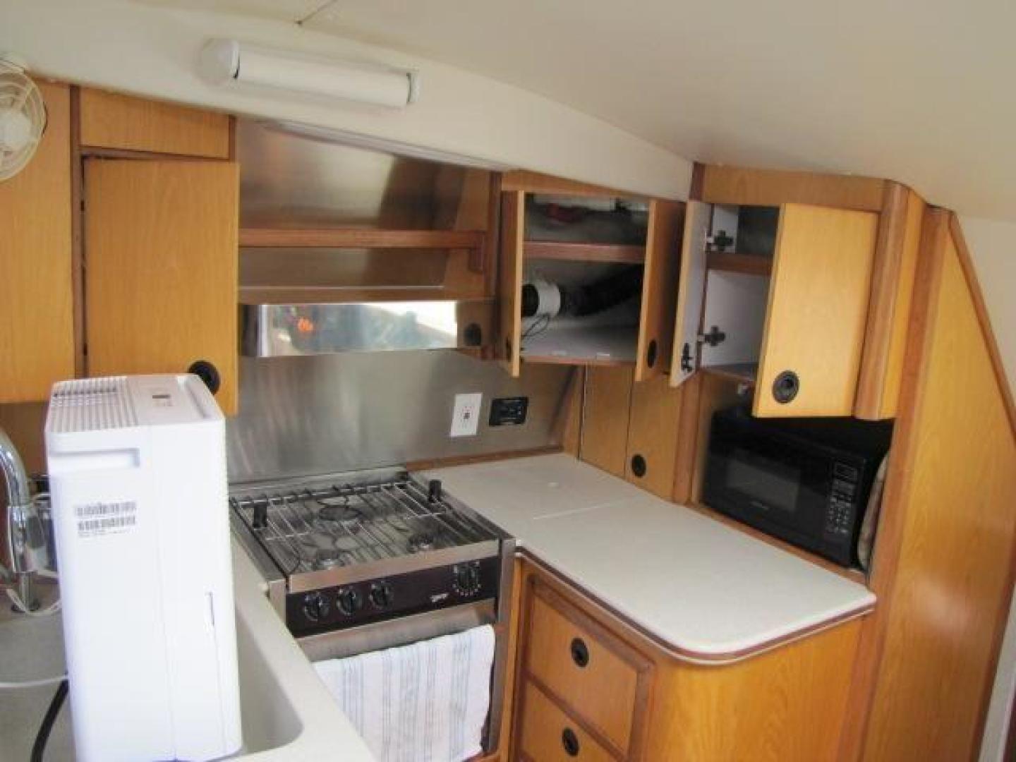 Entry onto the boat is through gates both port and starboard or by stepping directly on the aft steps. The entry to the interior is through a true sea hatch/door. This door can be closed and made water tight from either side. The high threshold insures keeping the sea outside the boat. Once inside there is an L-shaped settee to starboard with an adjustable solid surface top. Forward to port is a large refrigerator and deep freeze. Maybe the best I've had the pleasure to use. To port is the chart table with storge under the lid. Also in this cabinet is the electrical panel. Aft to port is the full functional galley. To starboard of the galley is a large wet hanging locker. Down three steps to port you enter the dedicated master. The berth is aft, the head is forward and walkthrough between has shelves outboard and a large pantry inboard. Down into the starboard hull is a full athwartship berth aft, a head with shower and the forward cabin with a large single berth. Most manta owners use the forward berth for the "garage storage".