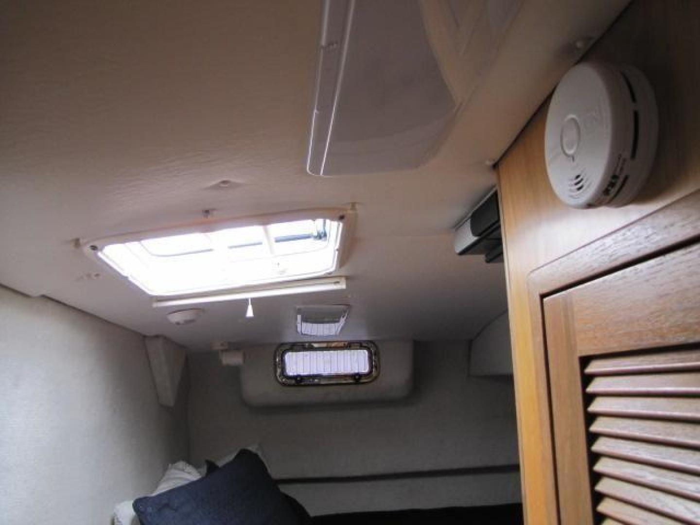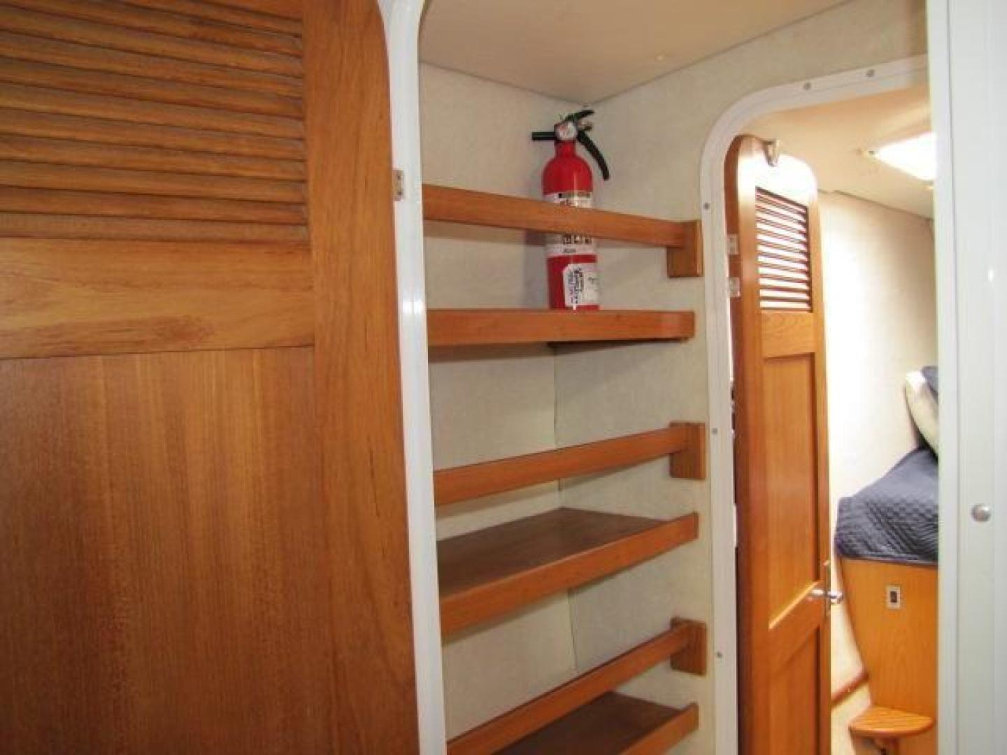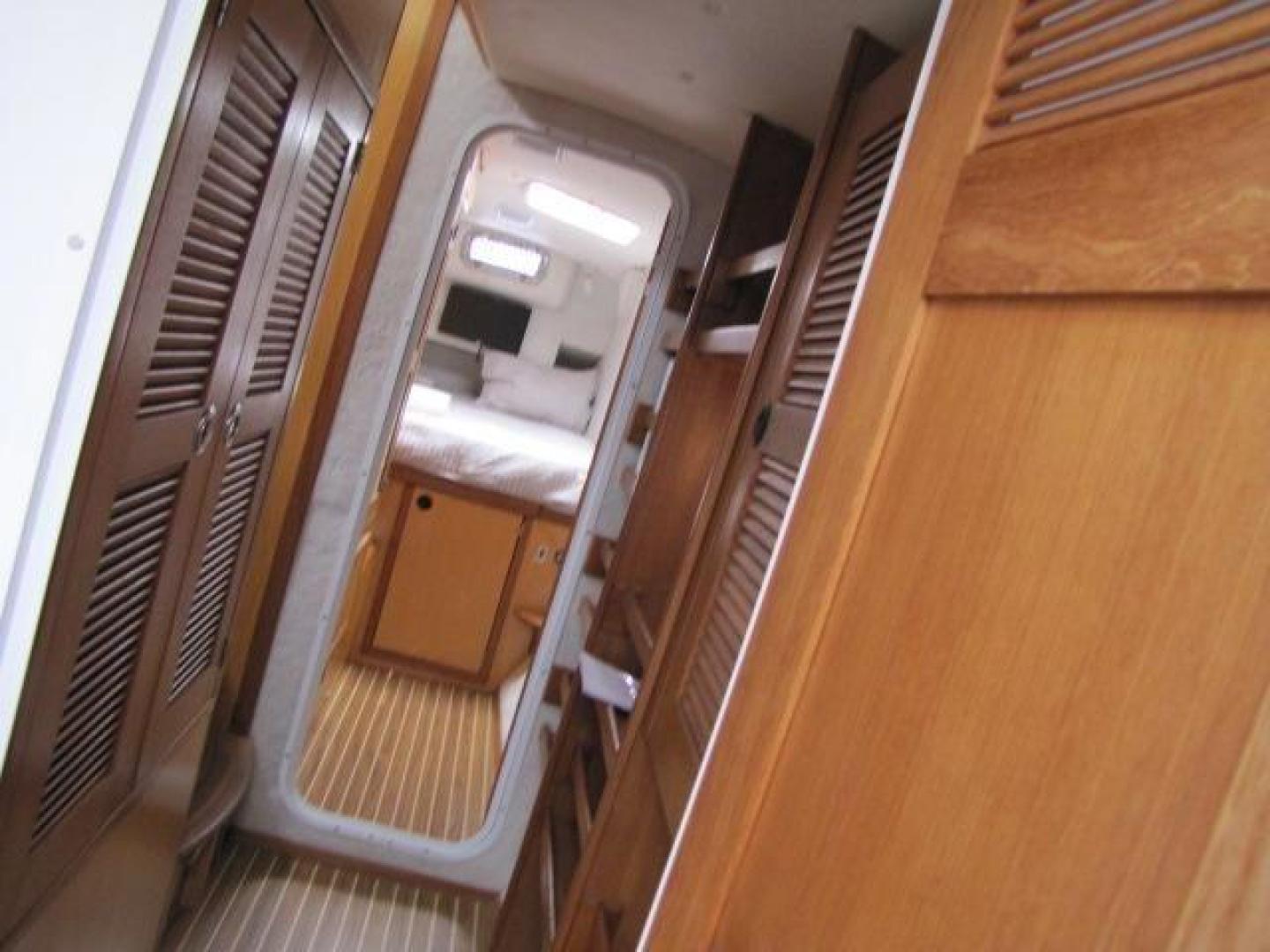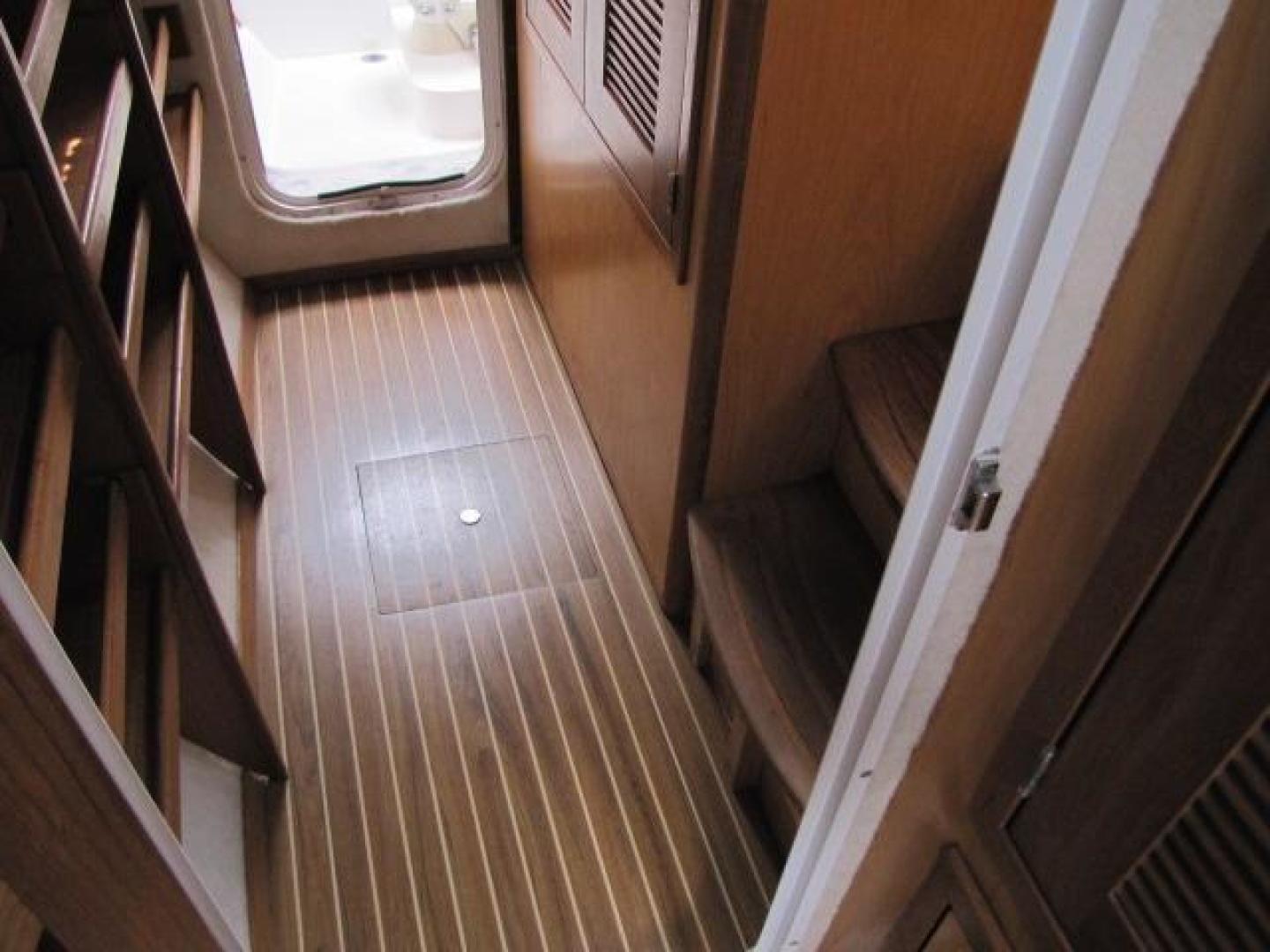 The interior finish is honey oak veneers with solid teak trim. Headliners are vinyl. The salon, master stateroom, VIP cabin and walkthrough areas are all high strength composite teak and holly. The remaining sole is white fiberglass. Hull walls are lined with a light colored Ozite carpet.