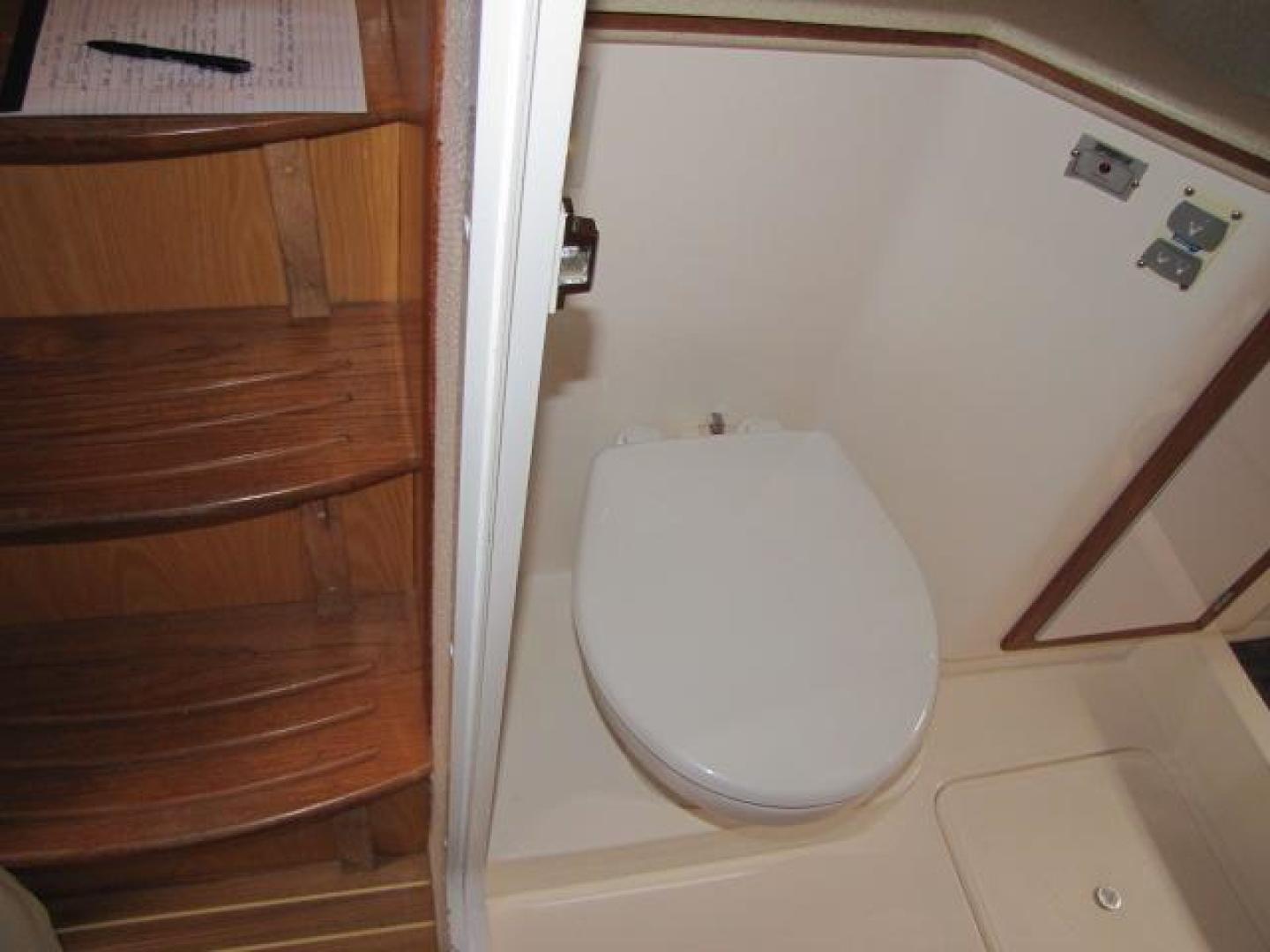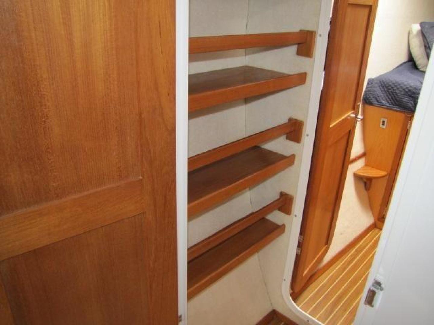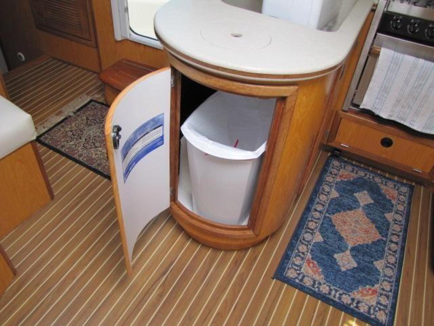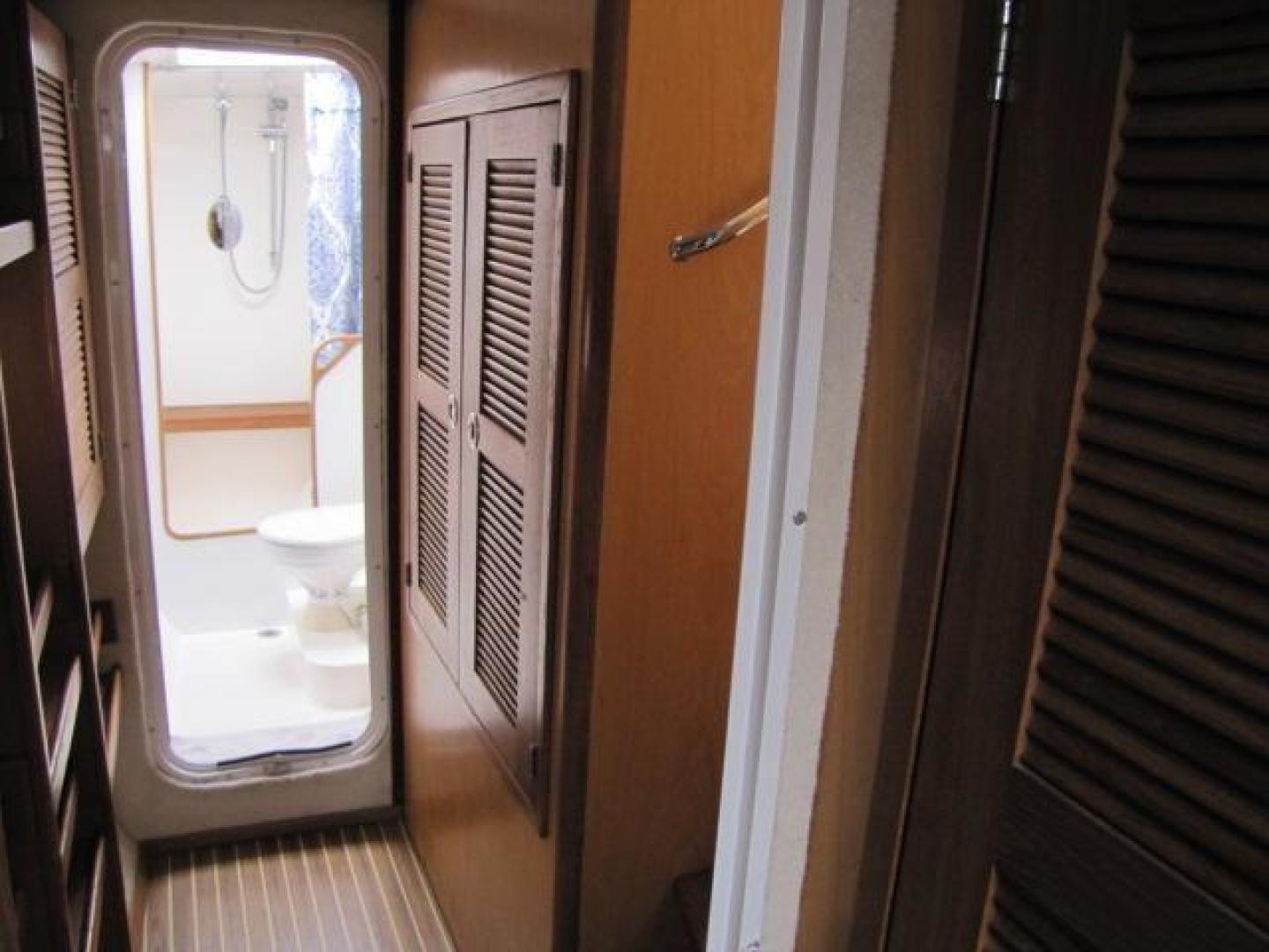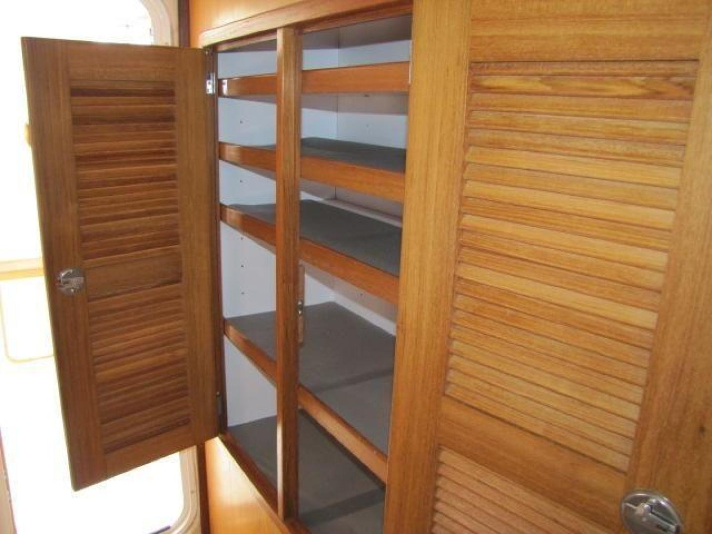 The interior finish is honey oak veneers with solid teak trim. Headliners are vinyl. The salon, master stateroom, VIP cabin and walkthrough areas are all high strength composite teak and holly. The remaining sole is white fiberglass. Hull walls are lined with a light colored Ozite carpet.