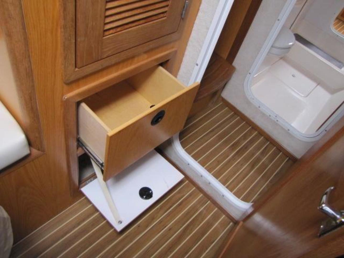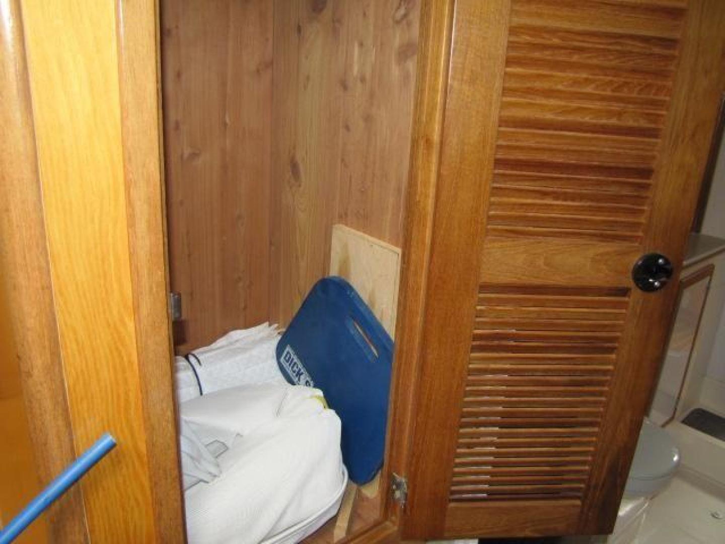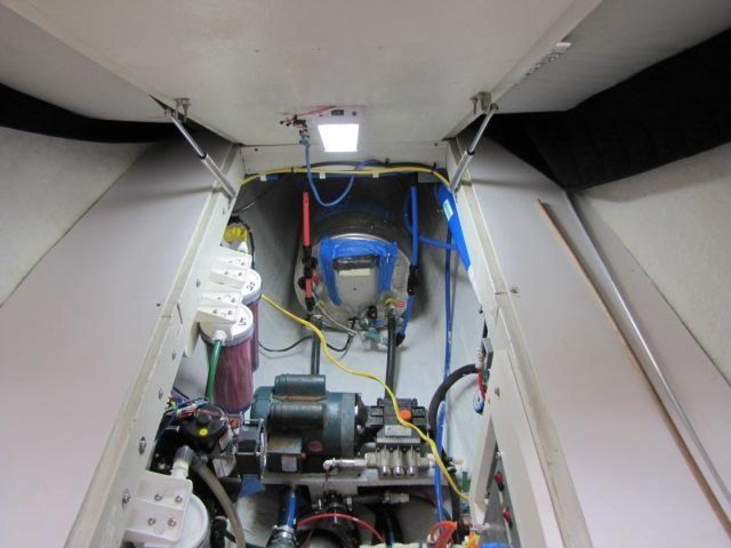 - Under the berth is the pump bay which includes pumps and plumbing for the fresh water, air conditioning and watermaker as well as the water heater.