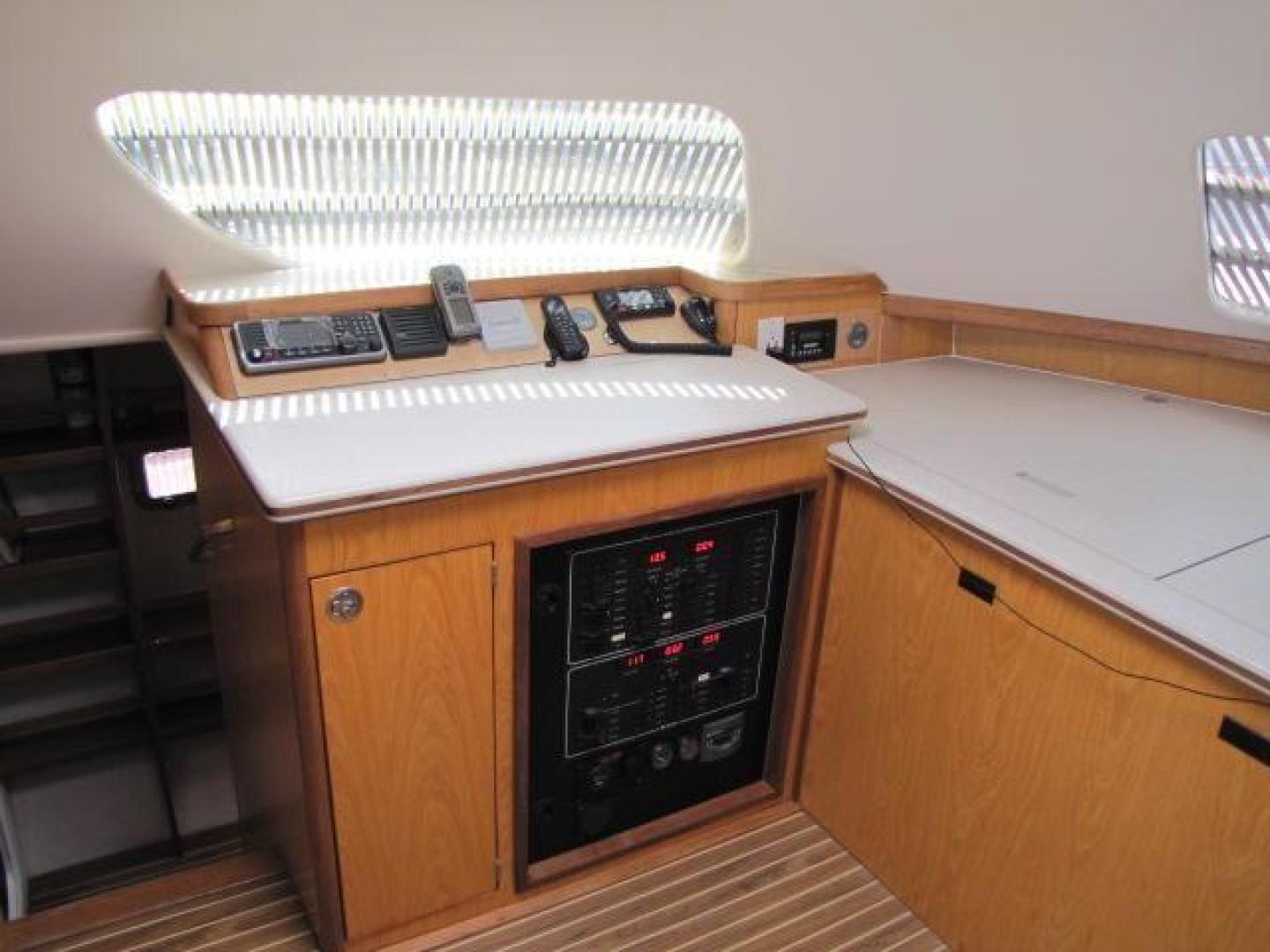 - SSB, VHF, Tridata Garmin, battery monitor and invertor controls are mounted above the chart table.