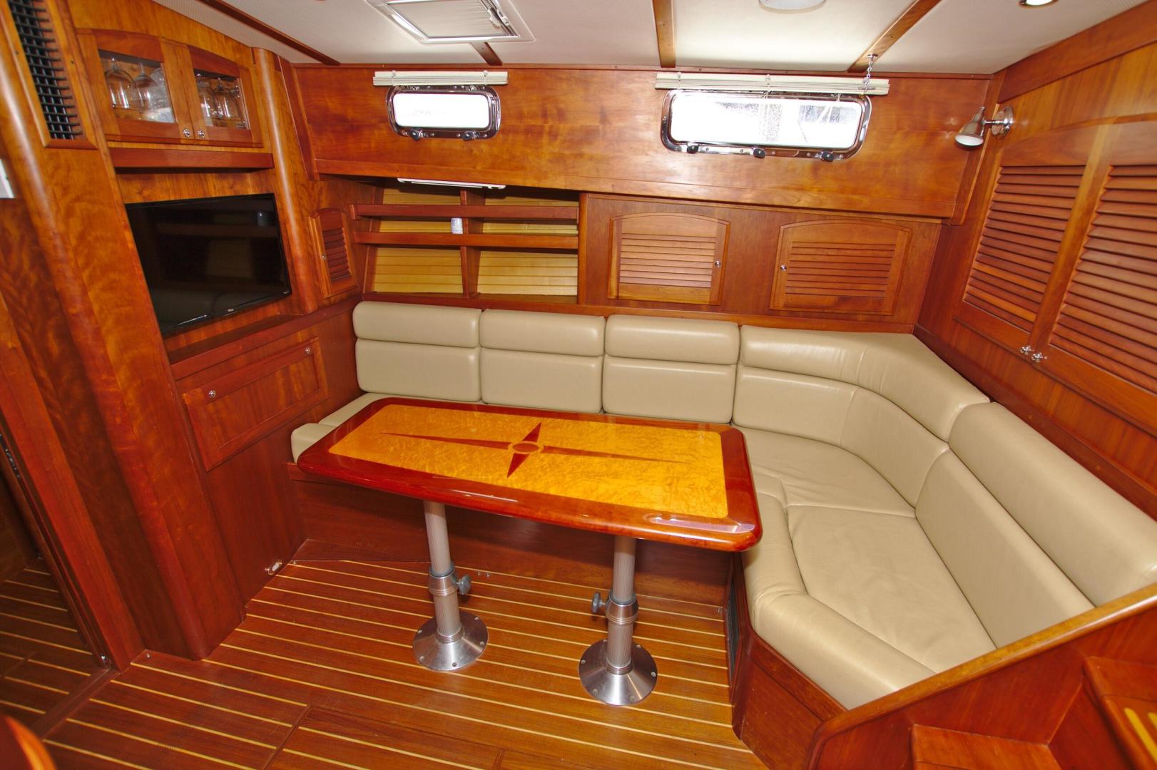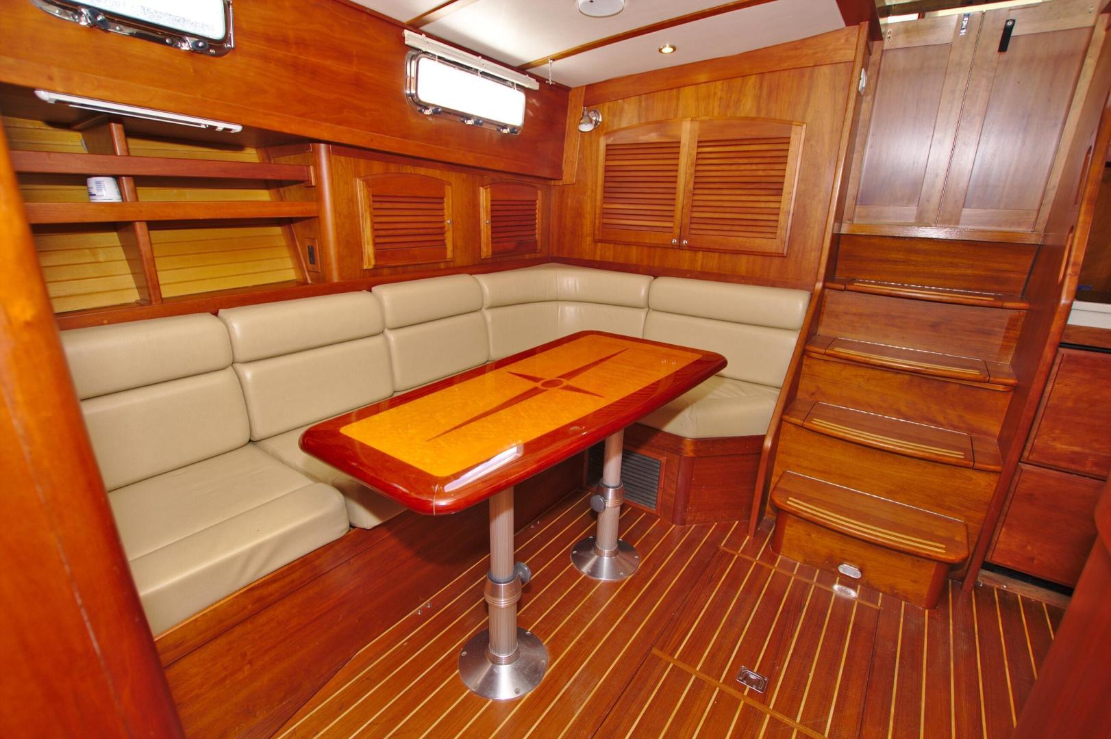 - Inlaid salon table on (2) hi- low pedestals lowers to form berth with filler