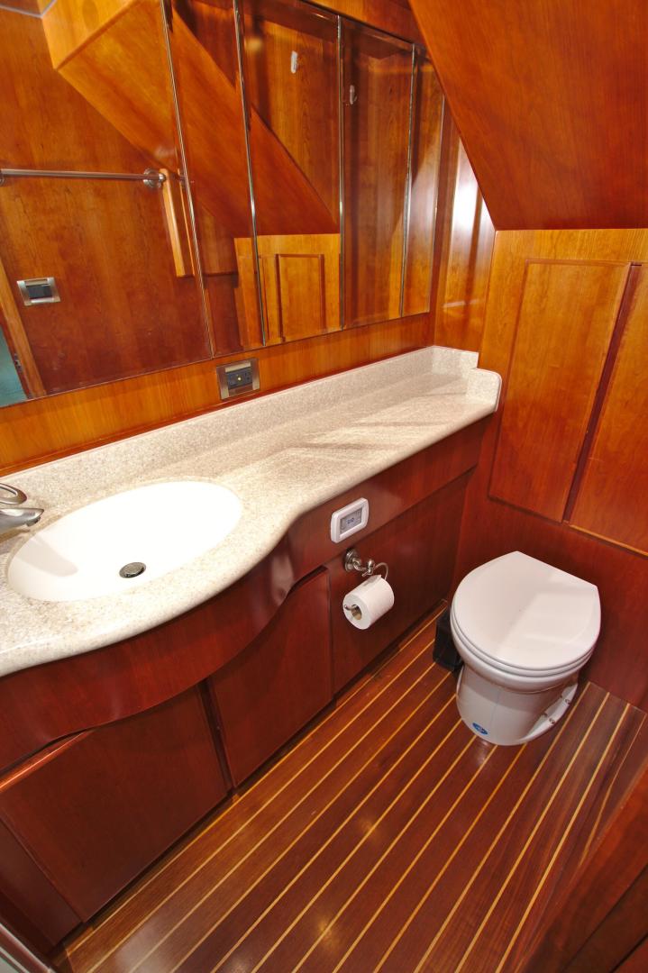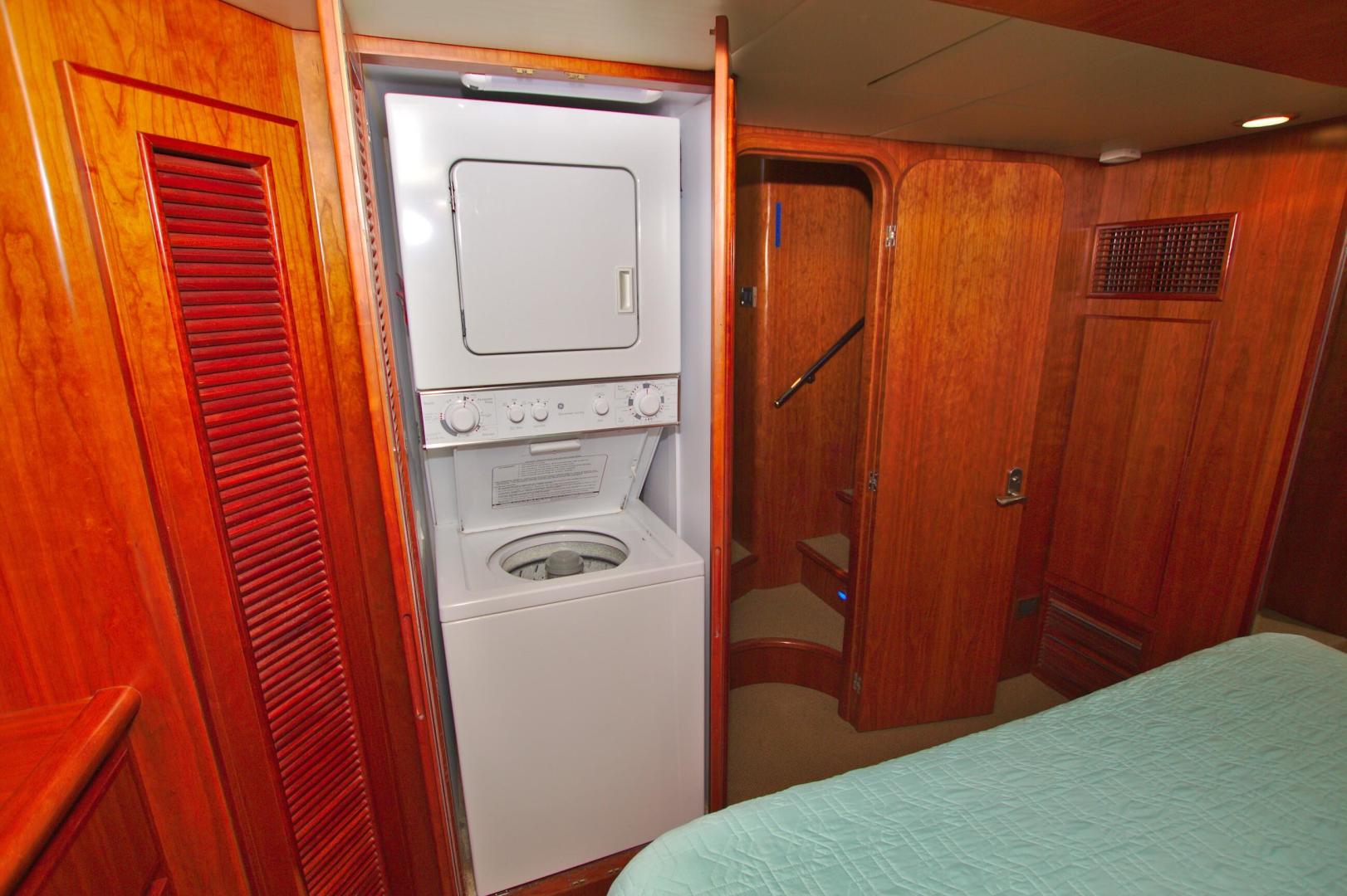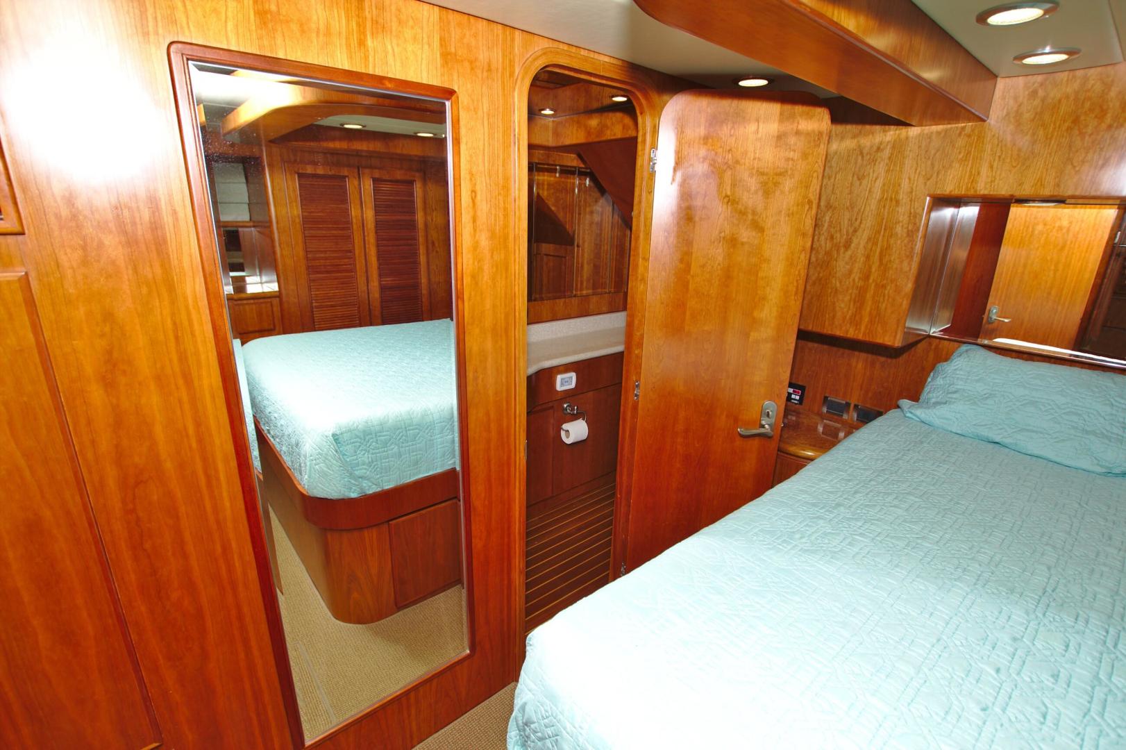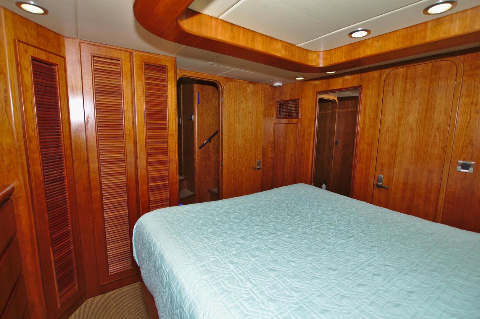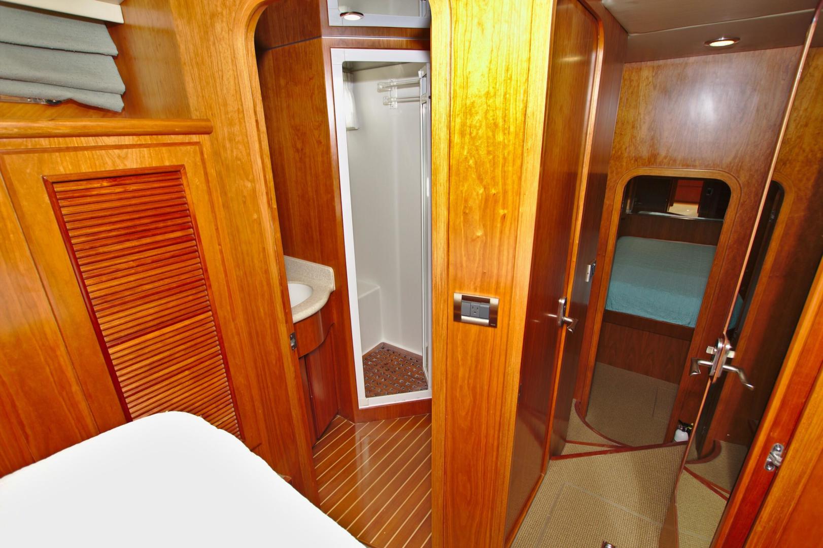 Moving forward and up a couple of steps, one finds the pilothouse with a sliding door to port and starboard both with sliding screens. To port is a large settee and custom teak high/low table. The helm is thoughtfully laid out and comfortable. All of the electronics and navigation equipment are within hands reach. From the pilothouse, the staterooms below deck are accessed through a spiral companionway to starboard. The VIP stateroom includes a full sized island berth along the centerline with hanging lockers, cabinets, and drawers. Private access to the guest head is located to starboard and aft. The guest head includes vanity, vacuflush head, stand up shower stall, and good storage. Moving aft, the full beam master features a centerline queen berth, cedar-lined hanging lockers, drawers and cabinets. The large master head is situated to starboard and includes a large shower stall, vanity, lots of storage and vacuflush head system. The GE washer and dryer are conveniently located in the master stateroom.