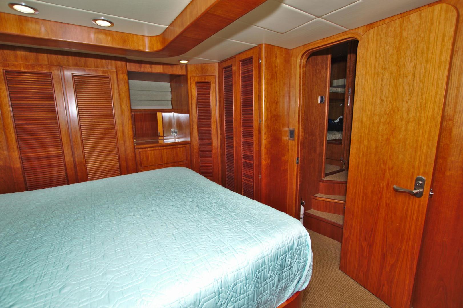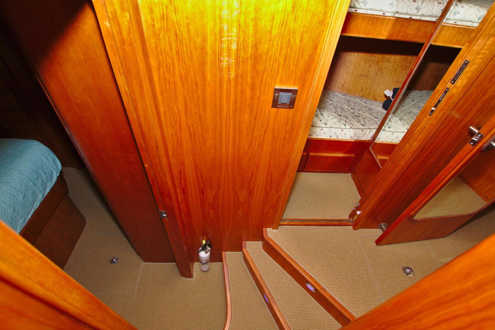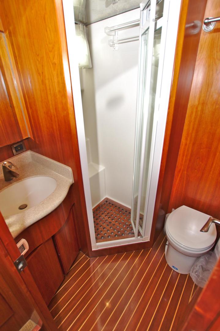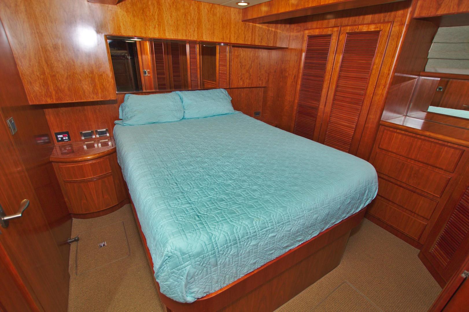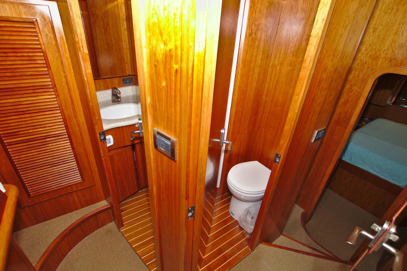 Moving forward and up a couple of steps, one finds the pilothouse with a sliding door to port and starboard both with sliding screens. To port is a large settee and custom teak high/low table. The helm is thoughtfully laid out and comfortable. All of the electronics and navigation equipment are within hands reach. From the pilothouse, the staterooms below deck are accessed through a spiral companionway to starboard. The VIP stateroom includes a full sized island berth along the centerline with hanging lockers, cabinets, and drawers. Private access to the guest head is located to starboard and aft. The guest head includes vanity, vacuflush head, stand up shower stall, and good storage. Moving aft, the full beam master features a centerline queen berth, cedar-lined hanging lockers, drawers and cabinets. The large master head is situated to starboard and includes a large shower stall, vanity, lots of storage and vacuflush head system. The GE washer and dryer are conveniently located in the master stateroom.