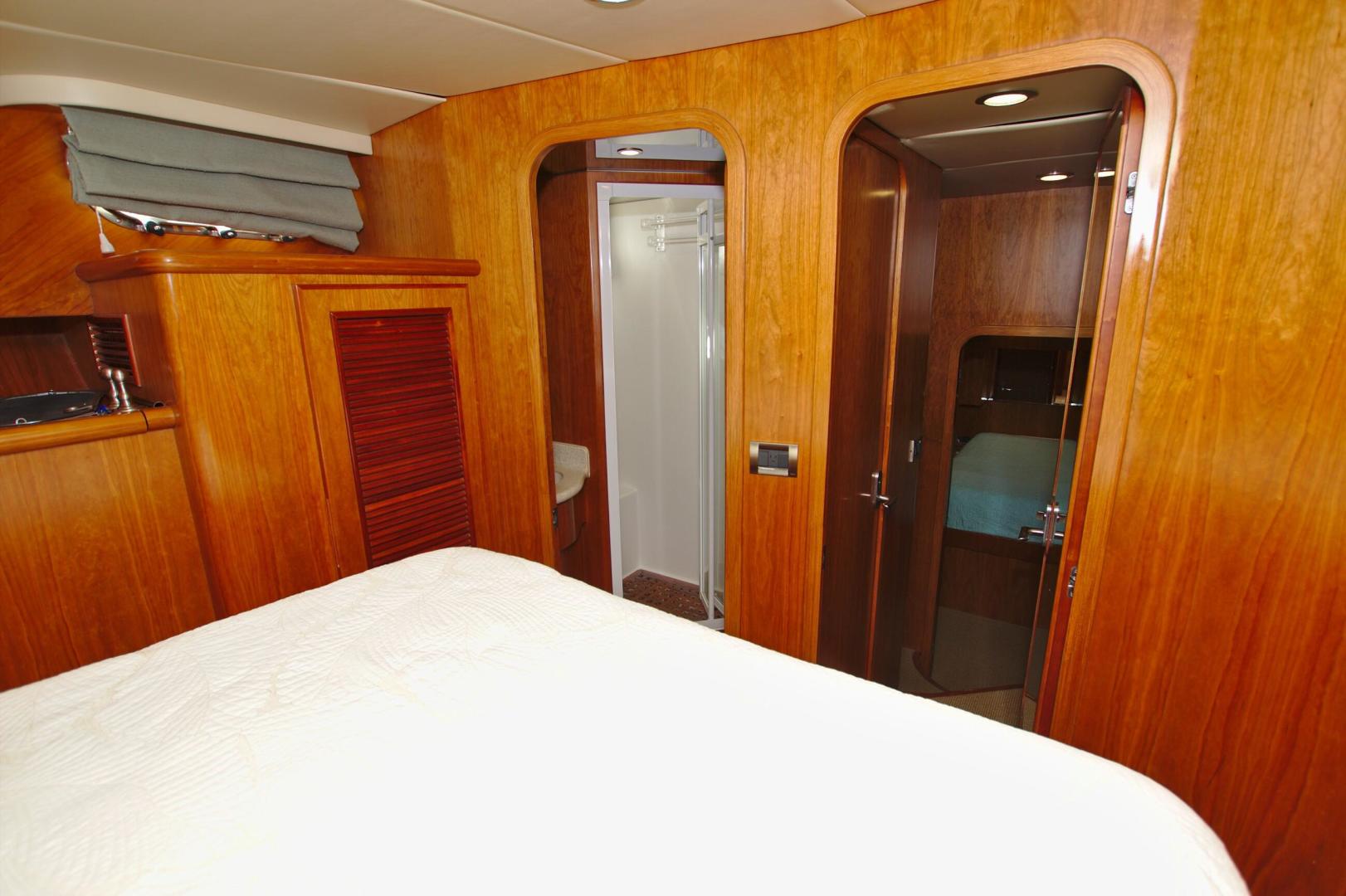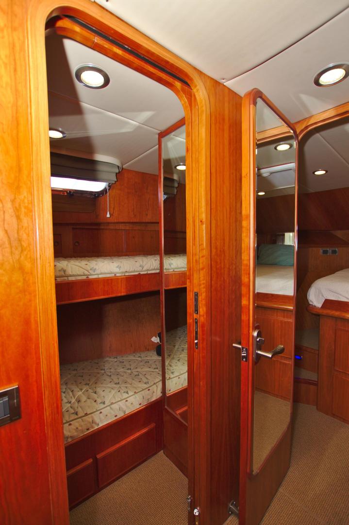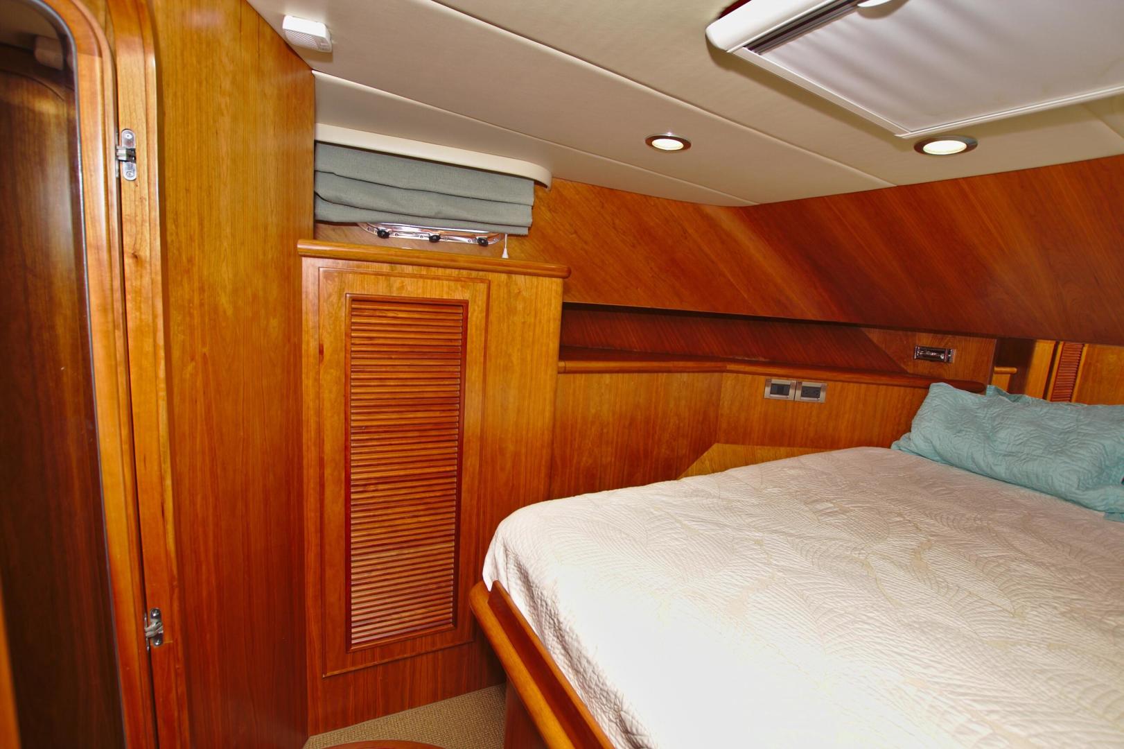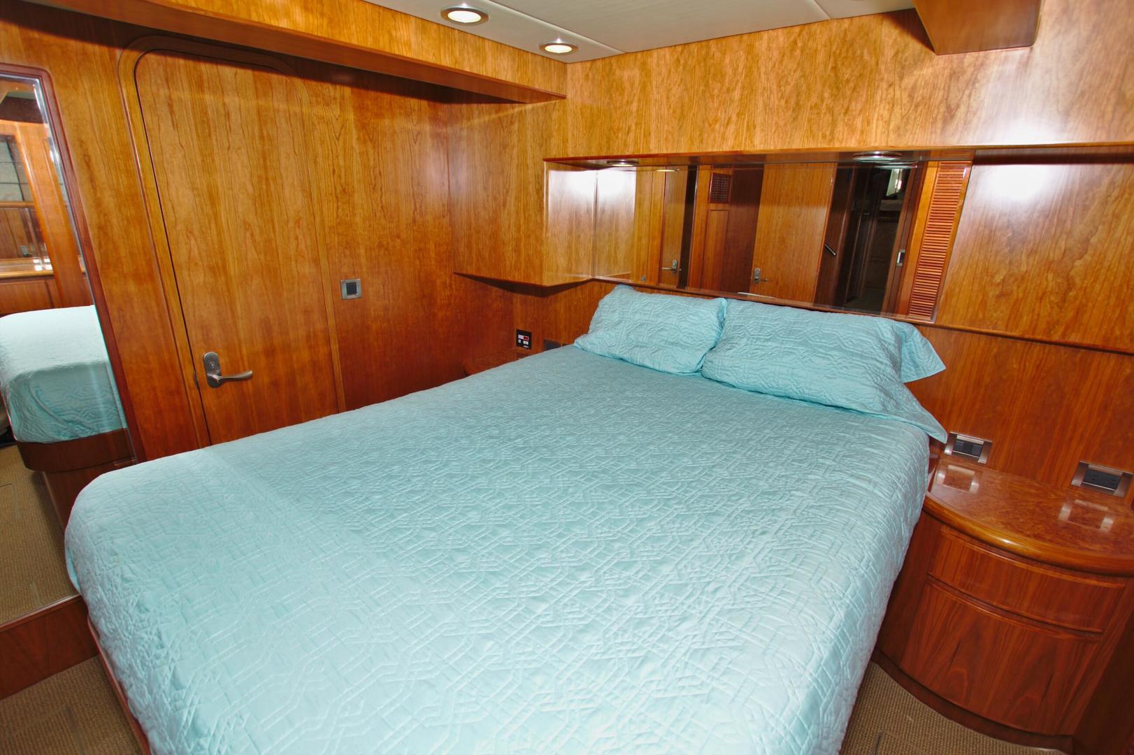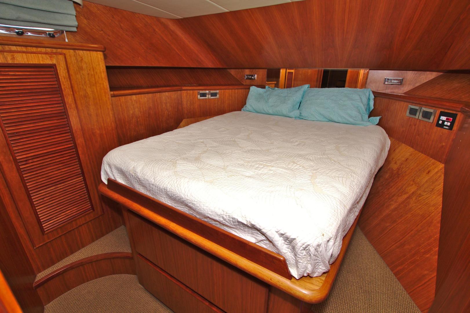 Moving forward and up a couple of steps, one finds the pilothouse with a sliding door to port and starboard both with sliding screens. To port is a large settee and custom teak high/low table. The helm is thoughtfully laid out and comfortable. All of the electronics and navigation equipment are within hands reach. From the pilothouse, the staterooms below deck are accessed through a spiral companionway to starboard. The VIP stateroom includes a full sized island berth along the centerline with hanging lockers, cabinets, and drawers. Private access to the guest head is located to starboard and aft. The guest head includes vanity, vacuflush head, stand up shower stall, and good storage. Moving aft, the full beam master features a centerline queen berth, cedar-lined hanging lockers, drawers and cabinets. The large master head is situated to starboard and includes a large shower stall, vanity, lots of storage and vacuflush head system. The GE washer and dryer are conveniently located in the master stateroom.