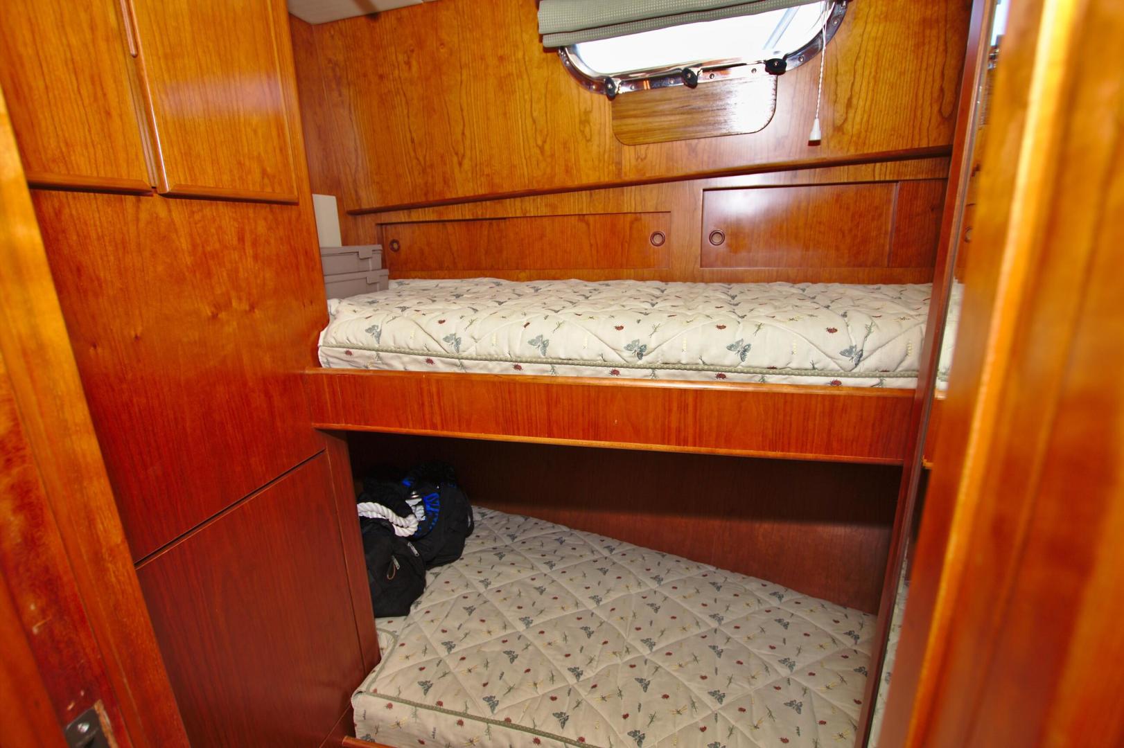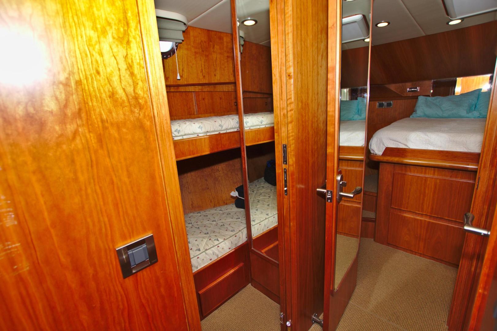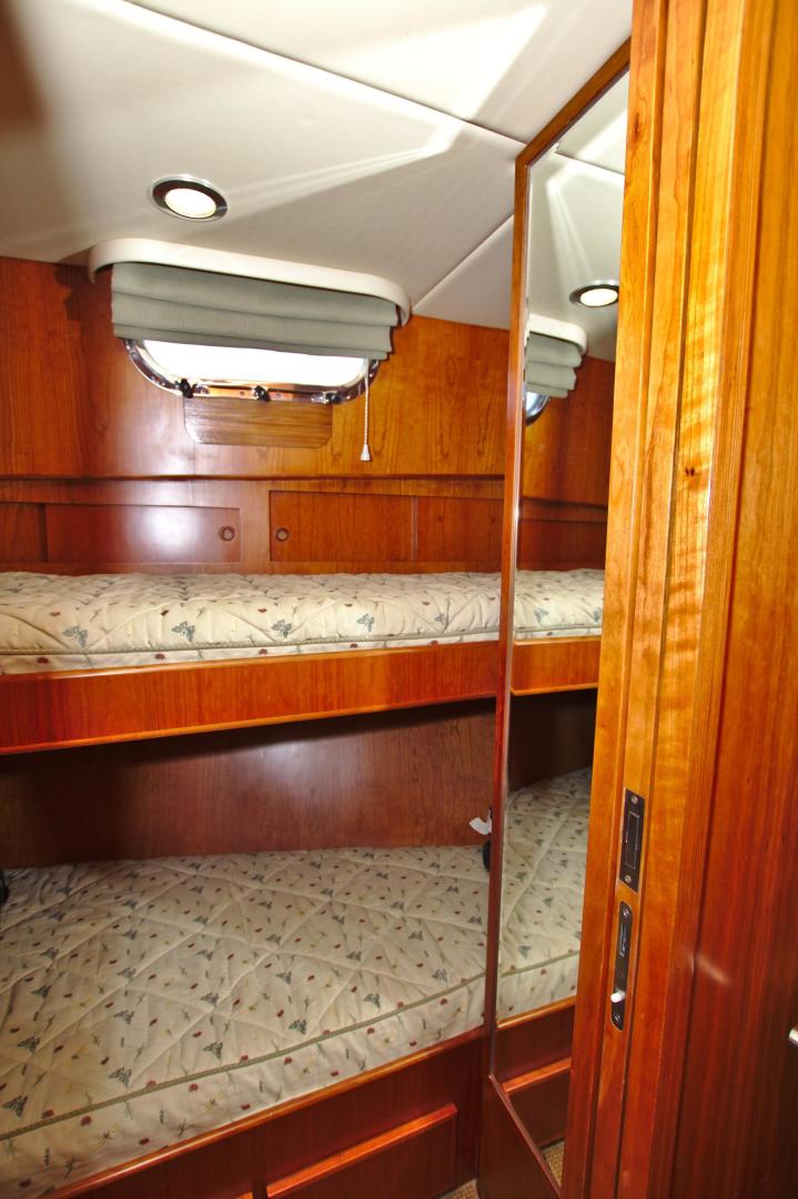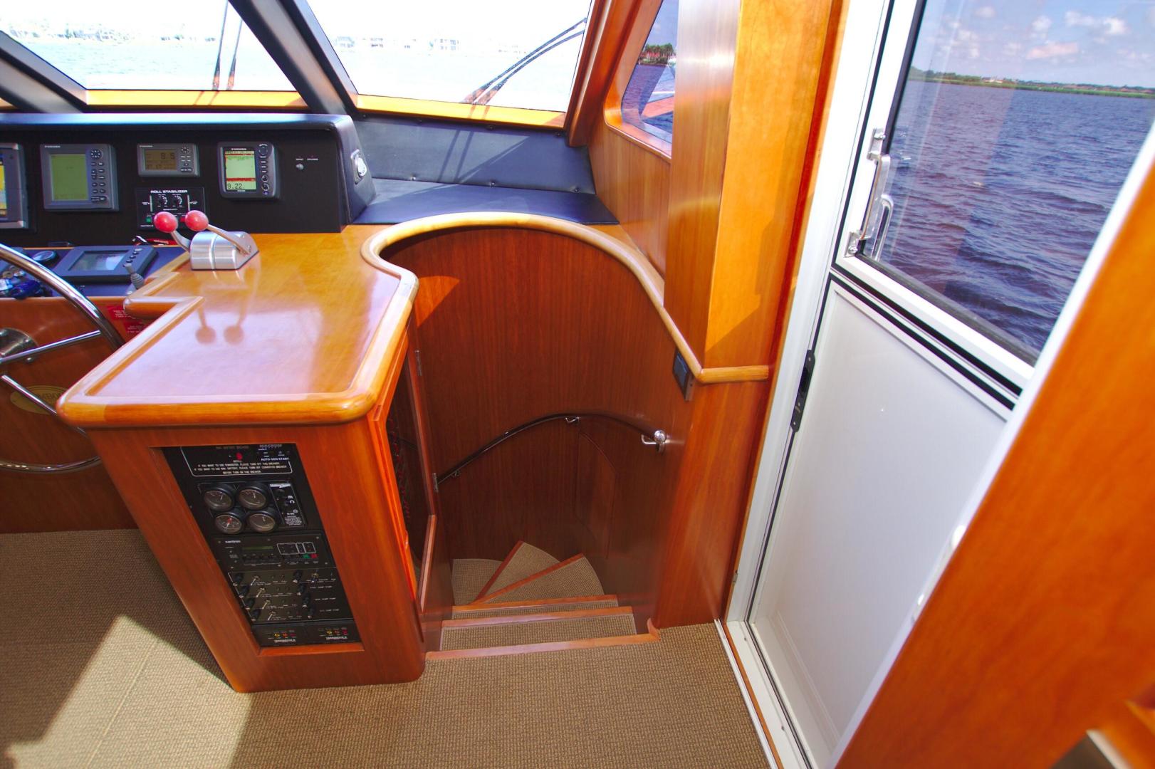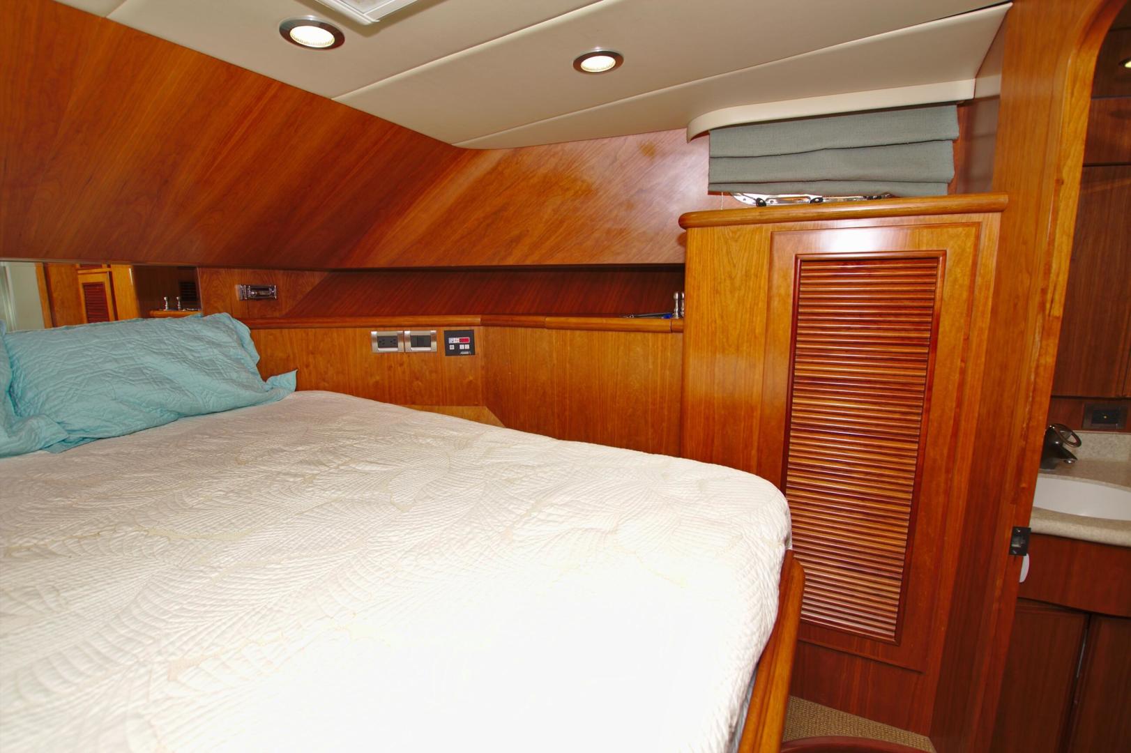 Moving forward and up a couple of steps, one finds the pilothouse with a sliding door to port and starboard both with sliding screens. To port is a large settee and custom teak high/low table. The helm is thoughtfully laid out and comfortable. All of the electronics and navigation equipment are within hands reach. From the pilothouse, the staterooms below deck are accessed through a spiral companionway to starboard. The VIP stateroom includes a full sized island berth along the centerline with hanging lockers, cabinets, and drawers. Private access to the guest head is located to starboard and aft. The guest head includes vanity, vacuflush head, stand up shower stall, and good storage. Moving aft, the full beam master features a centerline queen berth, cedar-lined hanging lockers, drawers and cabinets. The large master head is situated to starboard and includes a large shower stall, vanity, lots of storage and vacuflush head system. The GE washer and dryer are conveniently located in the master stateroom.