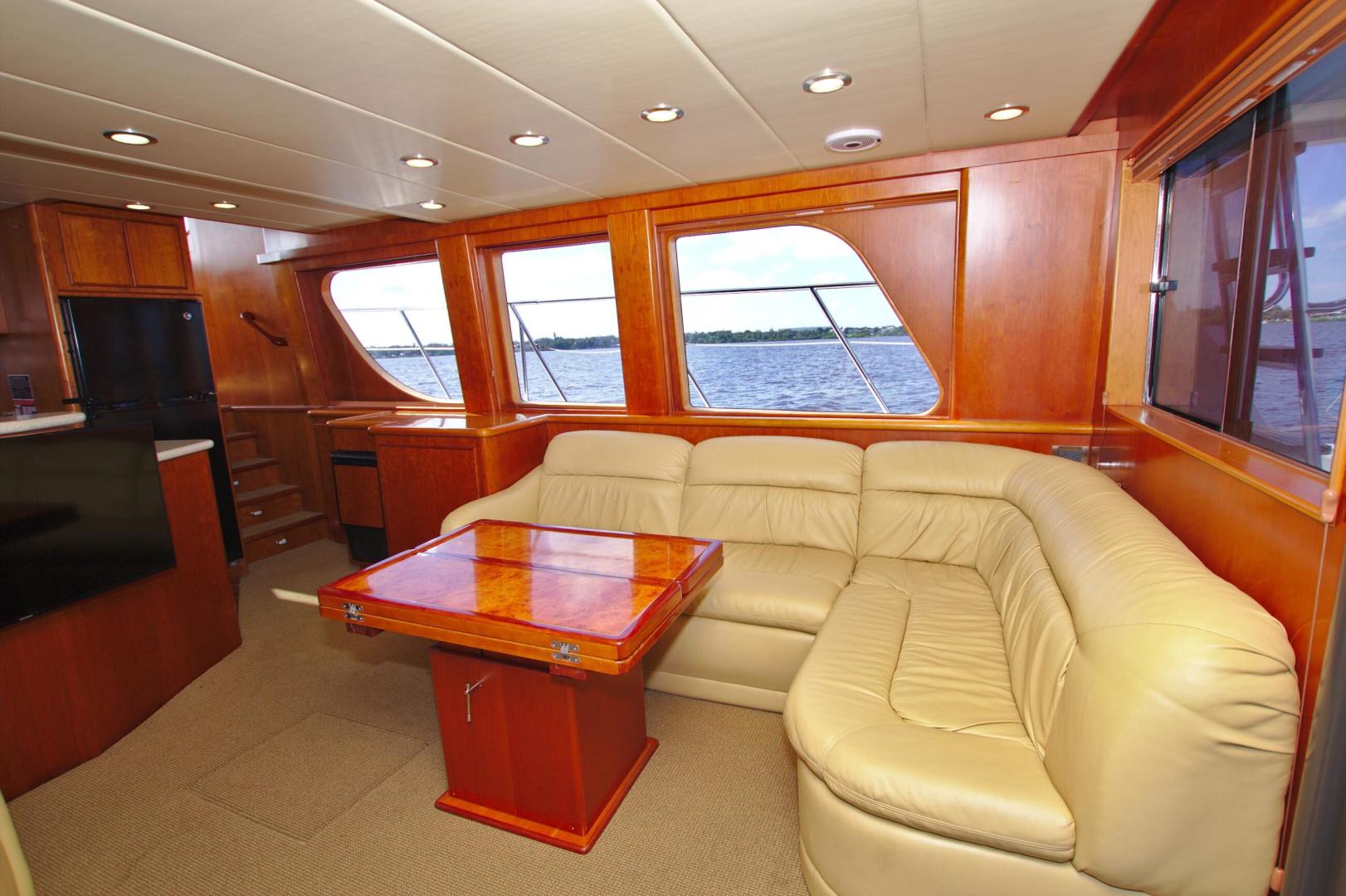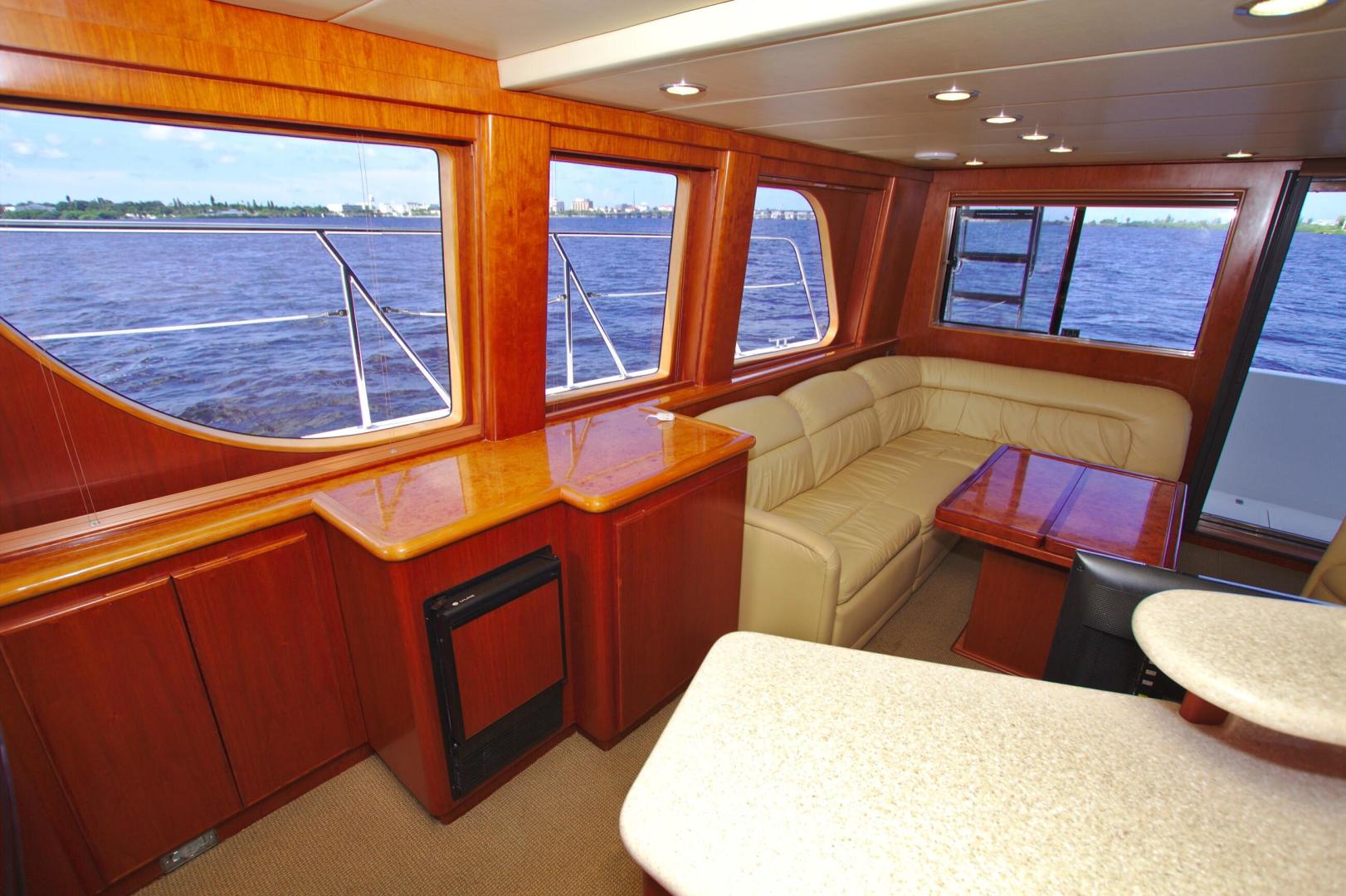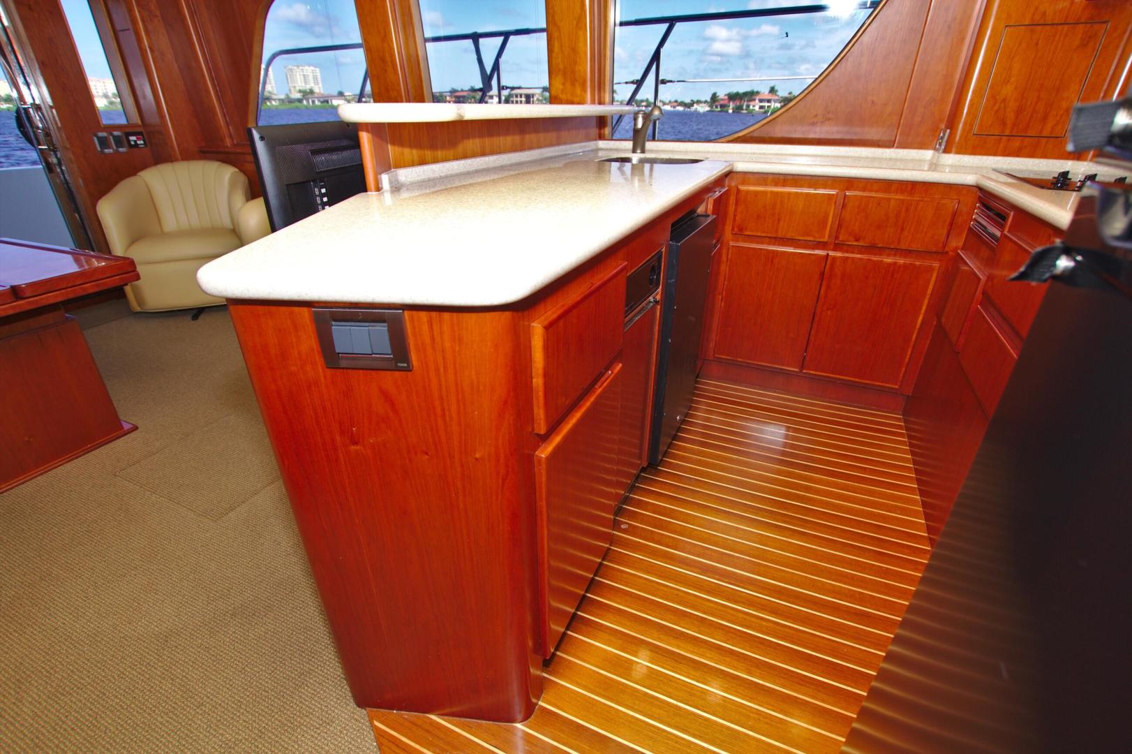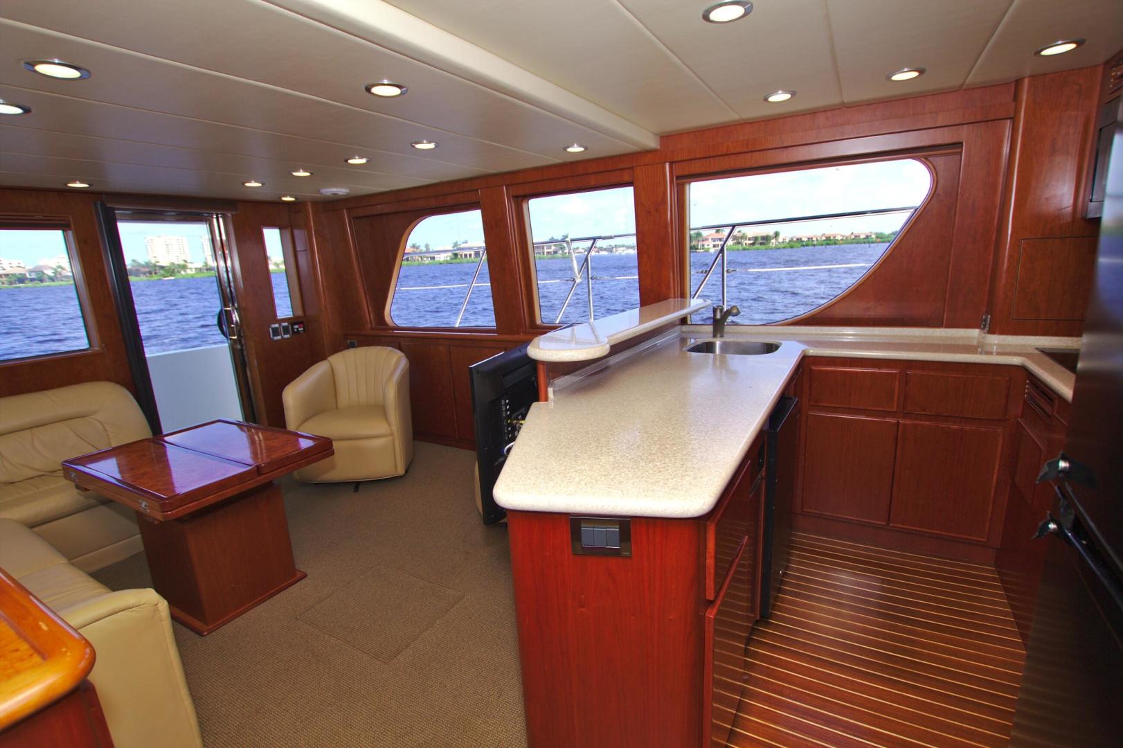 Her Flybridge is expansive and can be accessed from either the Pilothouse or the aft deck. The comfortable helm puts the skipper within hands reach of all electronics and navigation equipment and provides excellent visibility of the surroundings. Large enough to accommodate many guests, the bridge includes everything needed to entertain. A grilling station includes an electric grill, refrigerator and icemaker. The dinghy is cradled on the aft section of the bridge and is easily launched via a low profile electric davit.