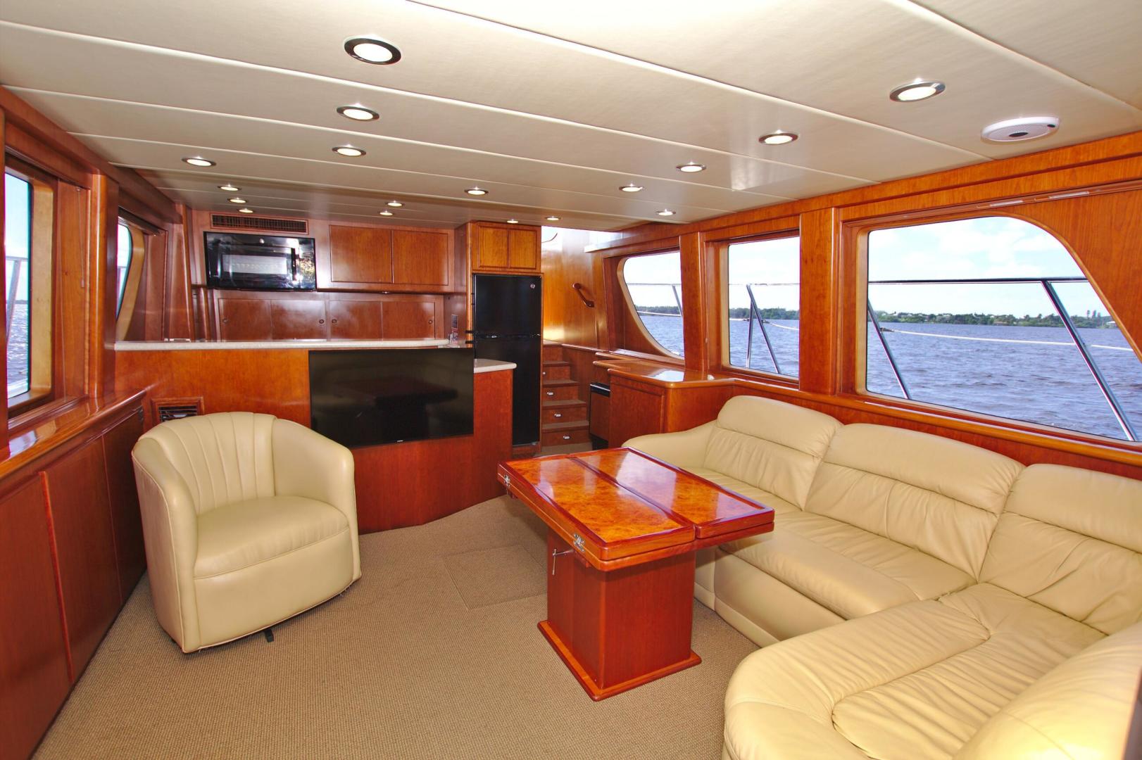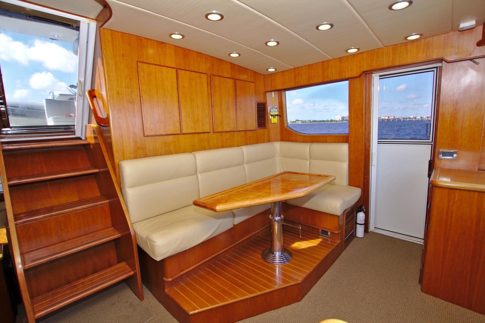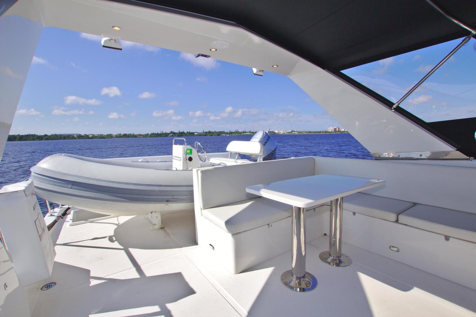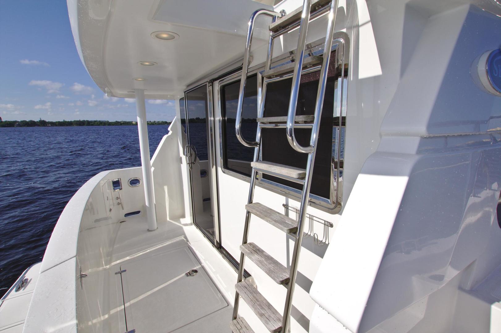 Her Flybridge is expansive and can be accessed from either the Pilothouse or the aft deck. The comfortable helm puts the skipper within hands reach of all electronics and navigation equipment and provides excellent visibility of the surroundings. Large enough to accommodate many guests, the bridge includes everything needed to entertain. A grilling station includes an electric grill, refrigerator and icemaker. The dinghy is cradled on the aft section of the bridge and is easily launched via a low profile electric davit.