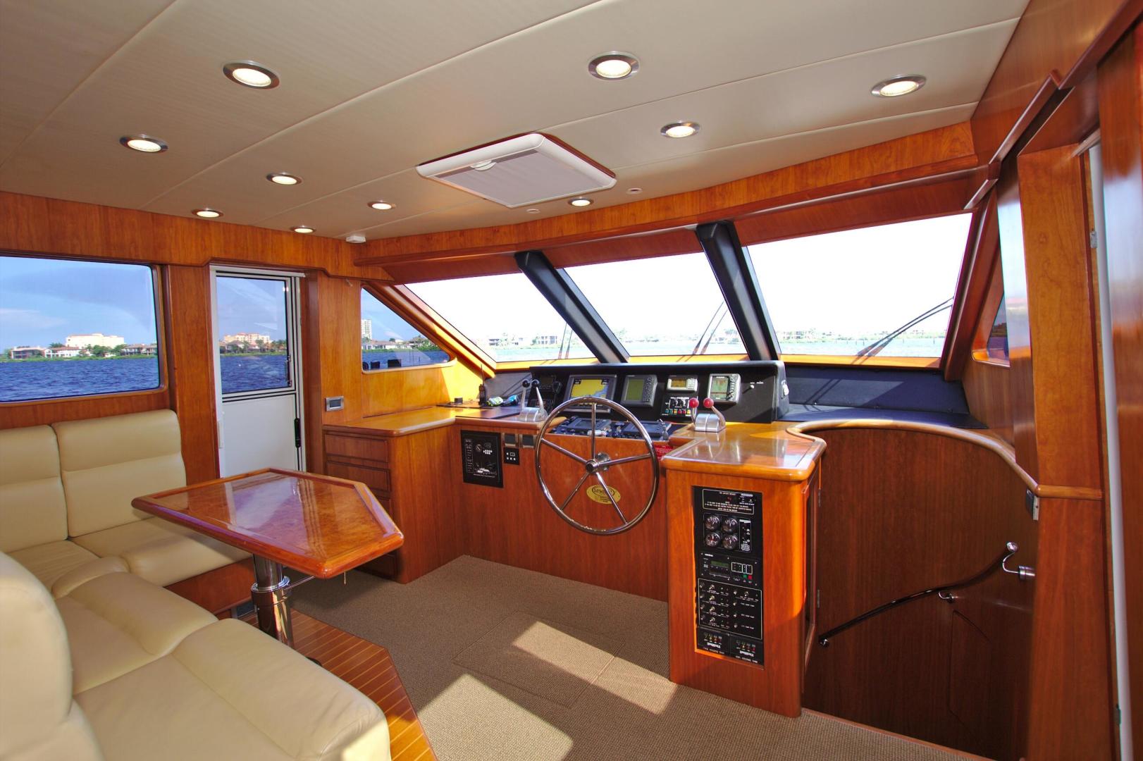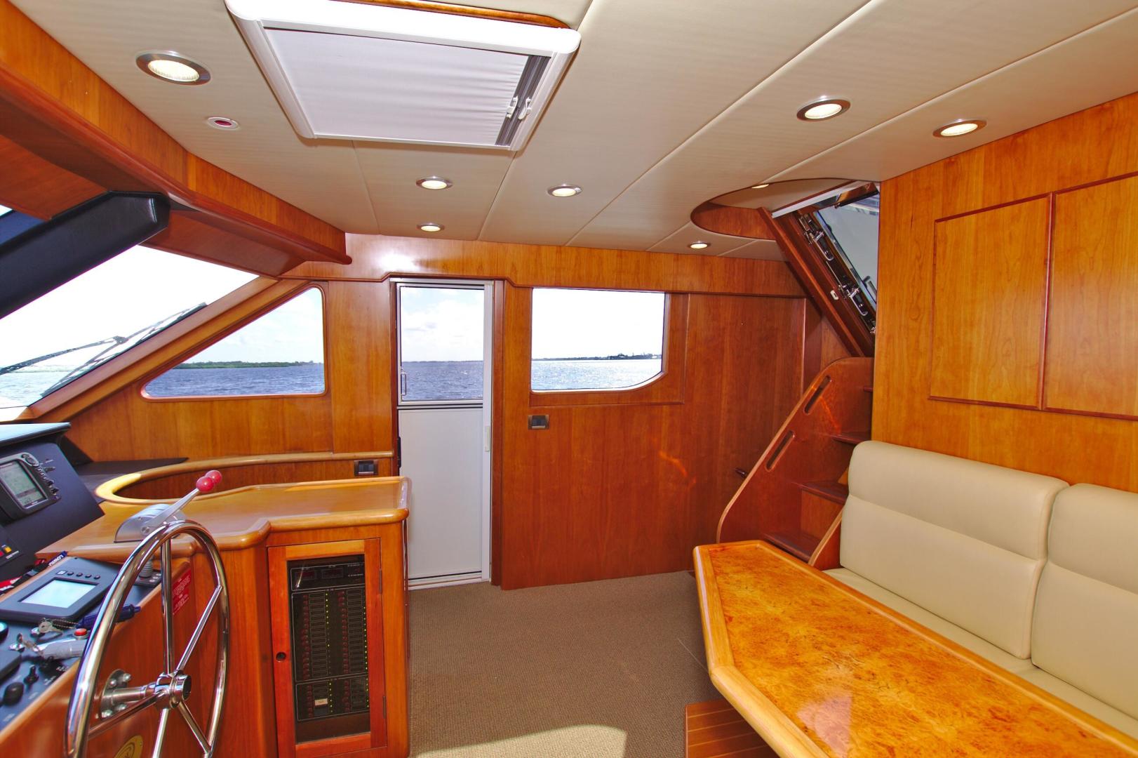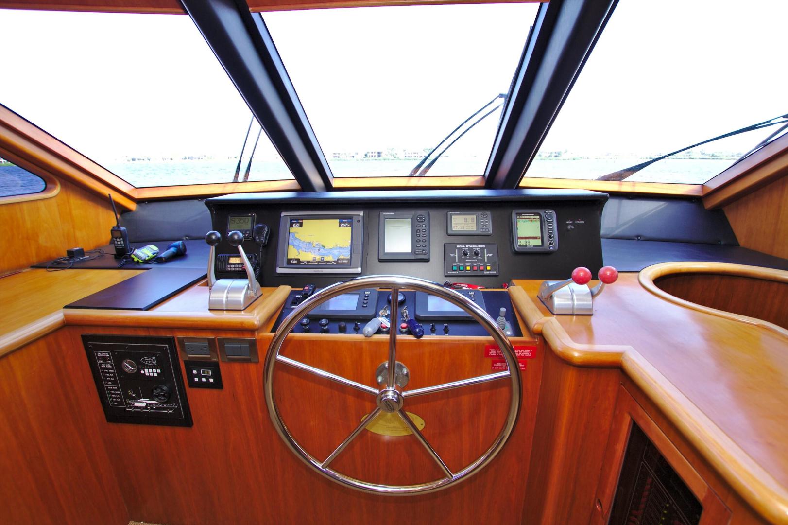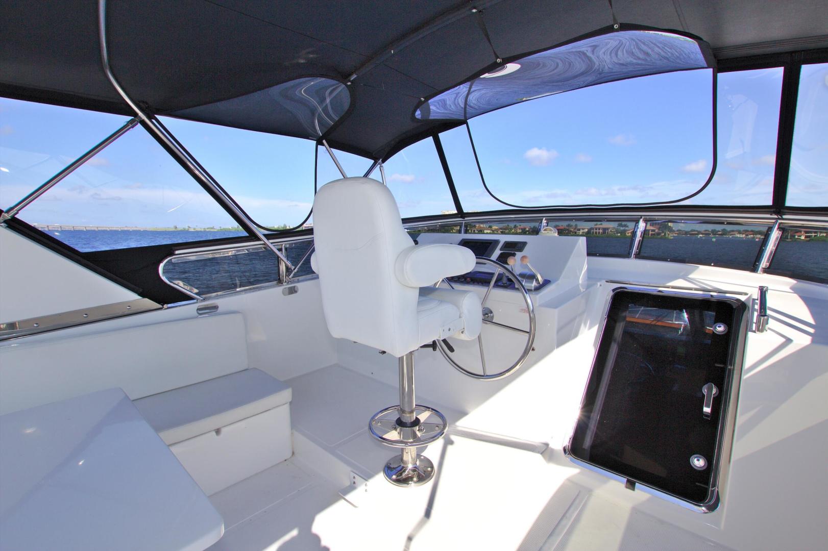 Custom interior decor with designer fabrics, blinds and cushions with corian countertops. Teak and Holly sole in the Galley and Heads. Wide walk around decks with S/S handrails. Spacious boat deck for Tender. FRP Radar Arch with S/S hinge. Covered Aft Deck with Lazarette. FRP Swim Platform with S/S ladder and hot cold transom shower. Upper and lower Helm Stations.