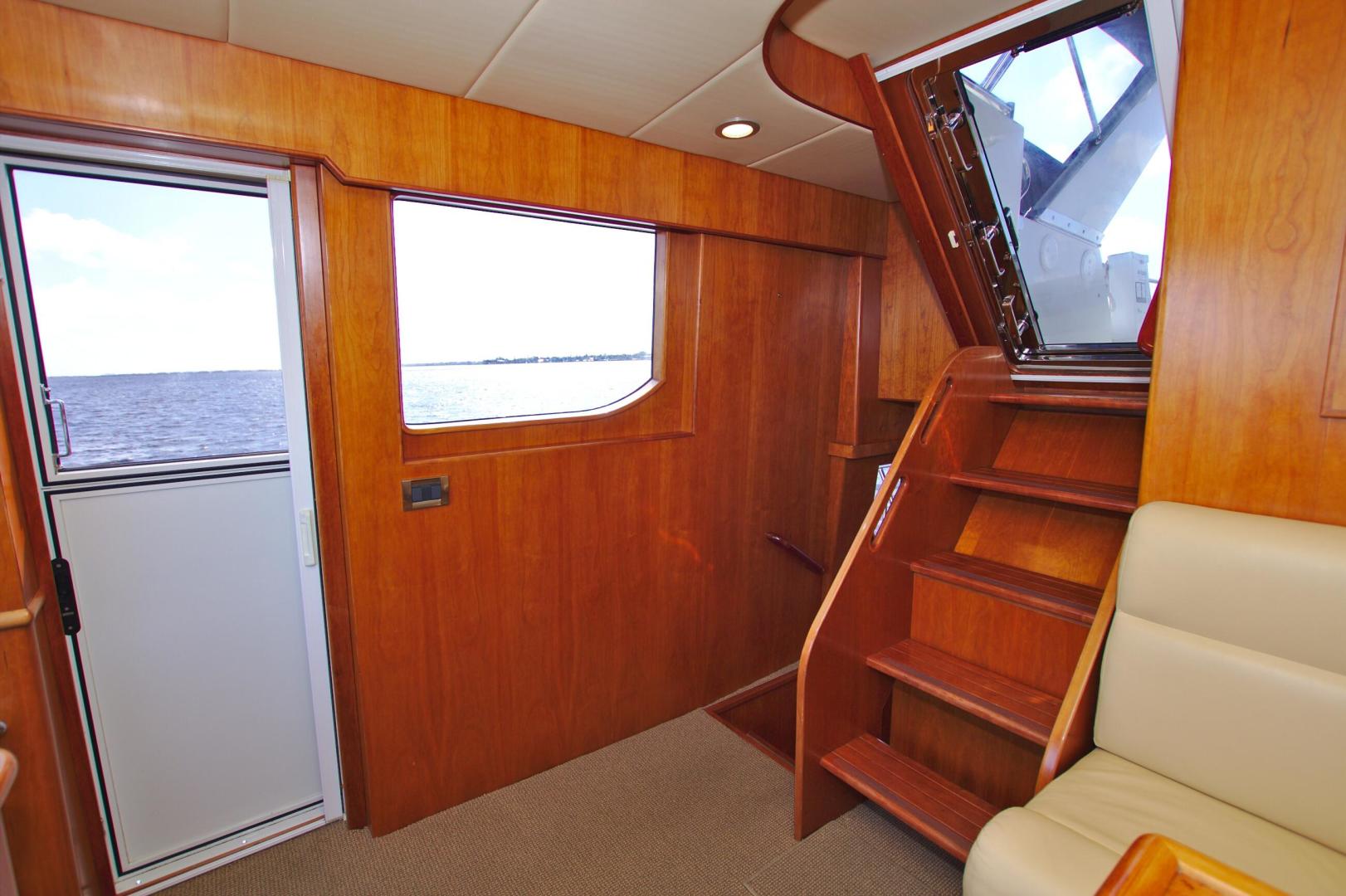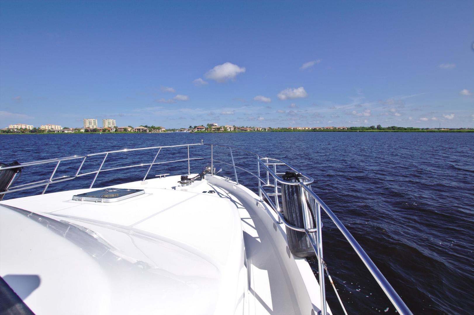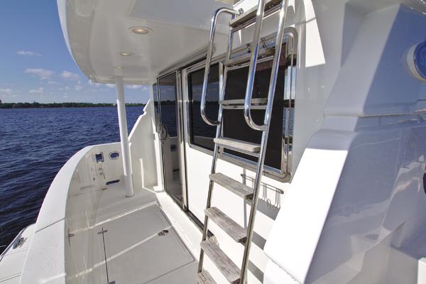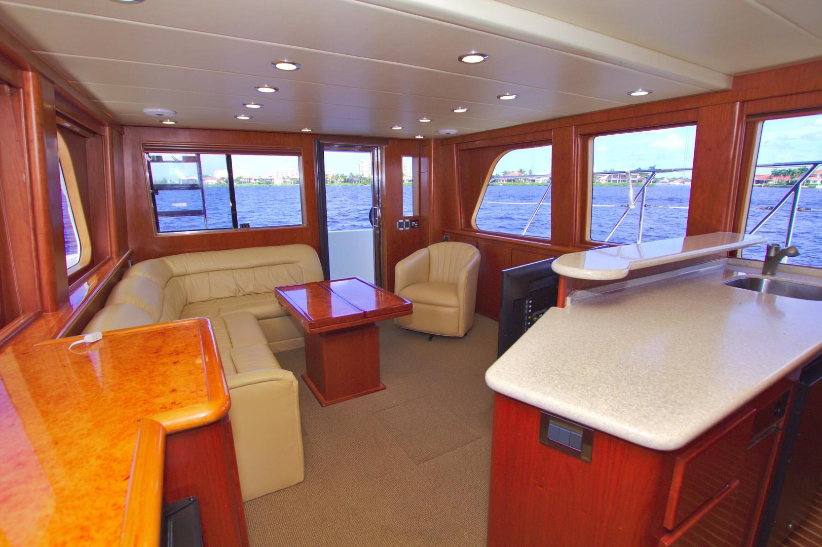 Custom interior decor with designer fabrics, blinds and cushions with corian countertops. Teak and Holly sole in the Galley and Heads. Wide walk around decks with S/S handrails. Spacious boat deck for Tender. FRP Radar Arch with S/S hinge. Covered Aft Deck with Lazarette. FRP Swim Platform with S/S ladder and hot cold transom shower. Upper and lower Helm Stations.