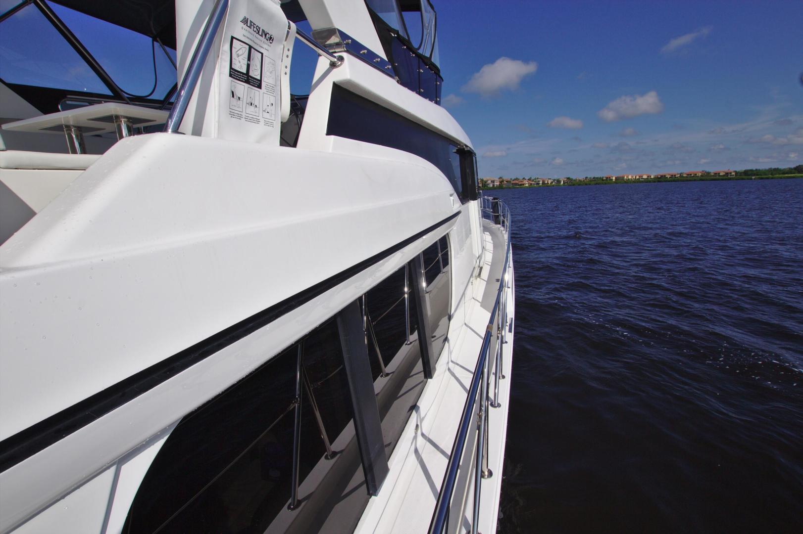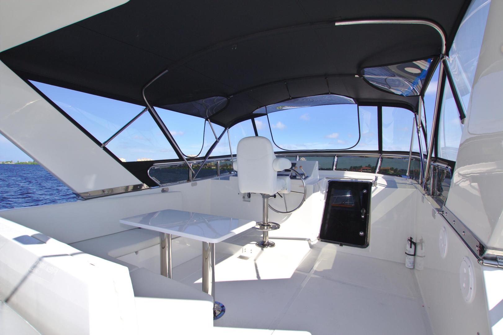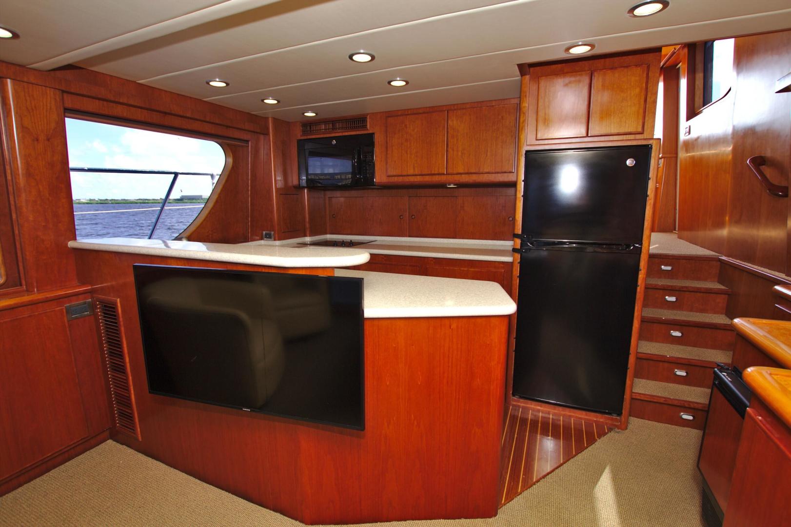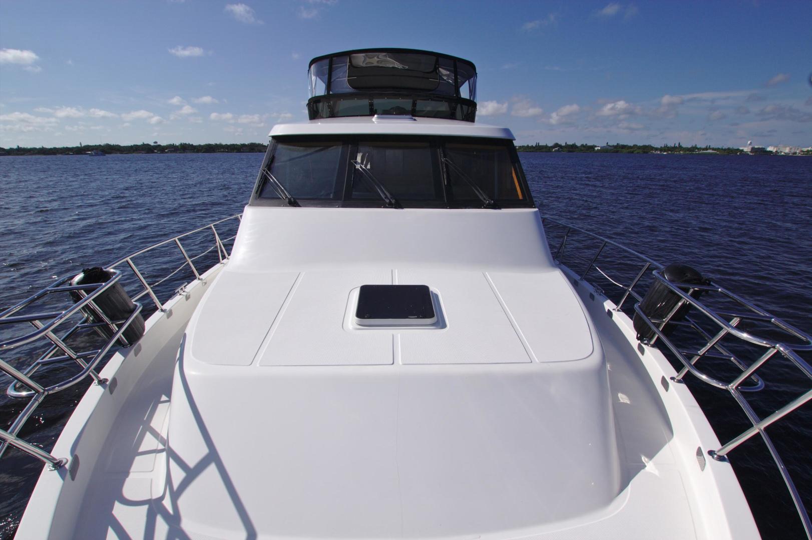 Custom interior decor with designer fabrics, blinds and cushions with corian countertops. Teak and Holly sole in the Galley and Heads. Wide walk around decks with S/S handrails. Spacious boat deck for Tender. FRP Radar Arch with S/S hinge. Covered Aft Deck with Lazarette. FRP Swim Platform with S/S ladder and hot cold transom shower. Upper and lower Helm Stations.