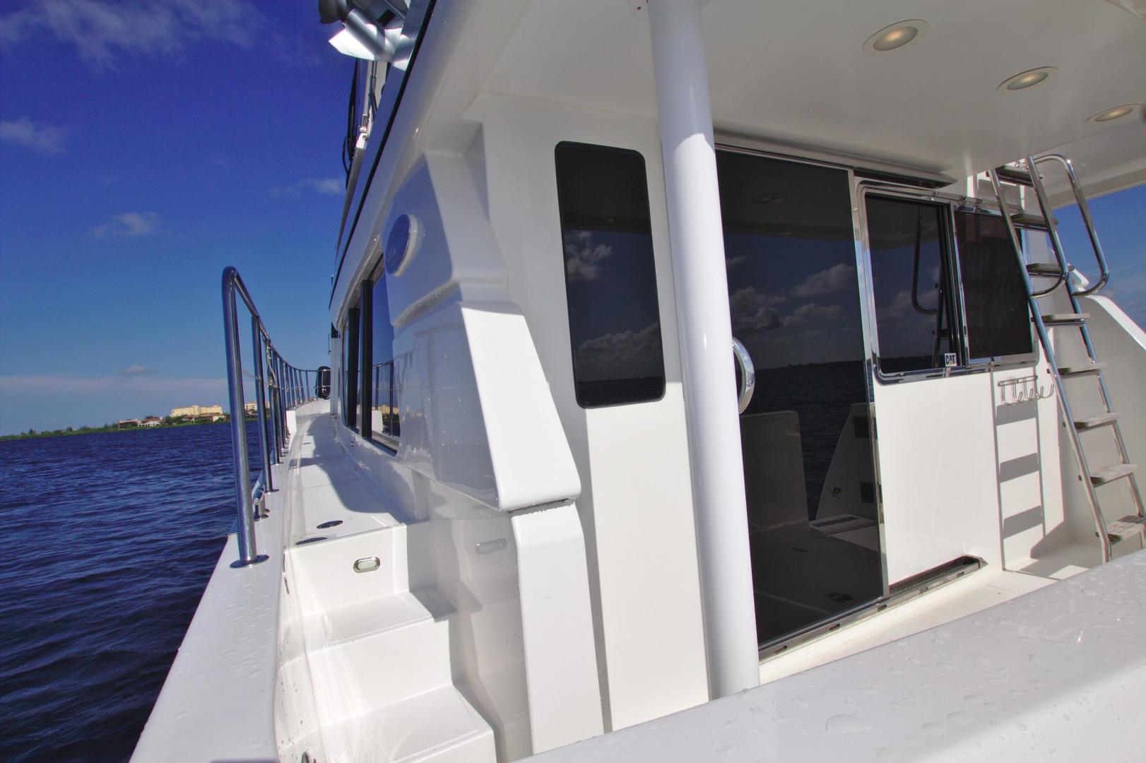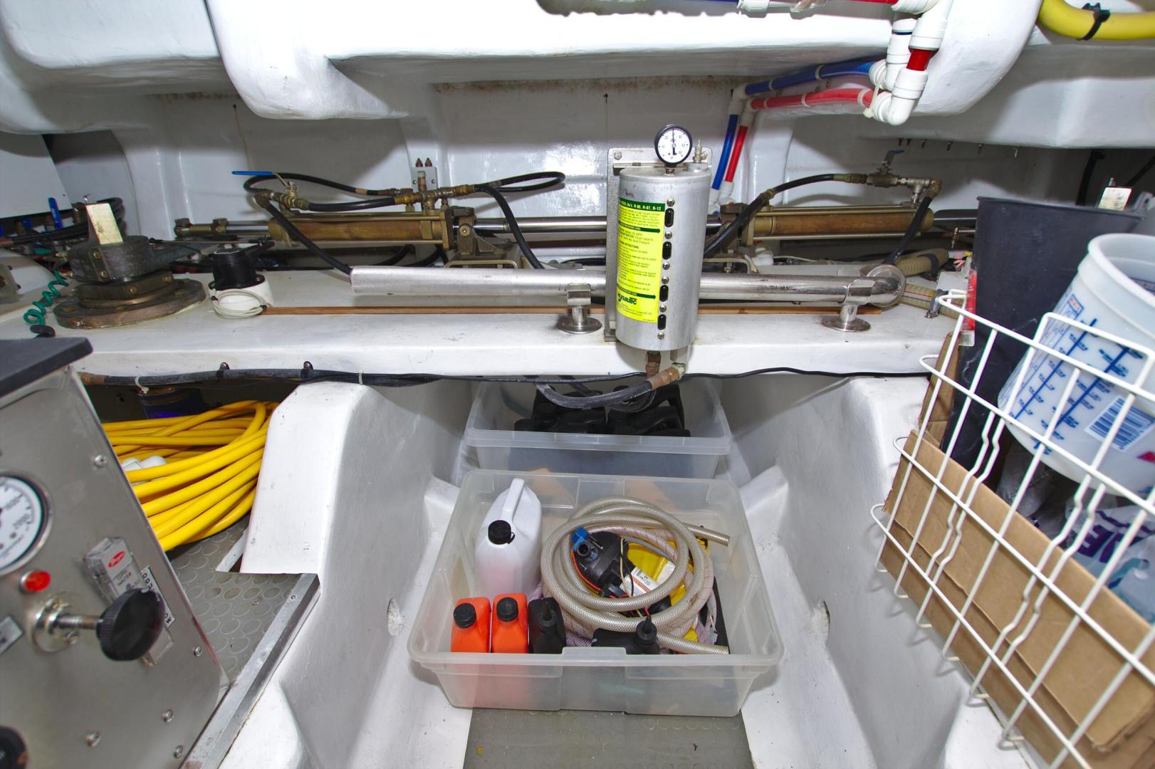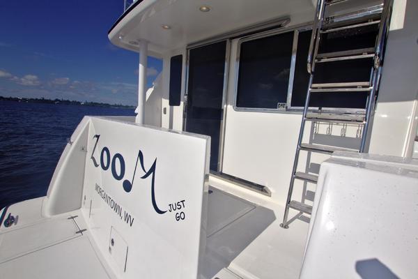 As cruising and livability were priorities in the design of the Symbol 52 Pilothouse, the layout of the deck makes movement throughout the vessel comfortable and safe. ZOOM has wide side decks with high stanchions, lifelines for comfortable and safe passage from the aft deck to the foredeck and pilothouse. Ground tackle and mooring gear is beefy and includes, remote windlass and washdown. To make cruising even more pleasant, ZOOM includes stabilizers by Naiad. These 6 square foot stabilizers actively work to reduce rolling motion in adverse conditions. The stabilizers were recently serviced (1/2017) and ready for action. The Symbol 52 Pilot House includes an integrated swim platform with recessed ladder for swimming, diving, and line handling. The aft deck features a large lazarette with lots of storage for swimming and diving gear. A watertight, lockable door/hatch provides engine room access from the aft deck. The rudders and emergency steering system can be easily accessed through the lazarette.