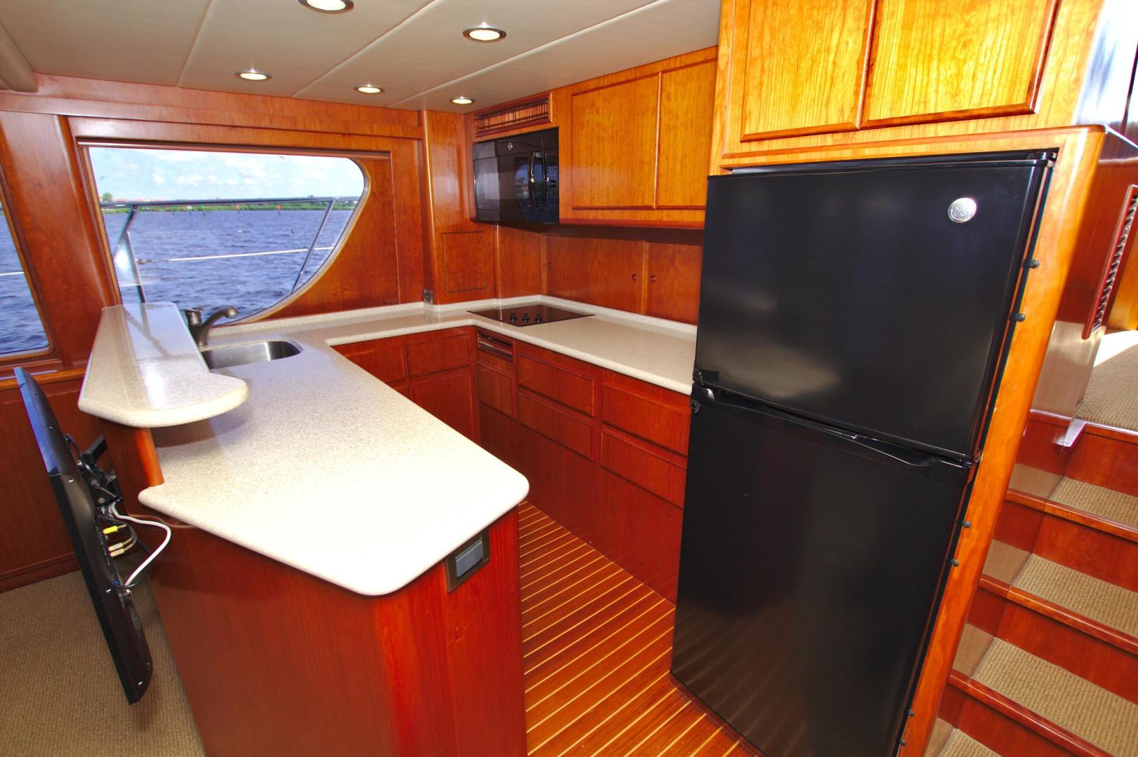 From the aft deck, Zoom is entered through dual sliding stainless-steel doors into the bright and airy salon. To starboard is a large, comfortable settee and a teak high/low folding table. To starboard is two barrel chairs. Large, tinted, safety glass windows allow natural lighting to fill the large salon as well as offer views of the surroundings. Custom carpeting is utilized throughout. Moving forward and to port, the U-shaped galley is situated within the salon when conversation can flow between the galley and owners/guests lounging in the salon. Storage abounds in the Symbol 5 Pilothouse. The galley utilizes many drawers and cabinets for lots of provisions. The galley has all of the features of home including, trash compactor, three burner stove, Whirlpool refrigerator and freezer, microwave/convection oven, under counter deep freezer and stainless-steel sink.