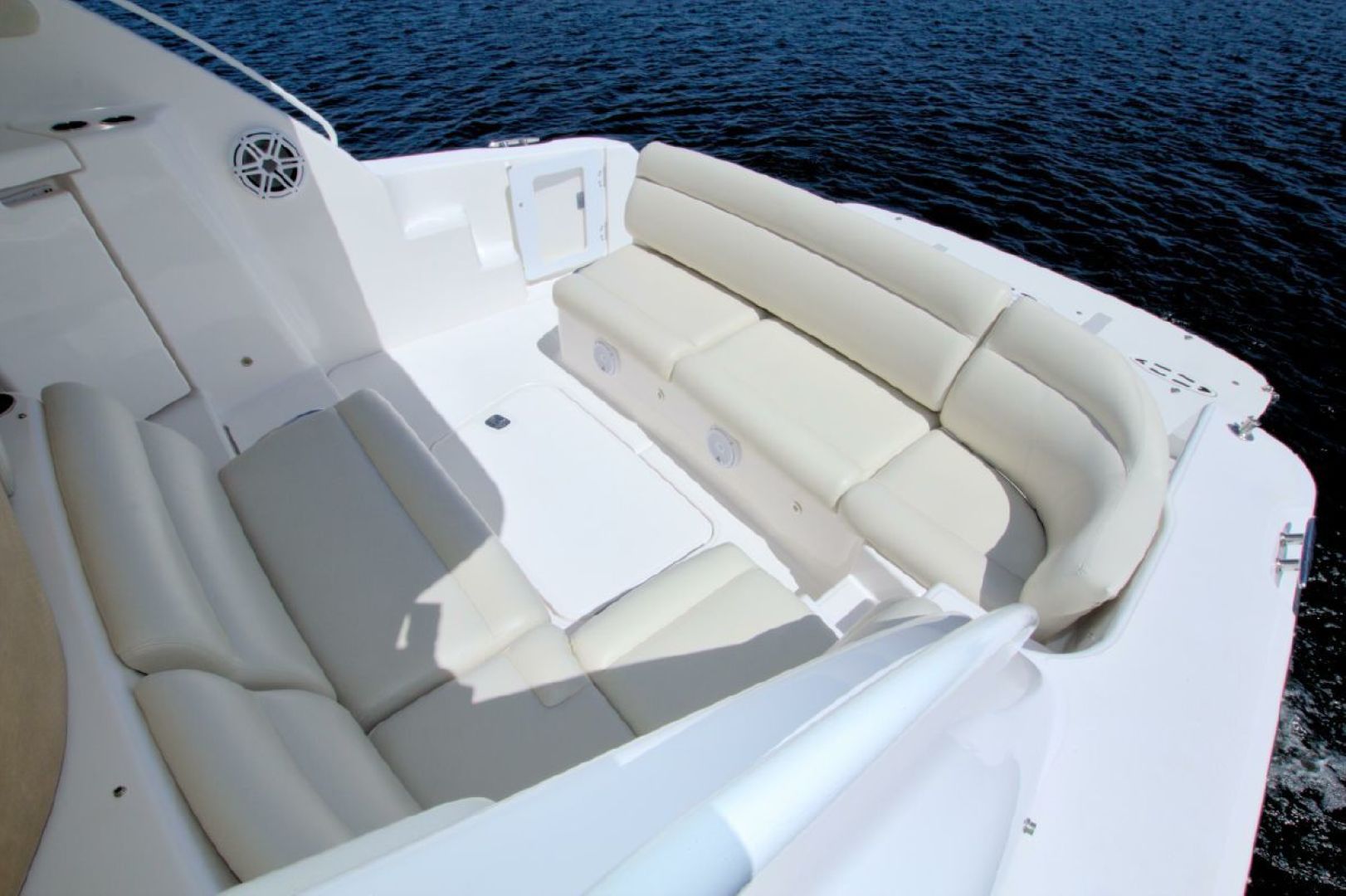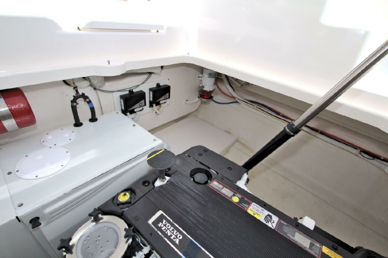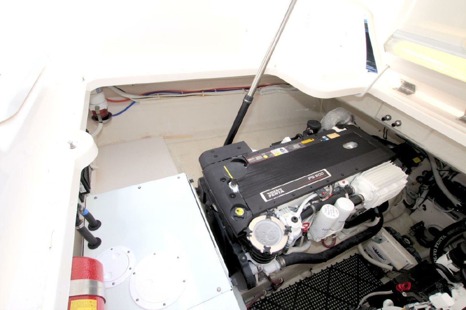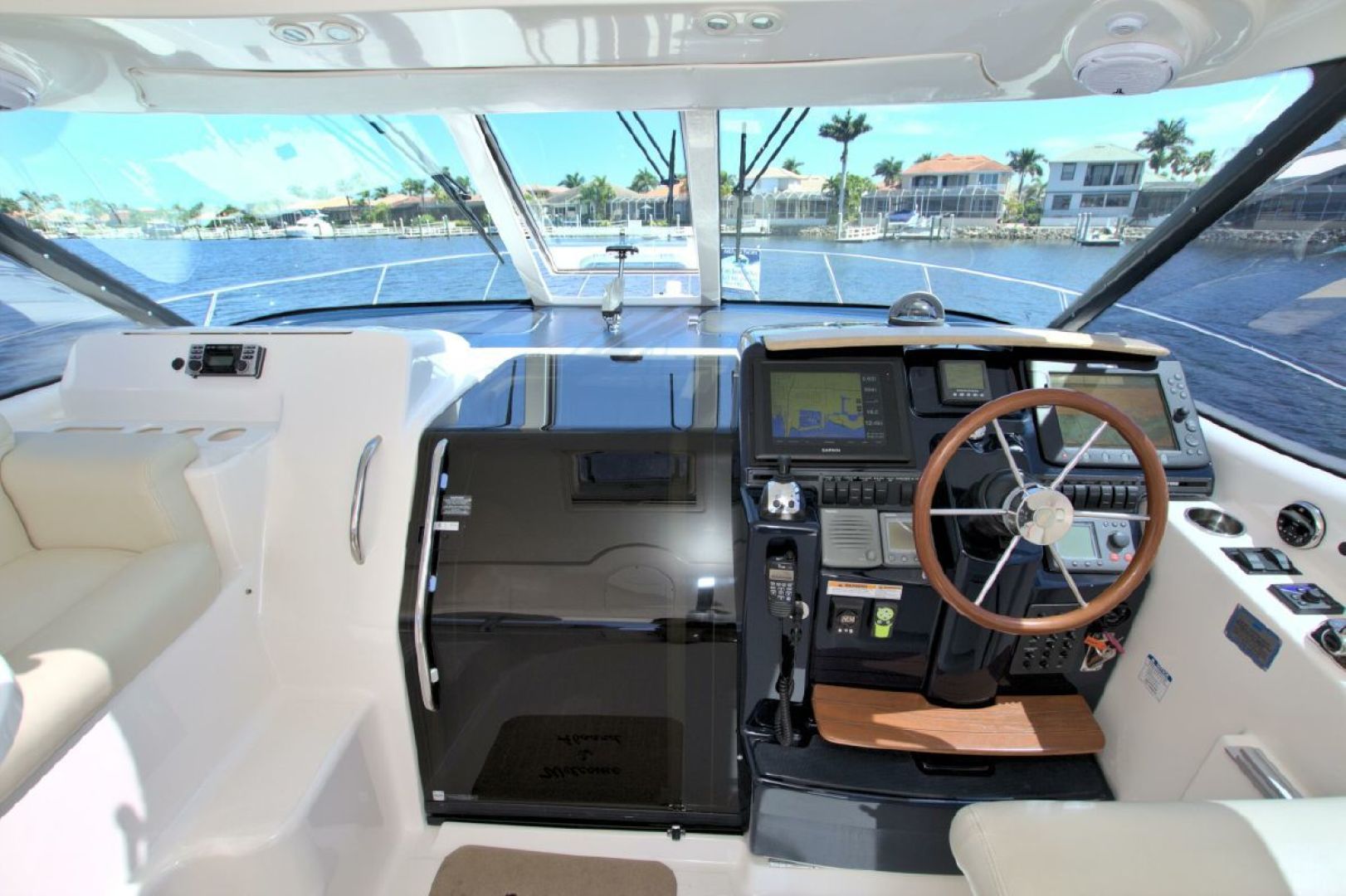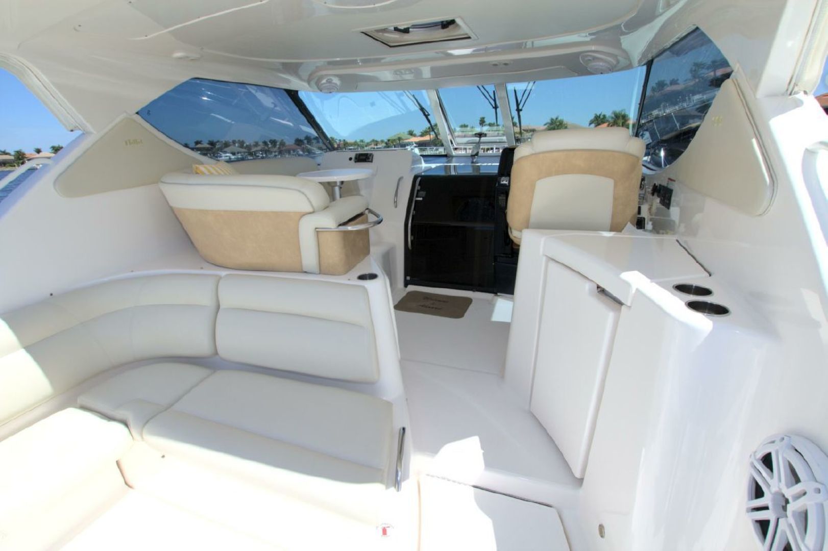 Navigation is made simple with the Garmin 16" touch display and secondary Raymarine E120 plotter. Boat handling is as easy as it gets with the Volvo joystick coupled with the upgraded Volvo 370HP/500 pod drives showing 579 hours. The cockpit is kept cool with 2 Dometic reverse heat/AC systems with new upgraded controls located next to the helm seat!! Cabin climate is also controlled with 2 more Dometic reverse heat/AC systems.