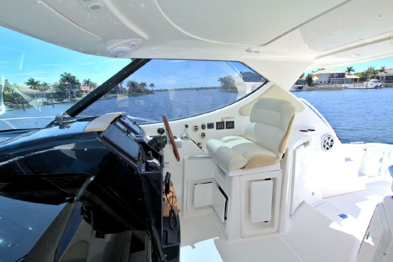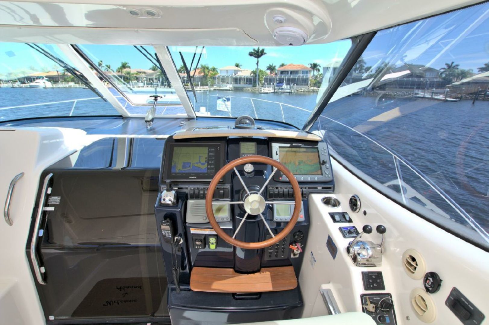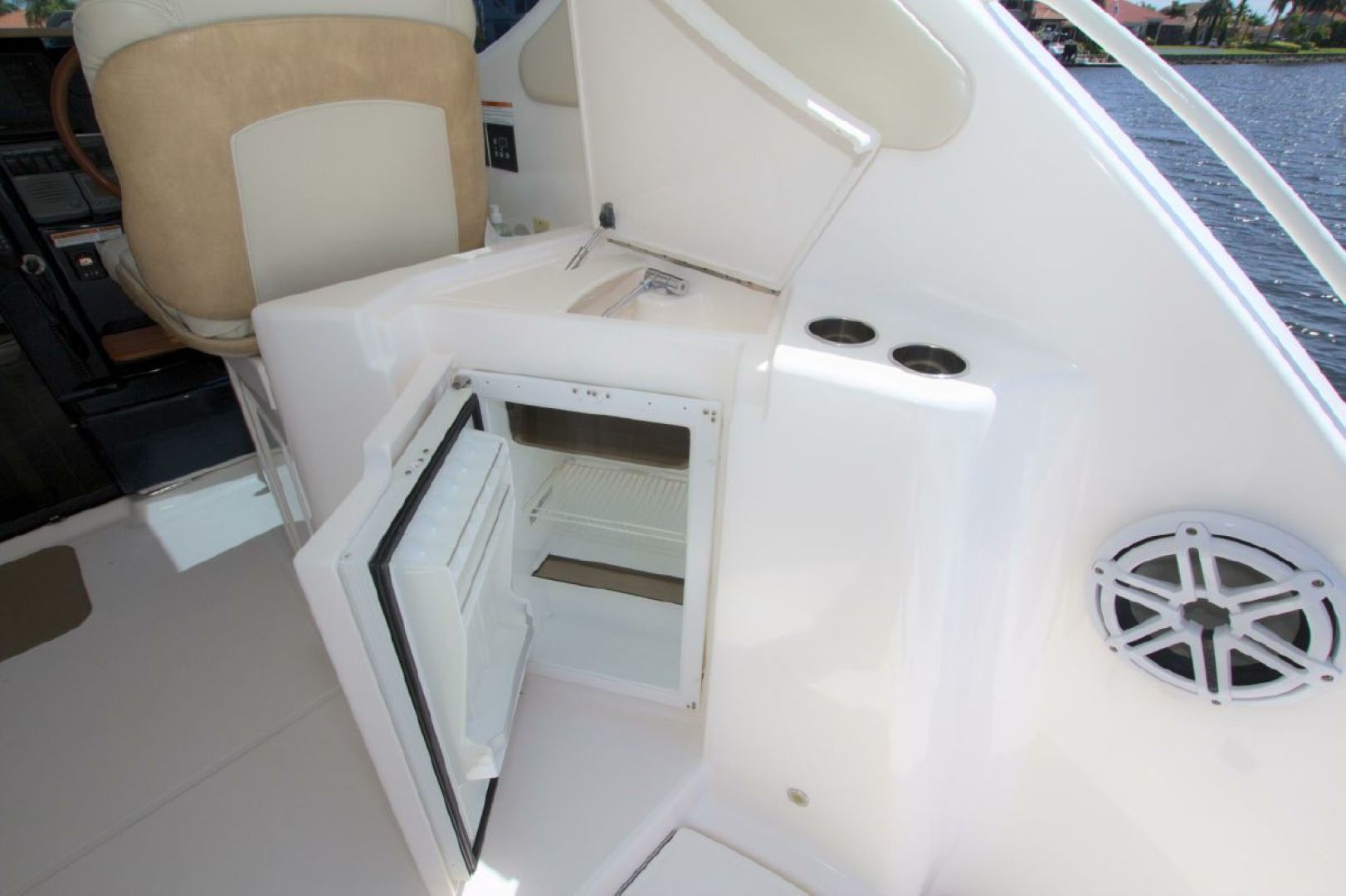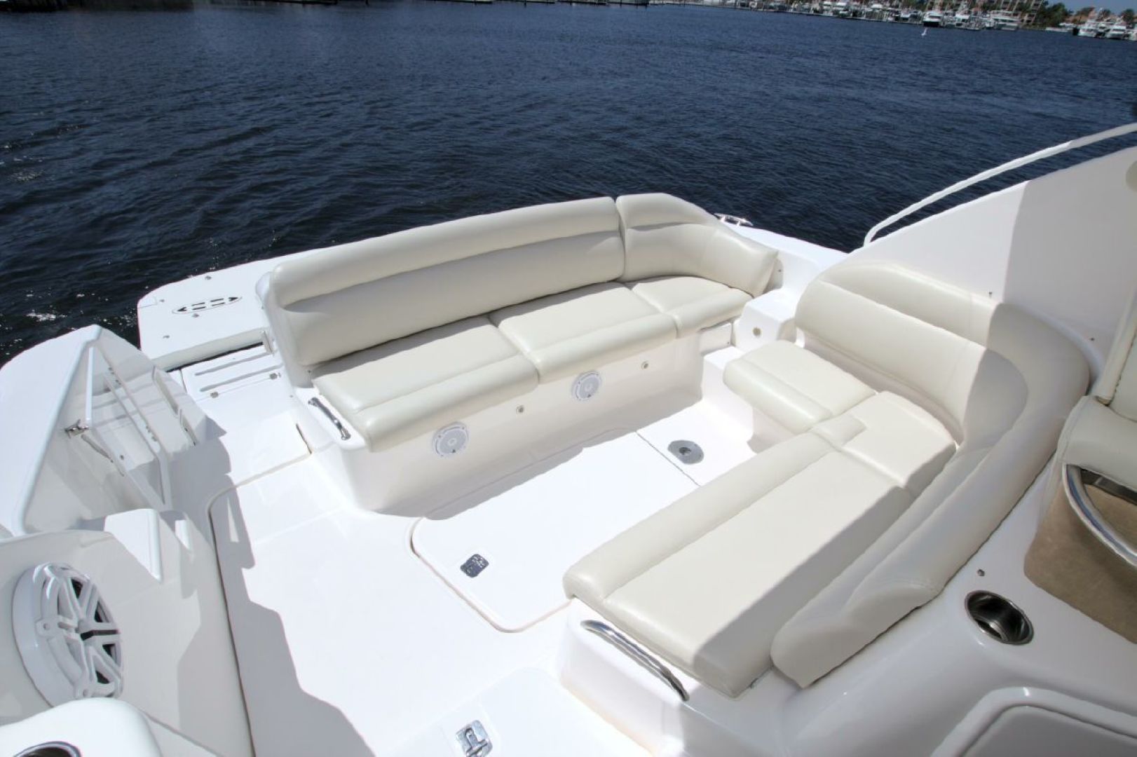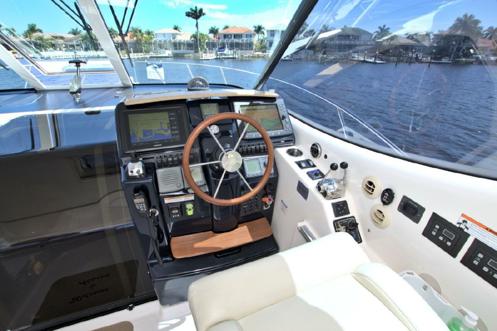 Navigation is made simple with the Garmin 16" touch display and secondary Raymarine E120 plotter. Boat handling is as easy as it gets with the Volvo joystick coupled with the upgraded Volvo 370HP/500 pod drives showing 579 hours. The cockpit is kept cool with 2 Dometic reverse heat/AC systems with new upgraded controls located next to the helm seat!! Cabin climate is also controlled with 2 more Dometic reverse heat/AC systems.