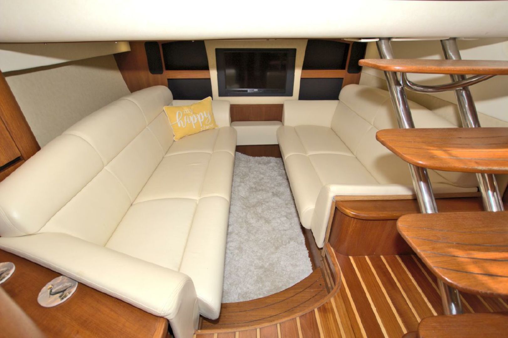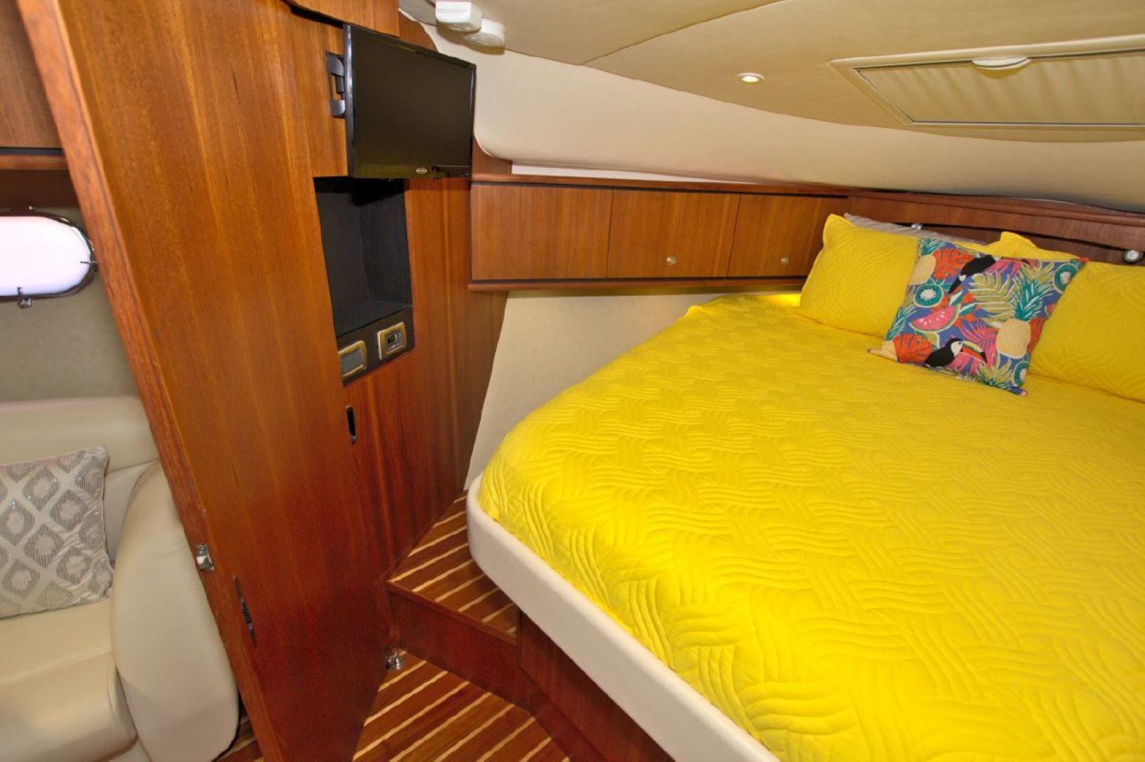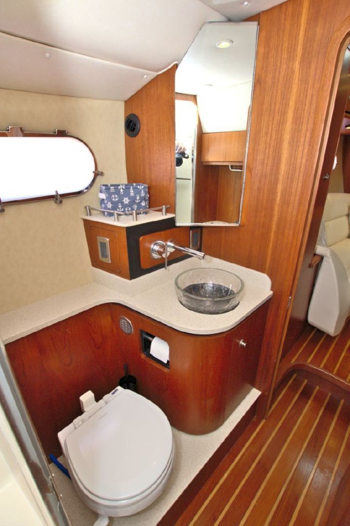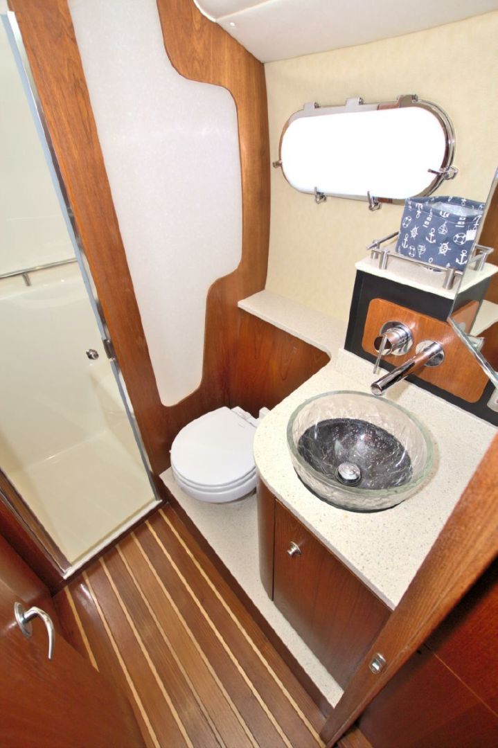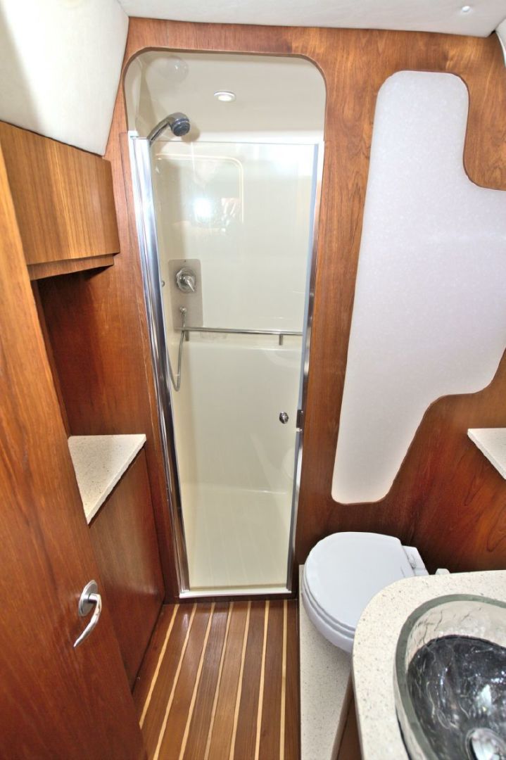 The accommodations level is a very inviting, open concept area. There are double sliding doors that open or close the master stateroom from the rest of the boat when privacy is desired or you wish to view the new flat screen TV while someone watches a different program in the salon. There is a sofa with table on the port side across from the galley. Aft of the galley is a sunken seating area that serves as the media area with a new flat screen TV and surround sound. Should you require more sleeping area, the owner has had custom cushions made to fill in the seating area creating a large bed for 2! The lower level is served with a head with separate shower stall. All areas located below are in the same PRISTINE condition as the rest of the boat!