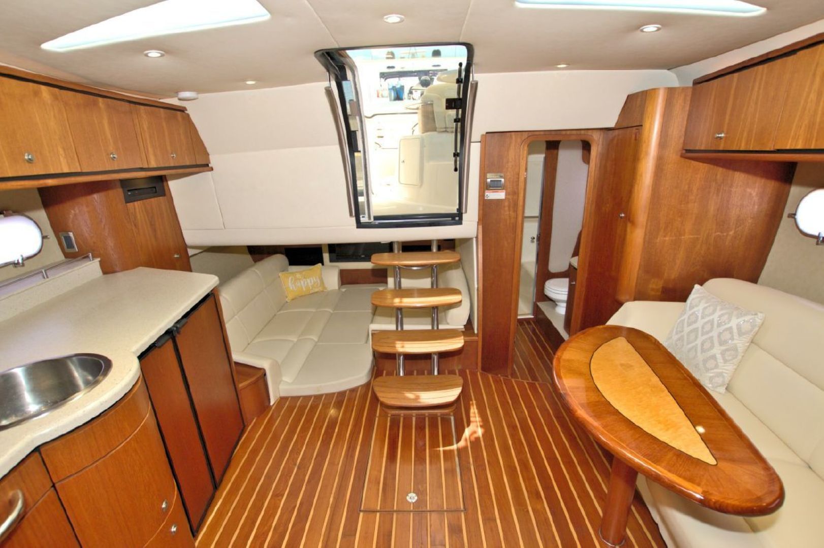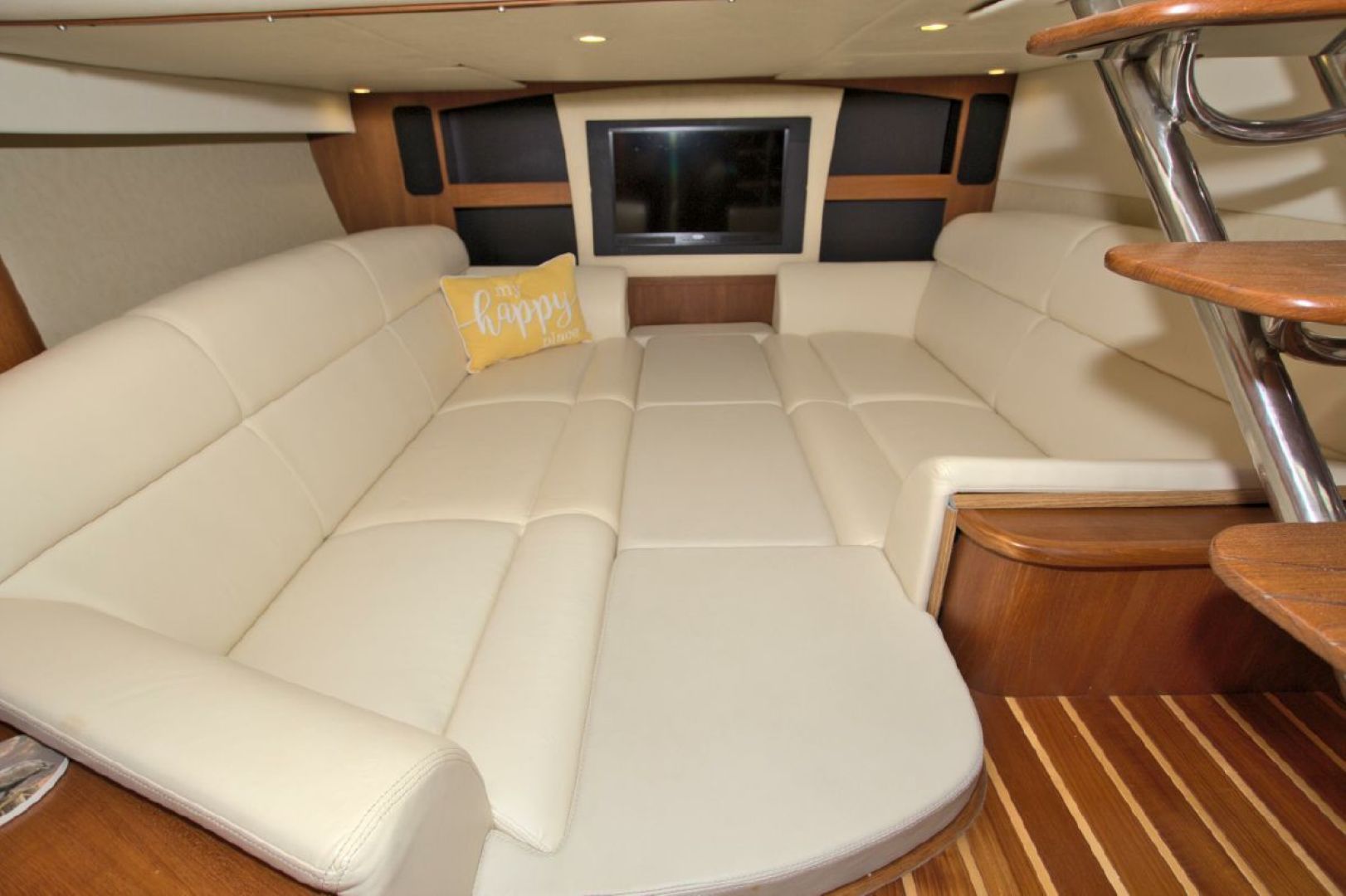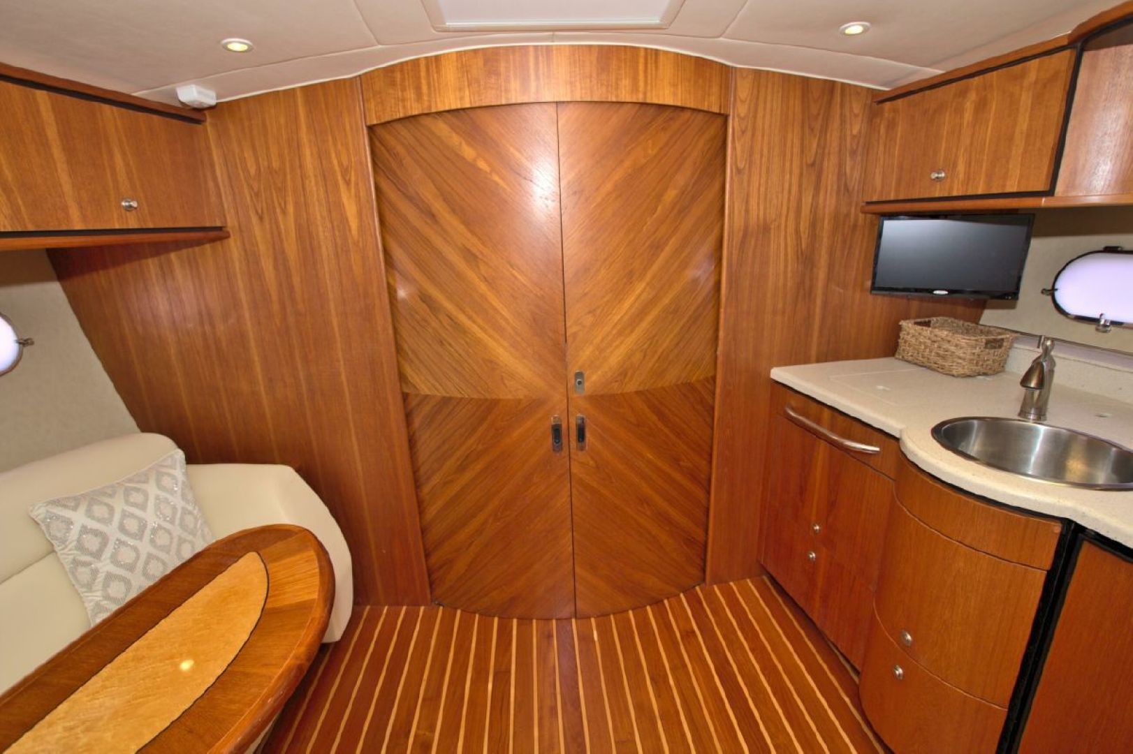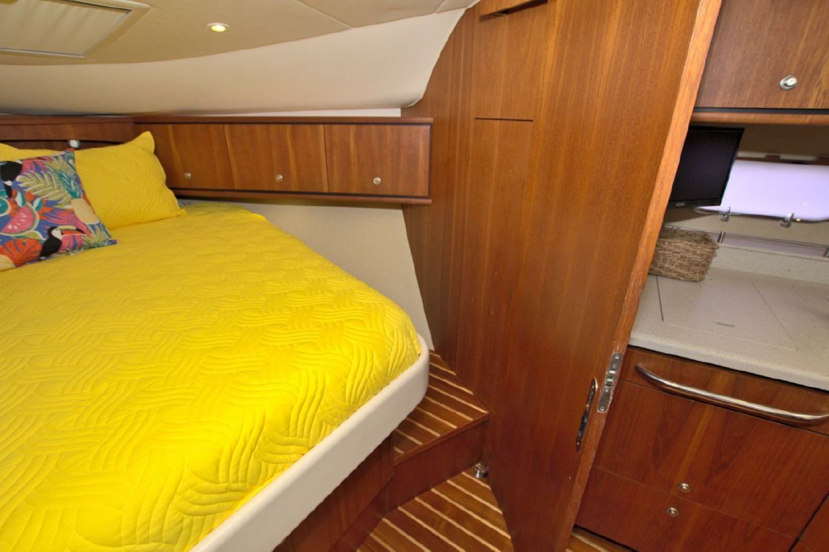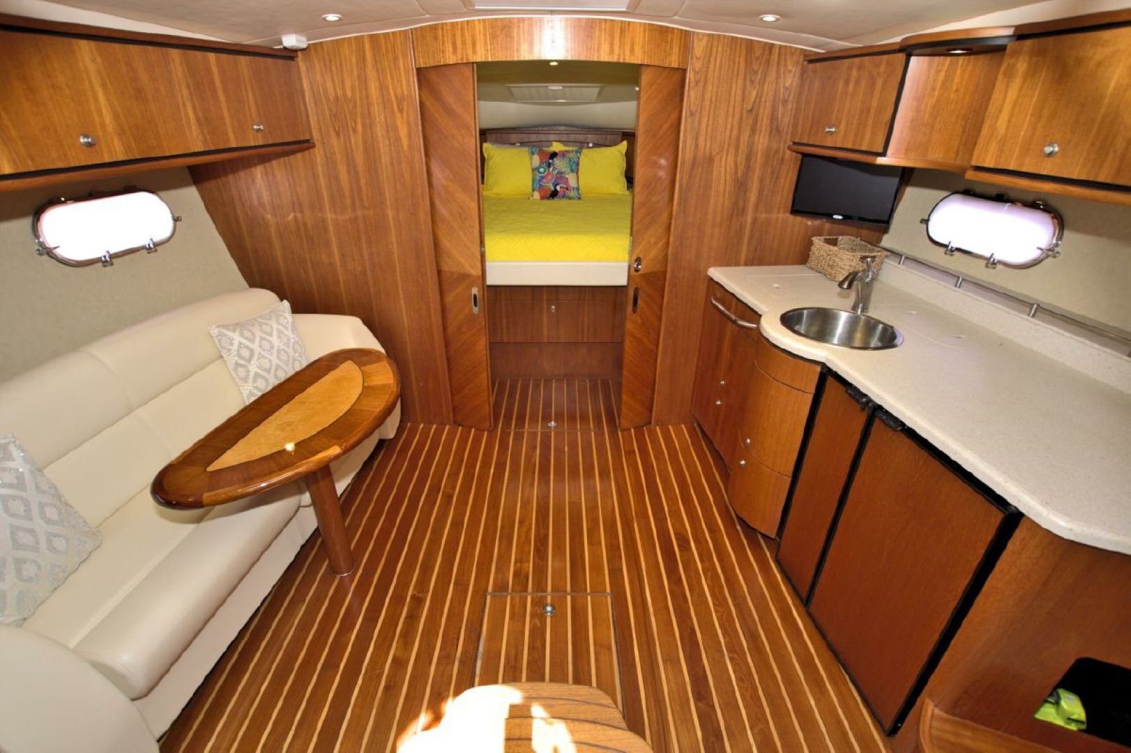 The accommodations level is a very inviting, open concept area. There are double sliding doors that open or close the master stateroom from the rest of the boat when privacy is desired or you wish to view the new flat screen TV while someone watches a different program in the salon. There is a sofa with table on the port side across from the galley. Aft of the galley is a sunken seating area that serves as the media area with a new flat screen TV and surround sound. Should you require more sleeping area, the owner has had custom cushions made to fill in the seating area creating a large bed for 2! The lower level is served with a head with separate shower stall. All areas located below are in the same PRISTINE condition as the rest of the boat!