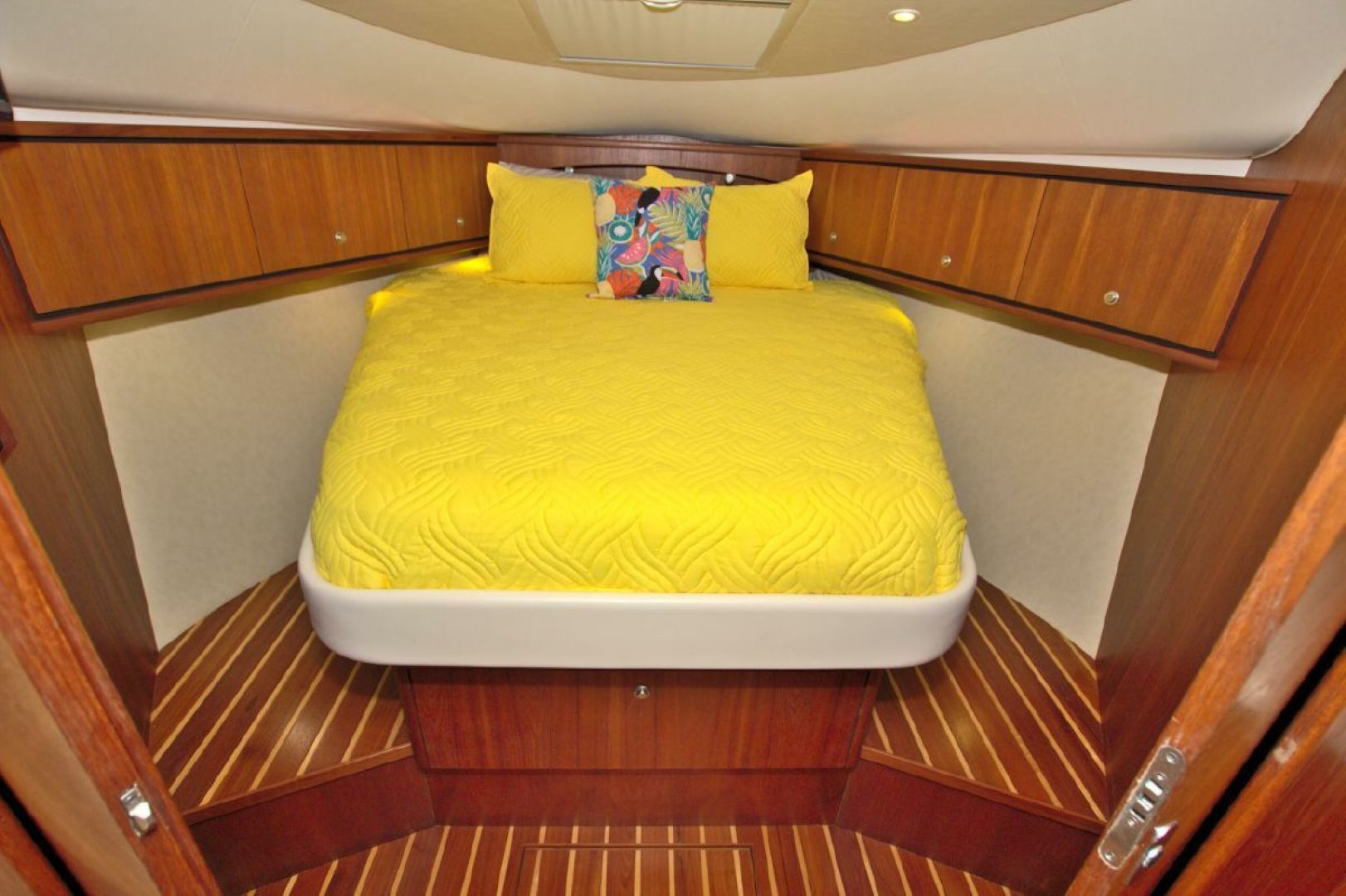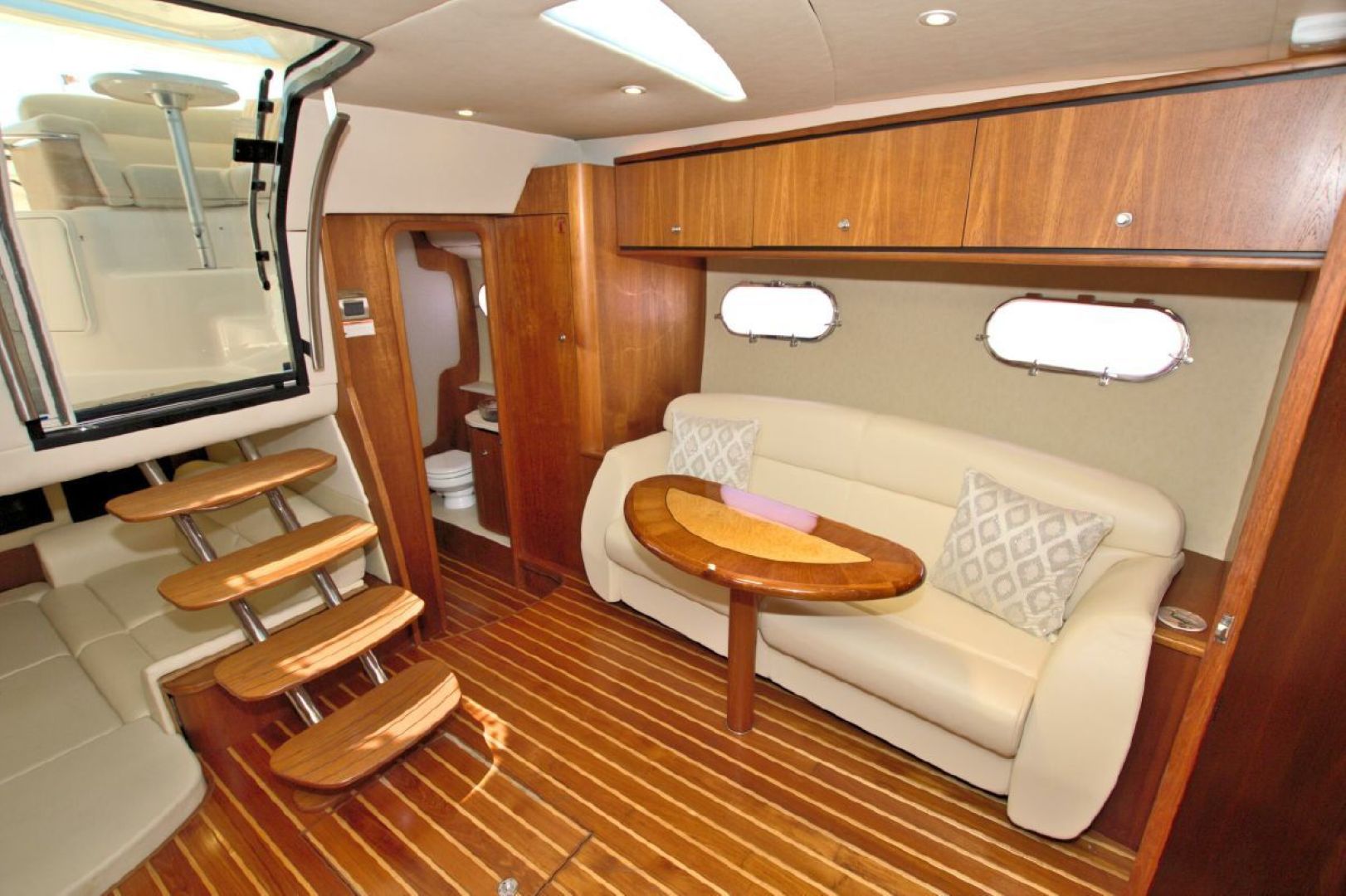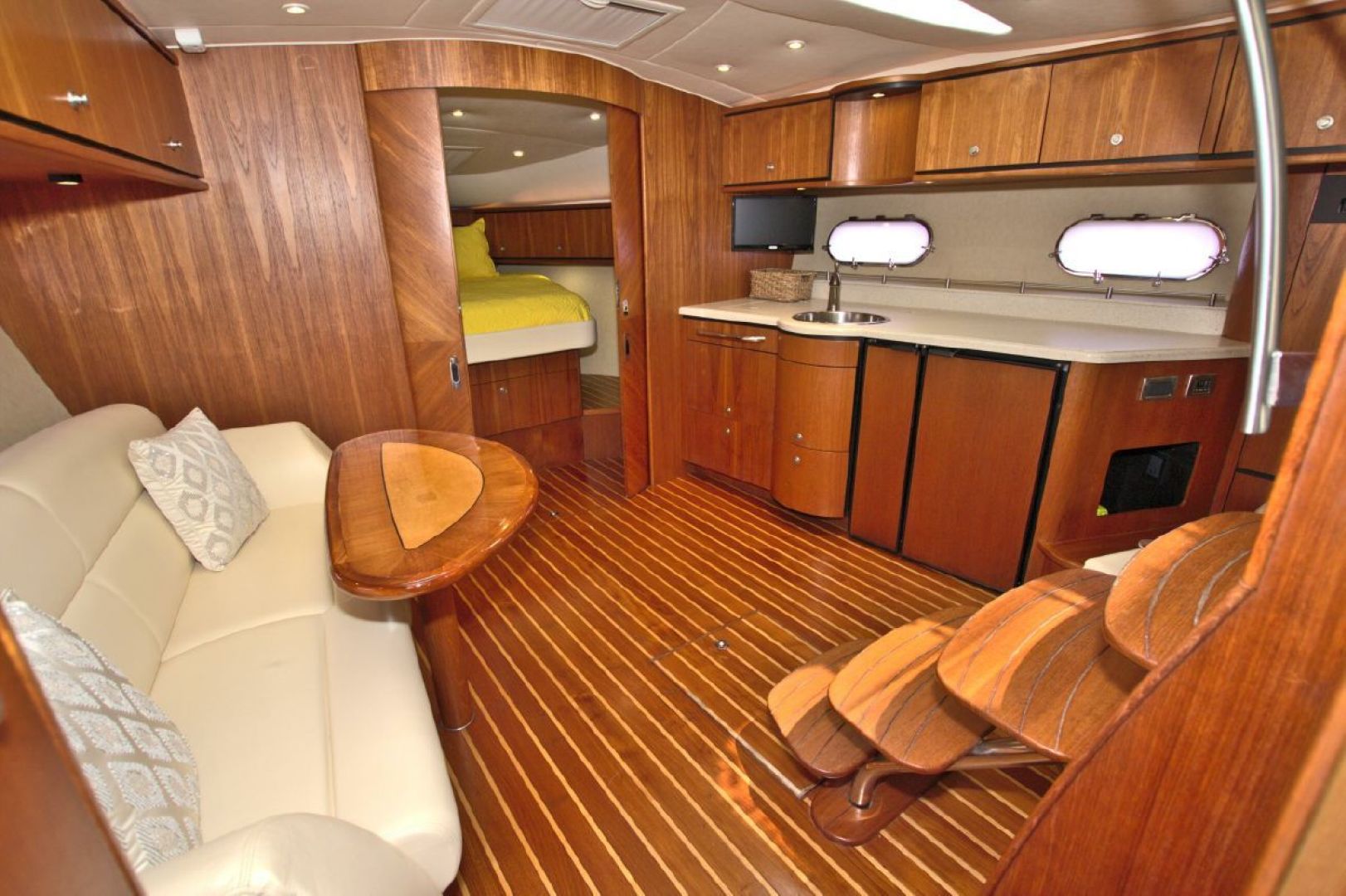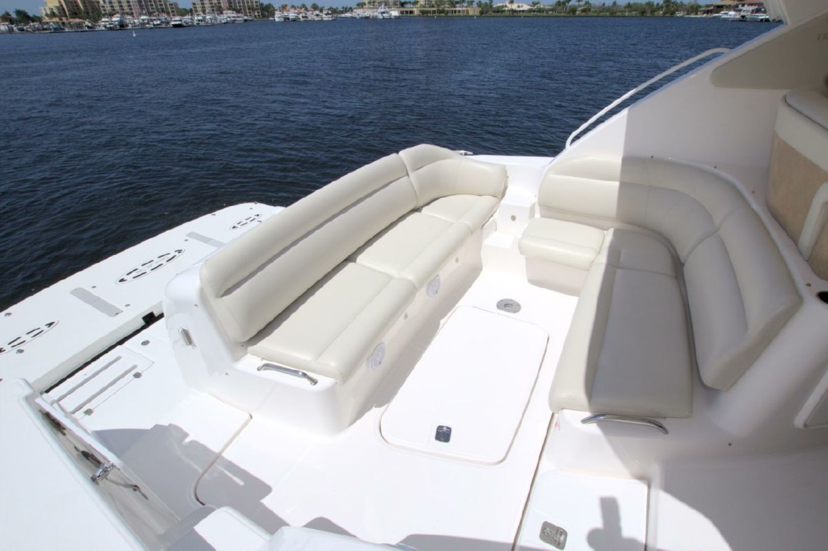 The accommodations level is a very inviting, open concept area. There are double sliding doors that open or close the master stateroom from the rest of the boat when privacy is desired or you wish to view the new flat screen TV while someone watches a different program in the salon. There is a sofa with table on the port side across from the galley. Aft of the galley is a sunken seating area that serves as the media area with a new flat screen TV and surround sound. Should you require more sleeping area, the owner has had custom cushions made to fill in the seating area creating a large bed for 2! The lower level is served with a head with separate shower stall. All areas located below are in the same PRISTINE condition as the rest of the boat!