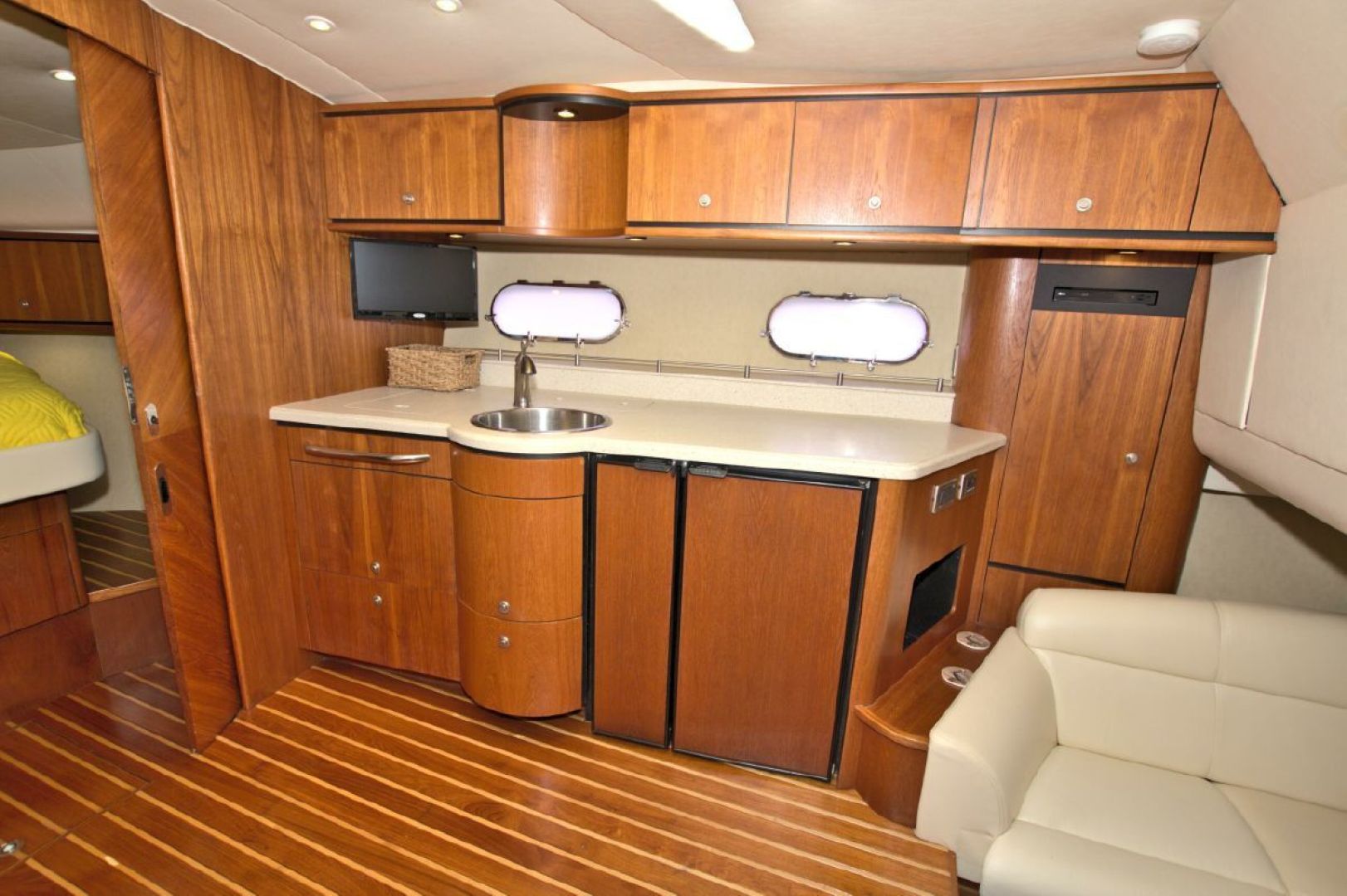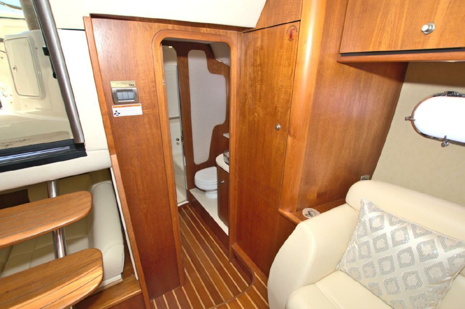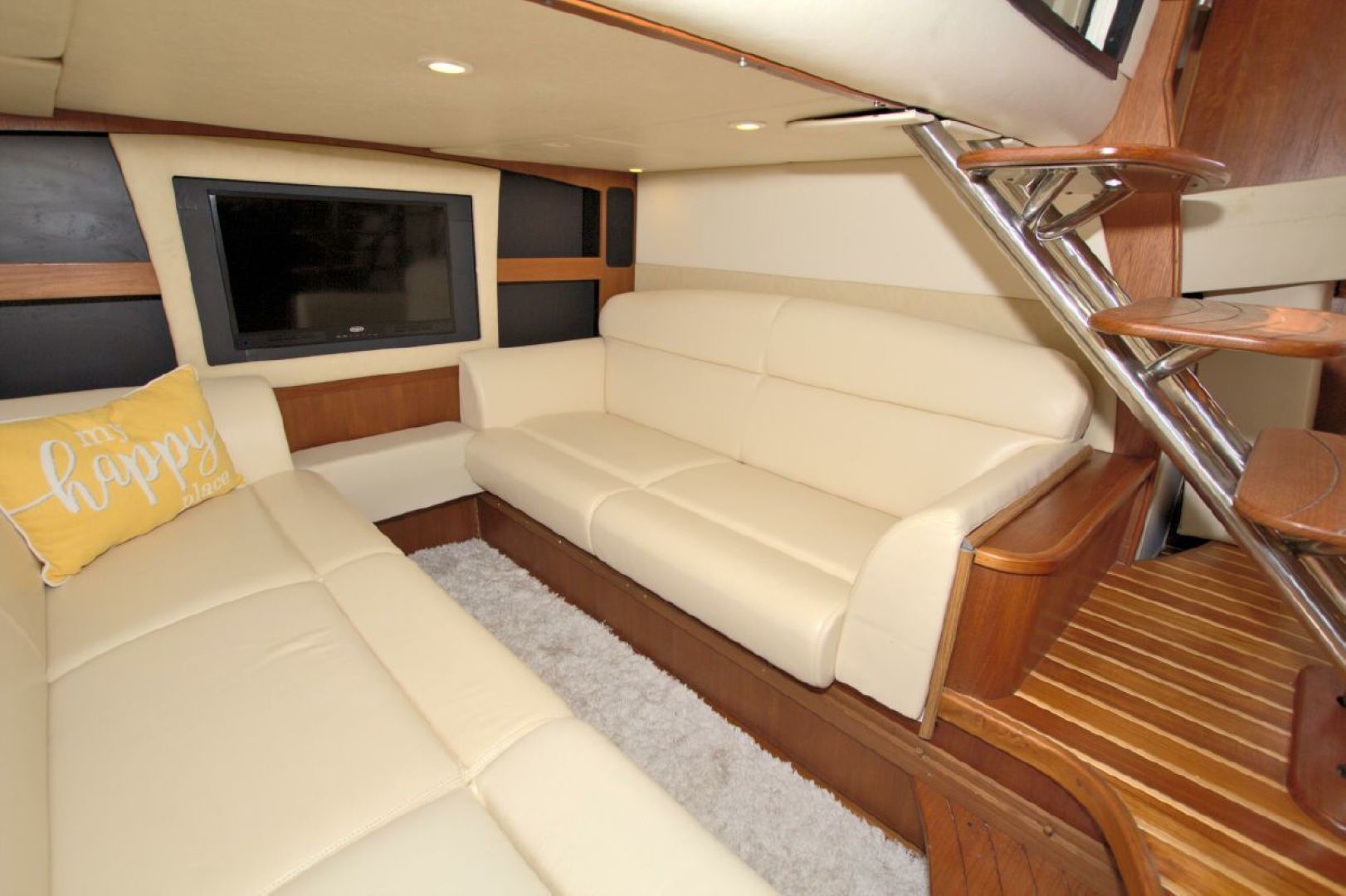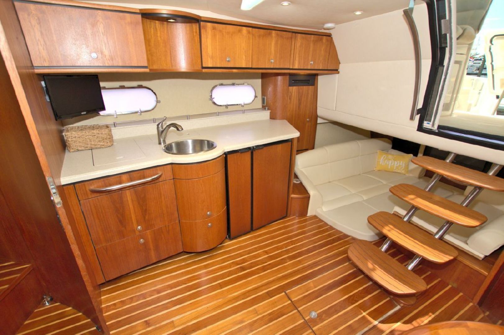 The accommodations level is a very inviting, open concept area. There are double sliding doors that open or close the master stateroom from the rest of the boat when privacy is desired or you wish to view the new flat screen TV while someone watches a different program in the salon. There is a sofa with table on the port side across from the galley. Aft of the galley is a sunken seating area that serves as the media area with a new flat screen TV and surround sound. Should you require more sleeping area, the owner has had custom cushions made to fill in the seating area creating a large bed for 2! The lower level is served with a head with separate shower stall. All areas located below are in the same PRISTINE condition as the rest of the boat!