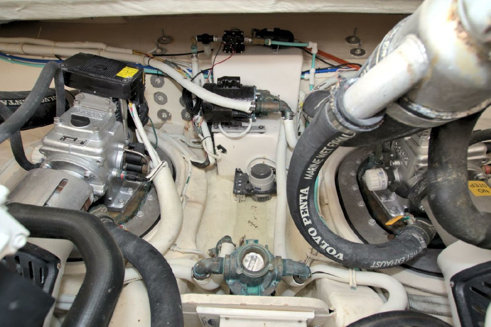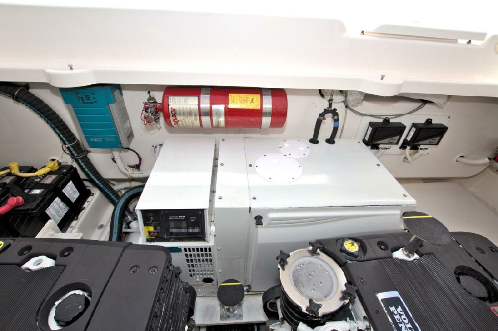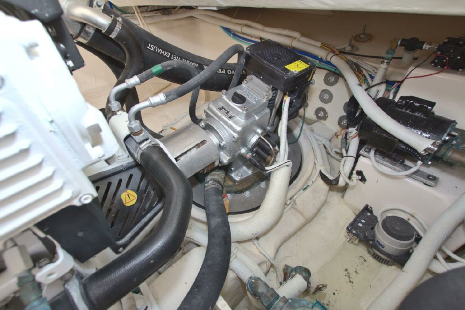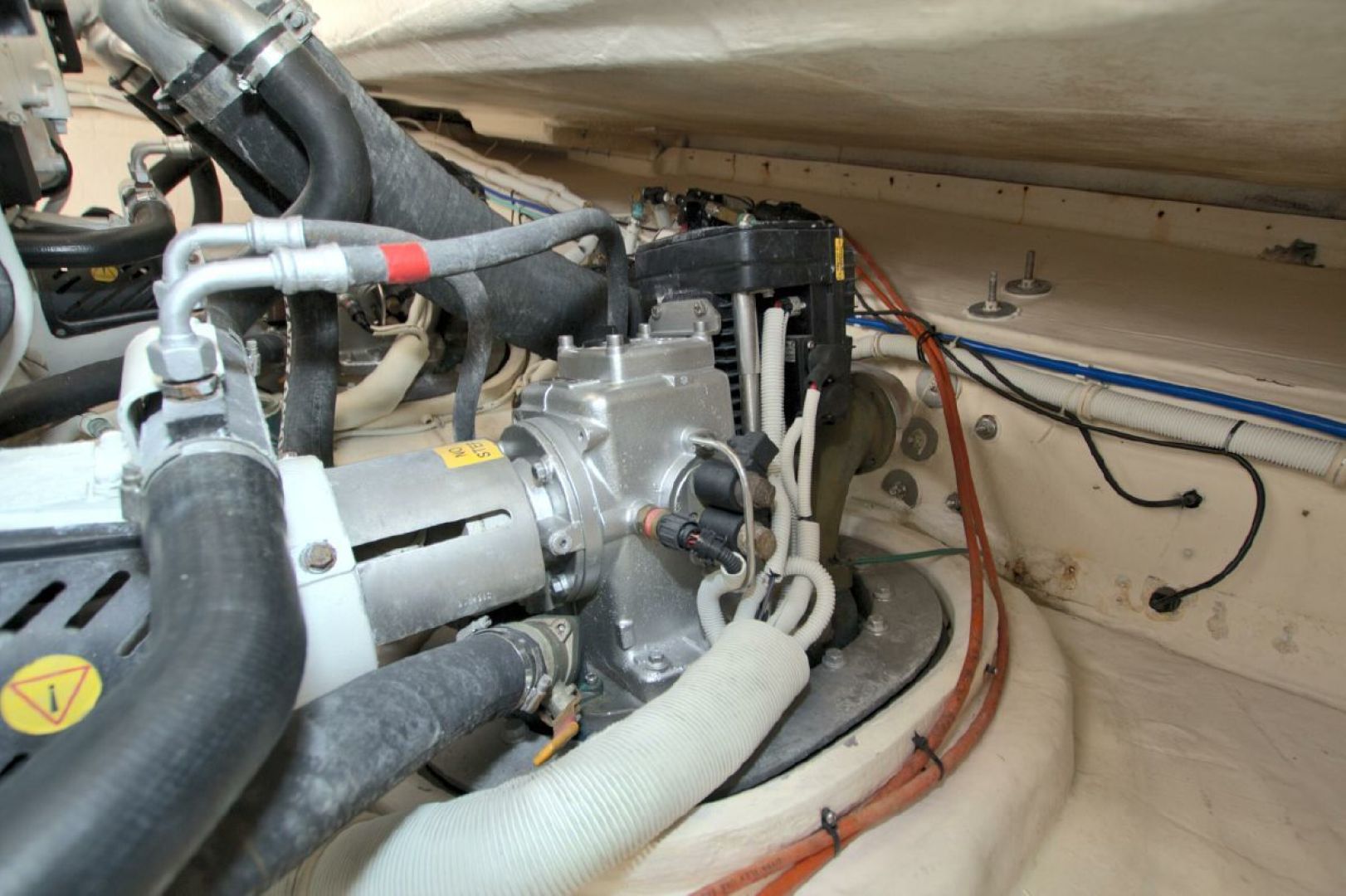 When you are a way from the dock, shore power is provided by the fully serviced 13.5KW Onan generator with 1064 hours on it. This unit is located in the engine/machinery area located under the massive, hydraulically raised floor in the aft area of the boat. Your mechanic will love you when he sees the condition of this area!!! It has been completely detailed and painted (cleaned with a toothbrush!!!) and offers excellent access to all critical systems and maintenance/service points.