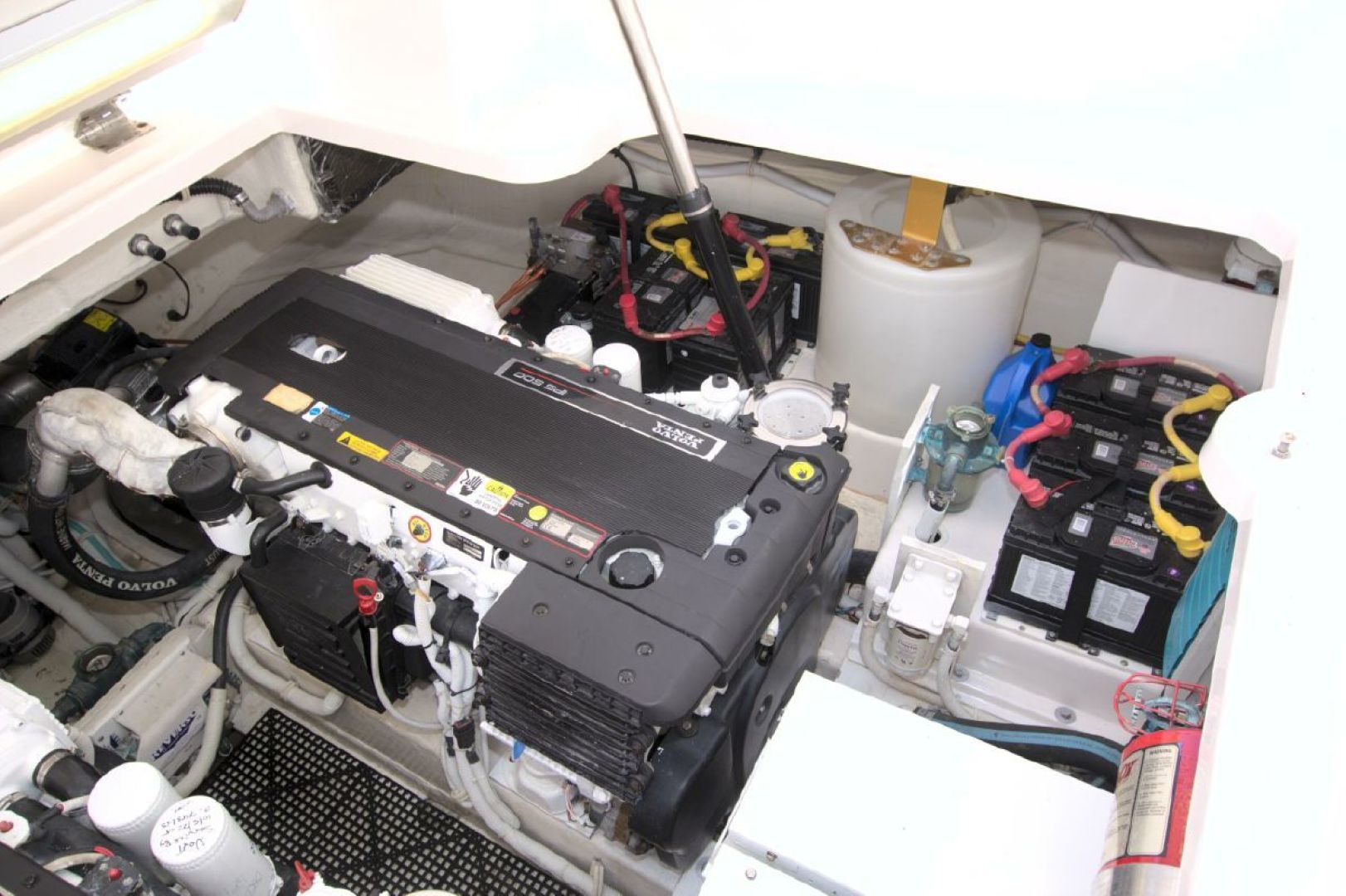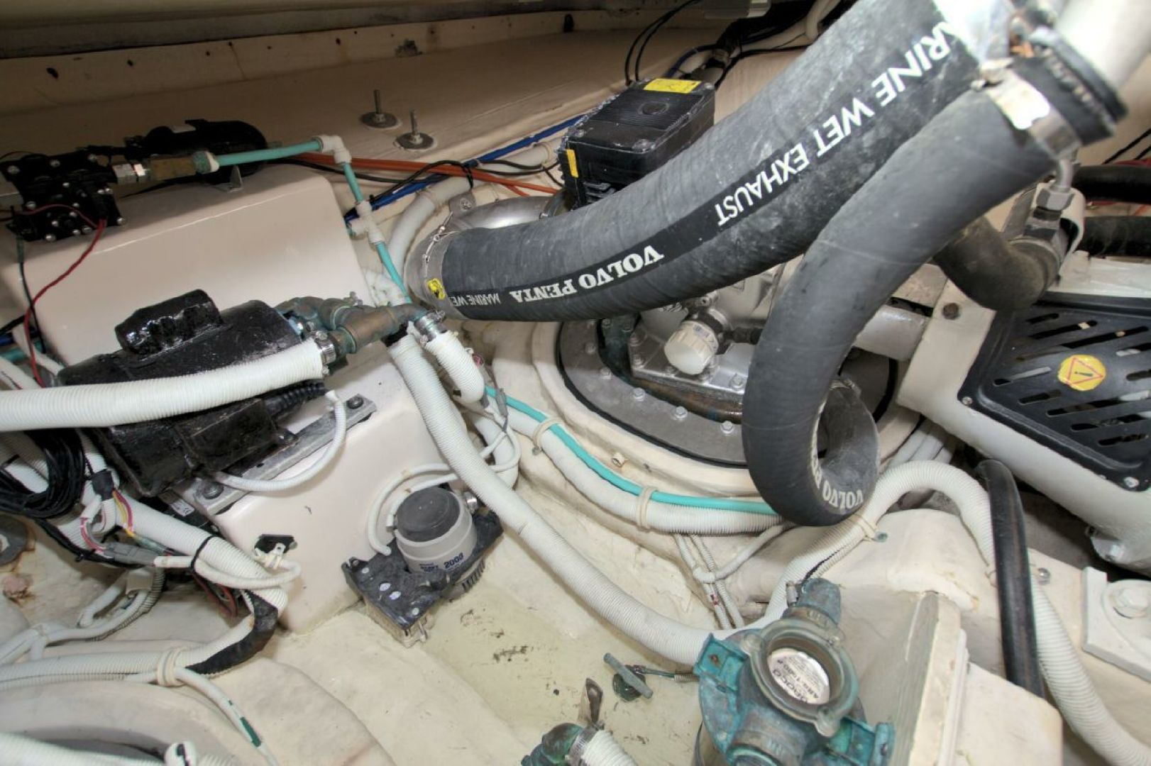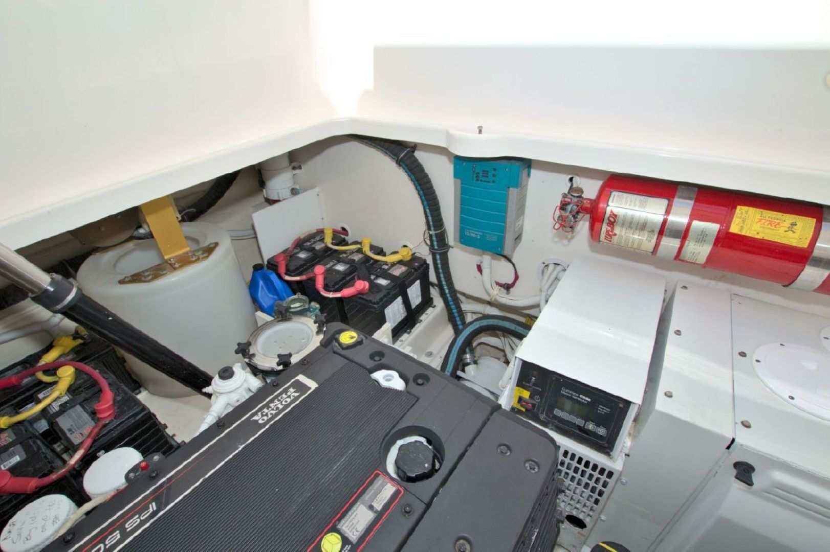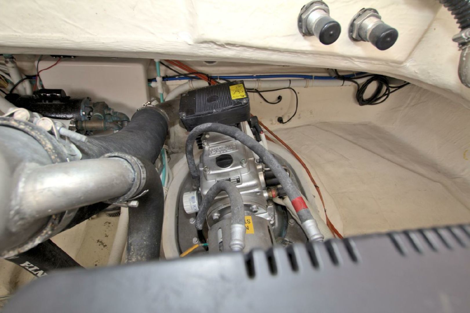 When you are a way from the dock, shore power is provided by the fully serviced 13.5KW Onan generator with 1064 hours on it. This unit is located in the engine/machinery area located under the massive, hydraulically raised floor in the aft area of the boat. Your mechanic will love you when he sees the condition of this area!!! It has been completely detailed and painted (cleaned with a toothbrush!!!) and offers excellent access to all critical systems and maintenance/service points.