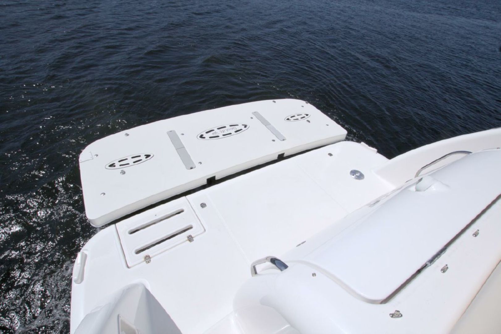 The aft deck/lounge area is serviced by a cockpit refrigerator and Clarion stereo system. This boat also comes with the optional hydraulic swim platform that accommodates the included 10'5" 2012 West Marine tender with 15HP 4 stroke Mercury outboard motor. This is also controlled by a wireless remote that allows you to raise and lower the platform from the tender!! The 50 amp shore power cord is managed with a Glendinning cable master, again controlled from the swim platform. Finally there is a large storage area for lines, fenders and other needed boating supplies and equipment.