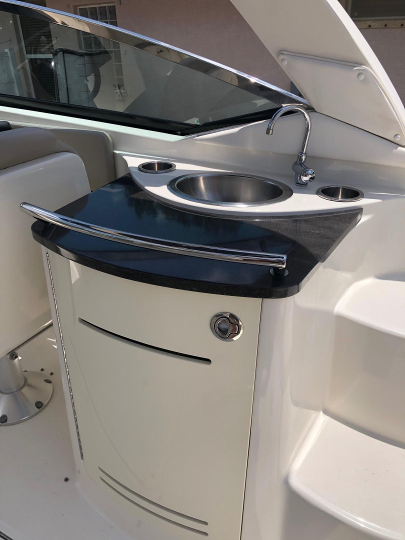 - Wet Bar w/Sink, Faucet, Solid-Surface Countertop, Stainless-Steel Beverage Holders, Stainless-Steel Handrail, & Storage Cabinet w/Trash Receptacle & Storage Below