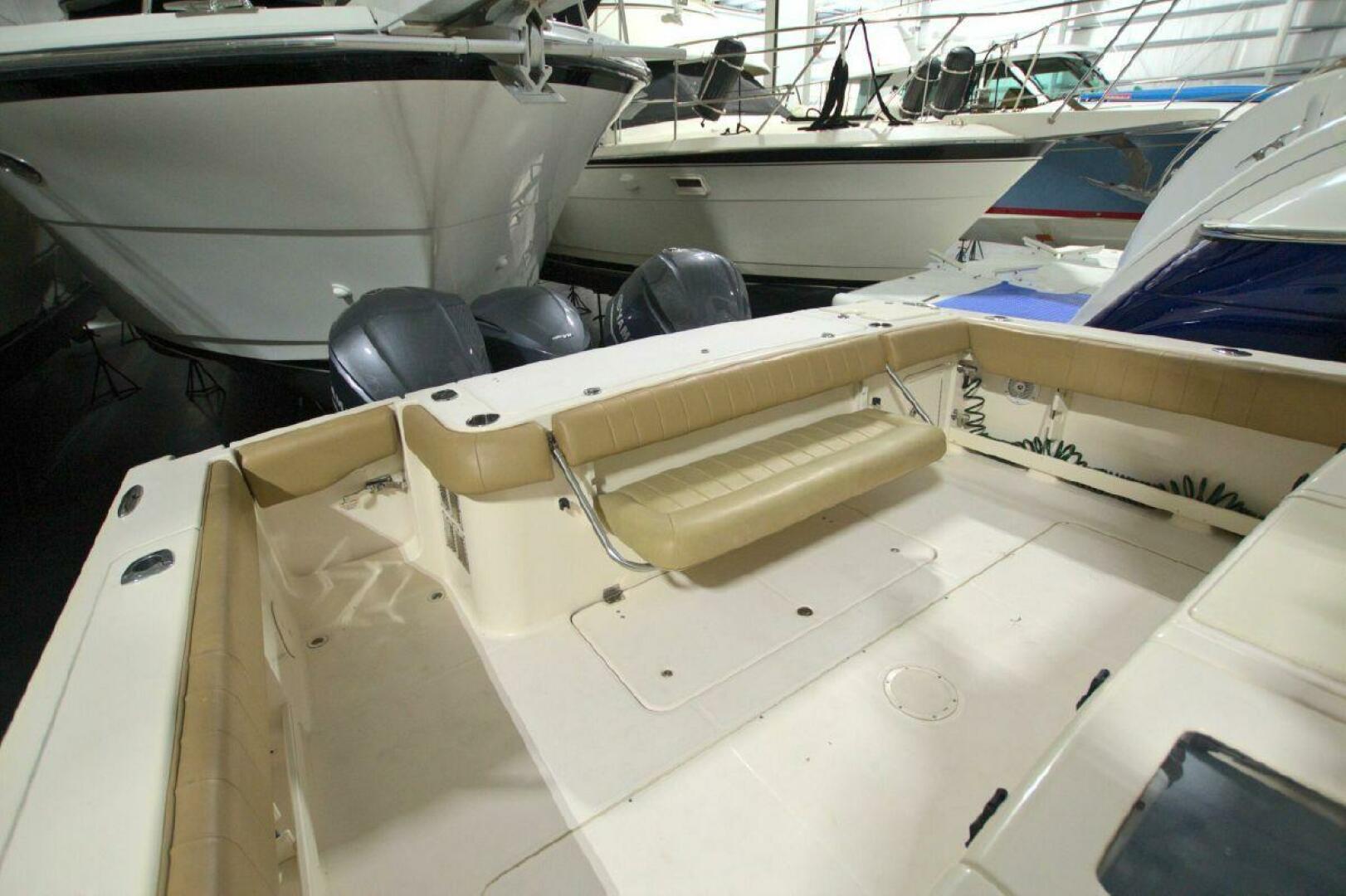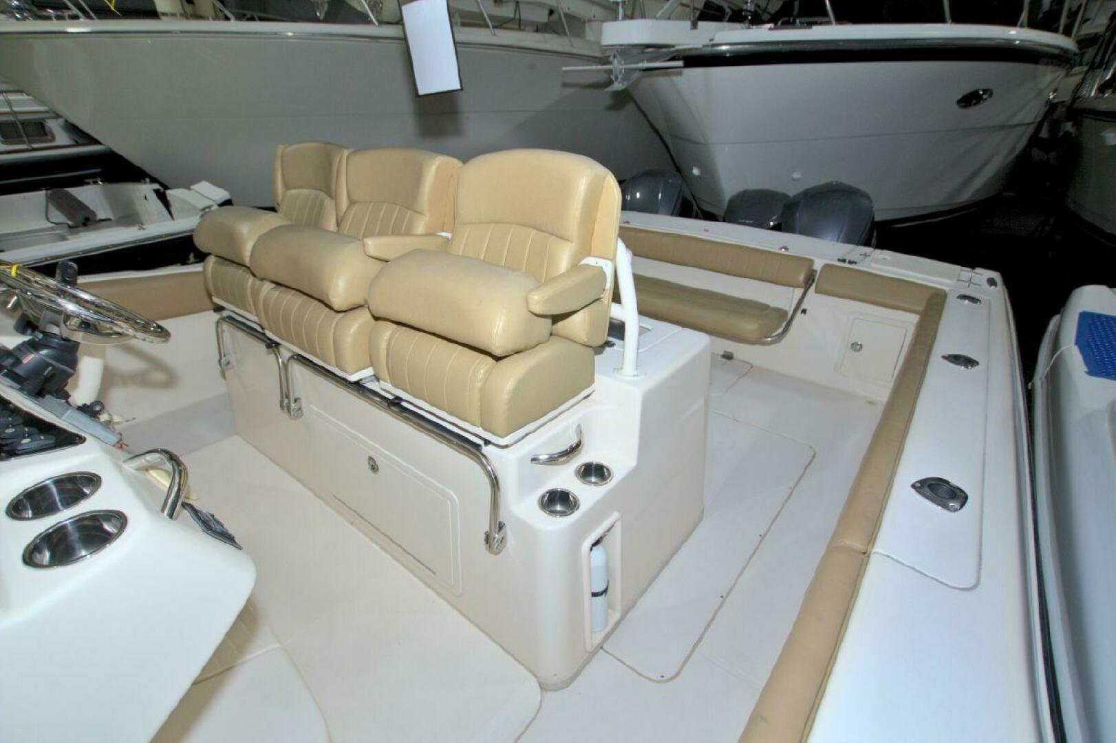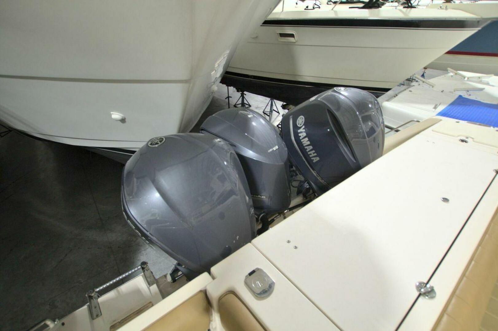 The Ultimate Cruising and Fishing Machine, equipped with a 3kw Diesel Generator, Air-Conditioned console cabin that includes Berth, Head, and additional Storage. Deluxe Leaning Post includes Dual Live Wells, Electric Grill, and Triple Helm Seating. Full Electronics in Pop-Up console with Dual Raymarine Displays, Auto Pilot, Radar, Fish Finder/Bow Thruster. Ample seating at Bow and Transom, Additional Large Transom Fridge/Freezer for Drinks or the Day’s Catch. Triple 350hp Yamaha outboards with less than 280hrs will have you on the Fishing Grounds and Back with a full catch before the heat of the day.
