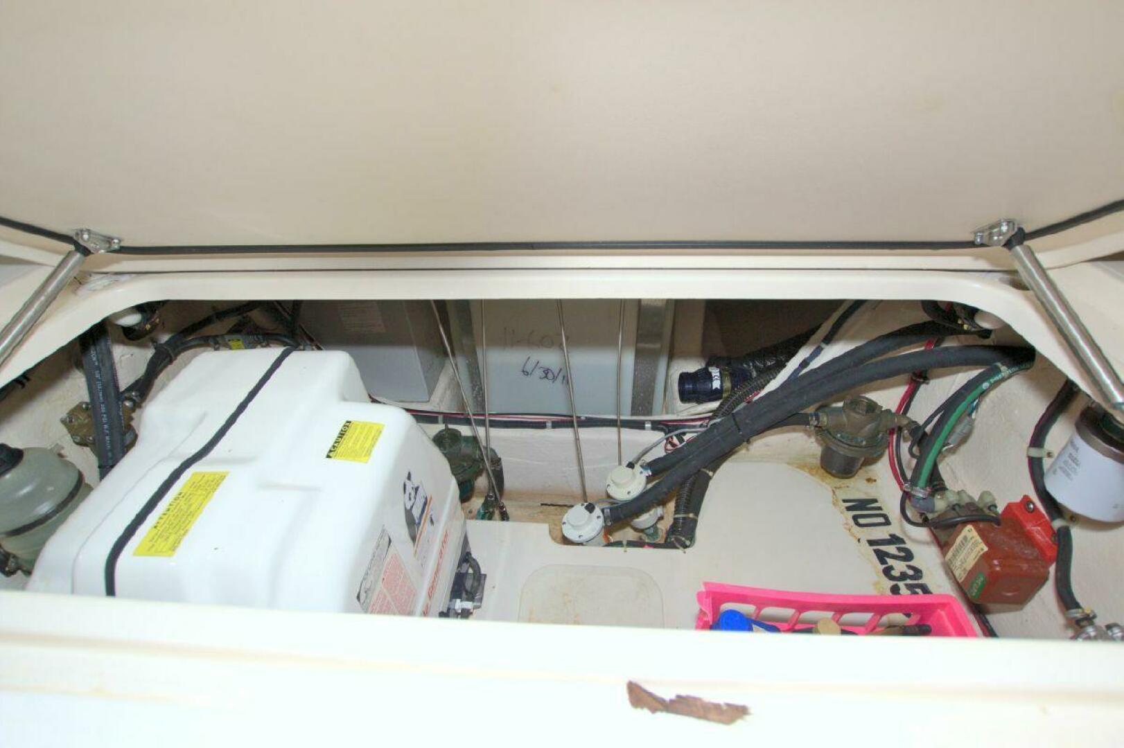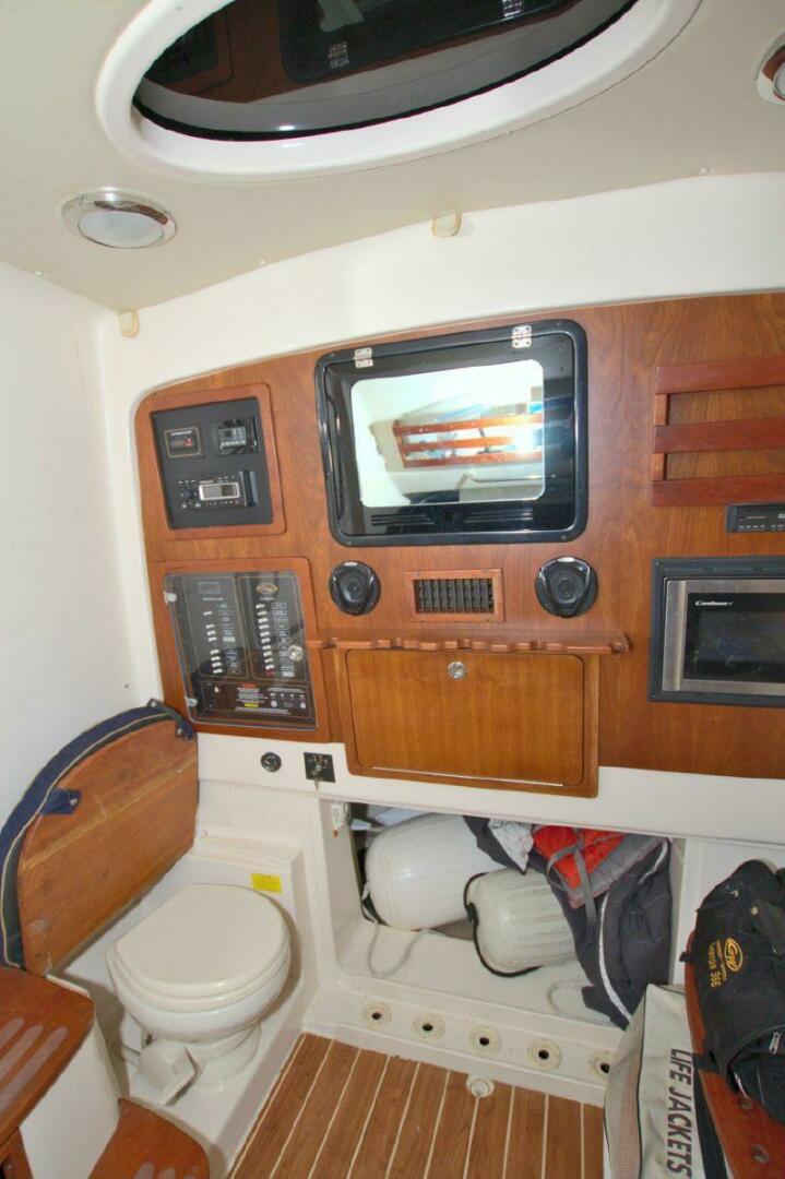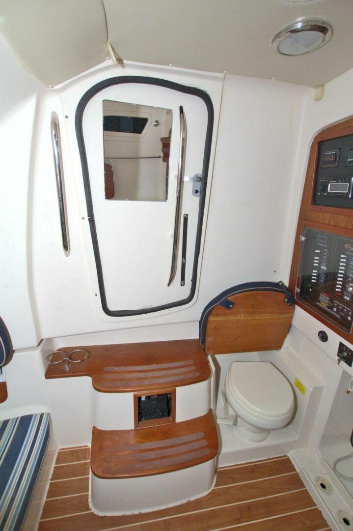 - Head - stand up head area, shower, storage drawer, sink w/Corian counter surface, VacuFlush head w/fold down lid & cushion, 10-gallon holding tank & pump out